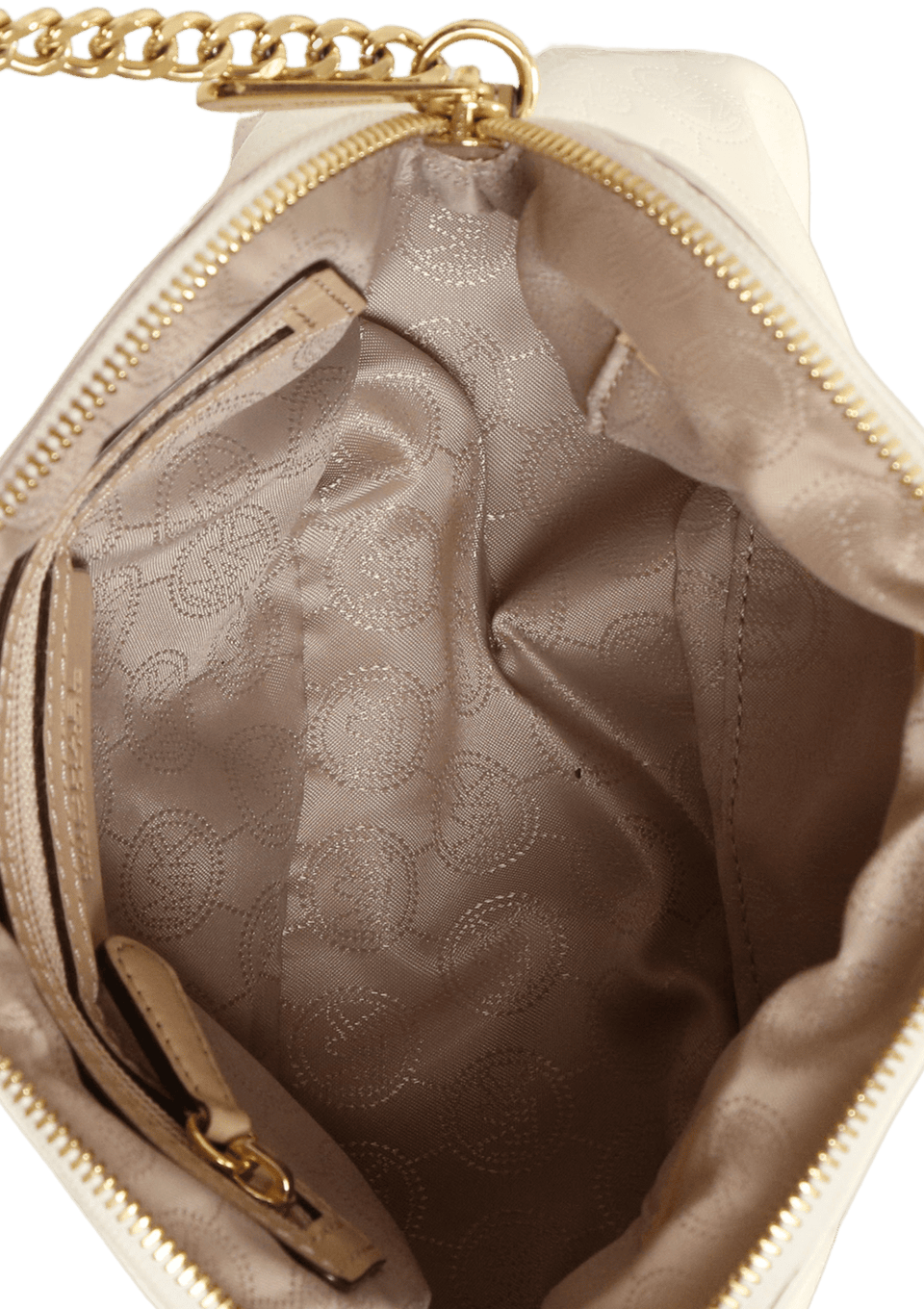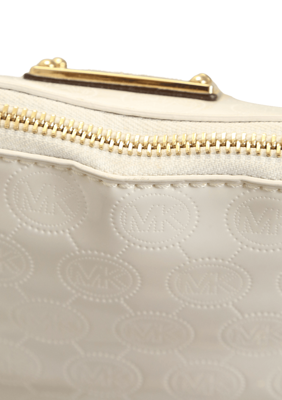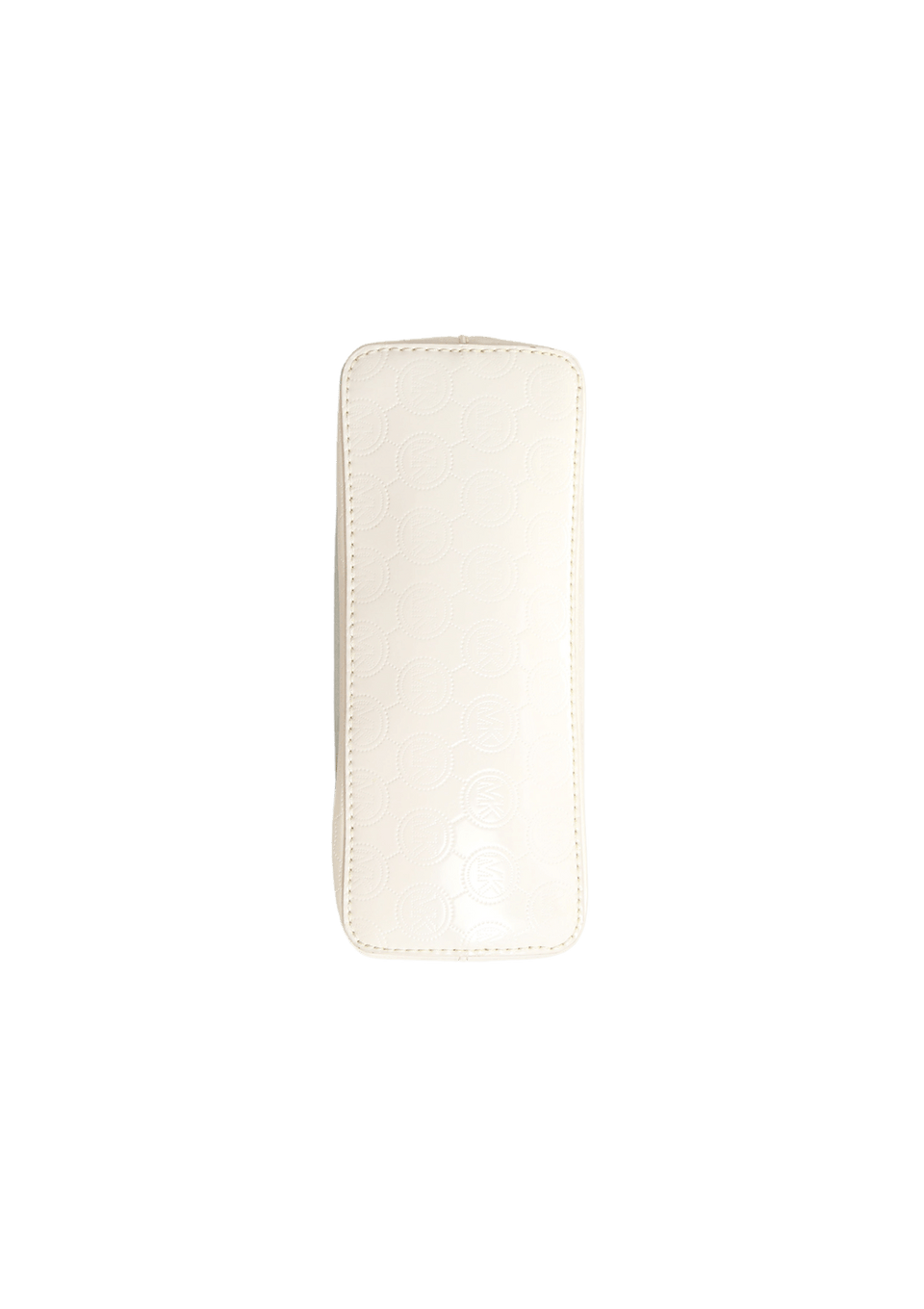 - Couro envernizado branco com padronagem MK e couro bege;