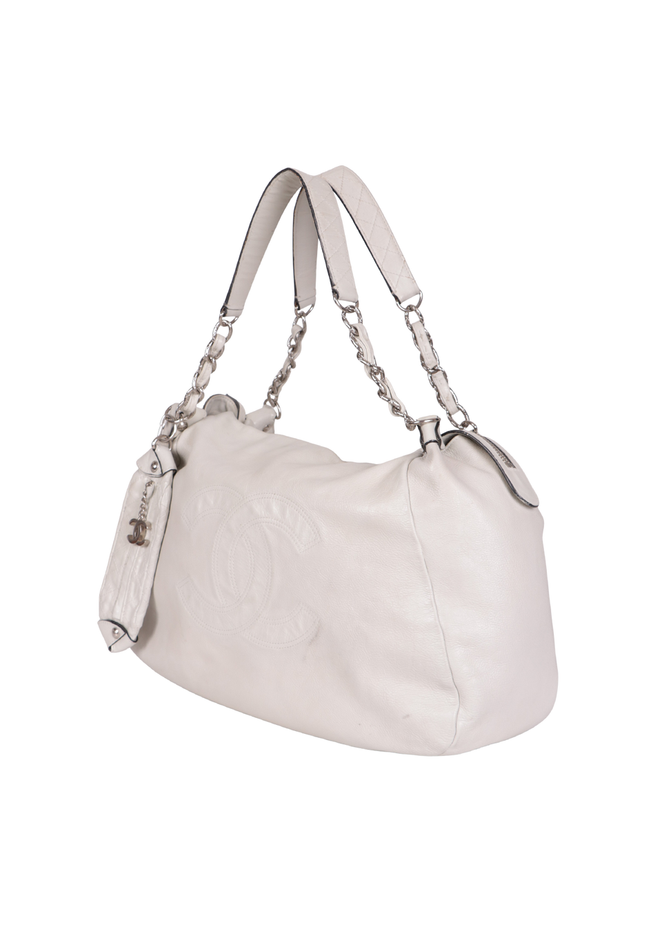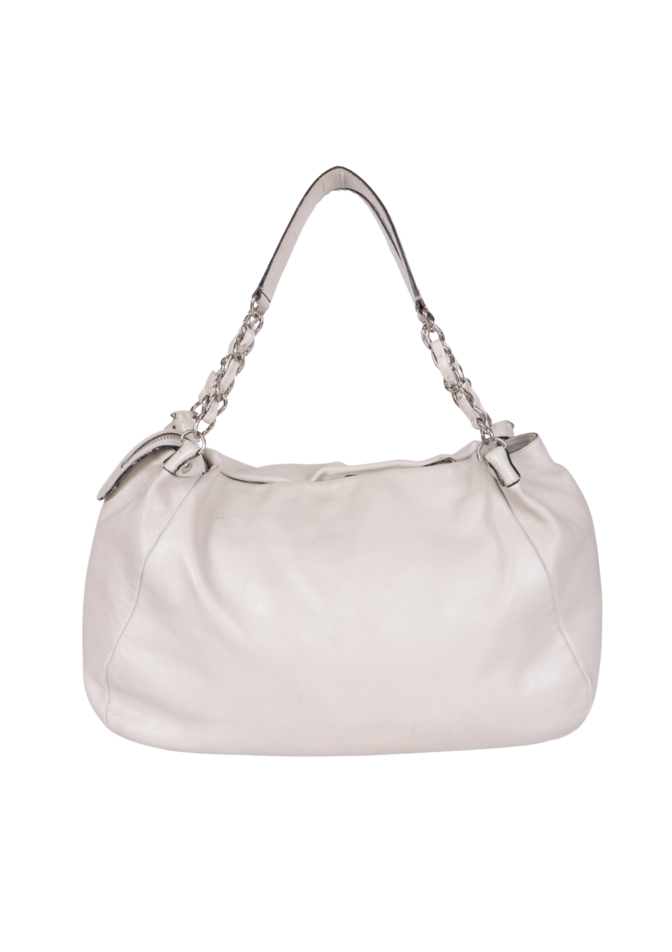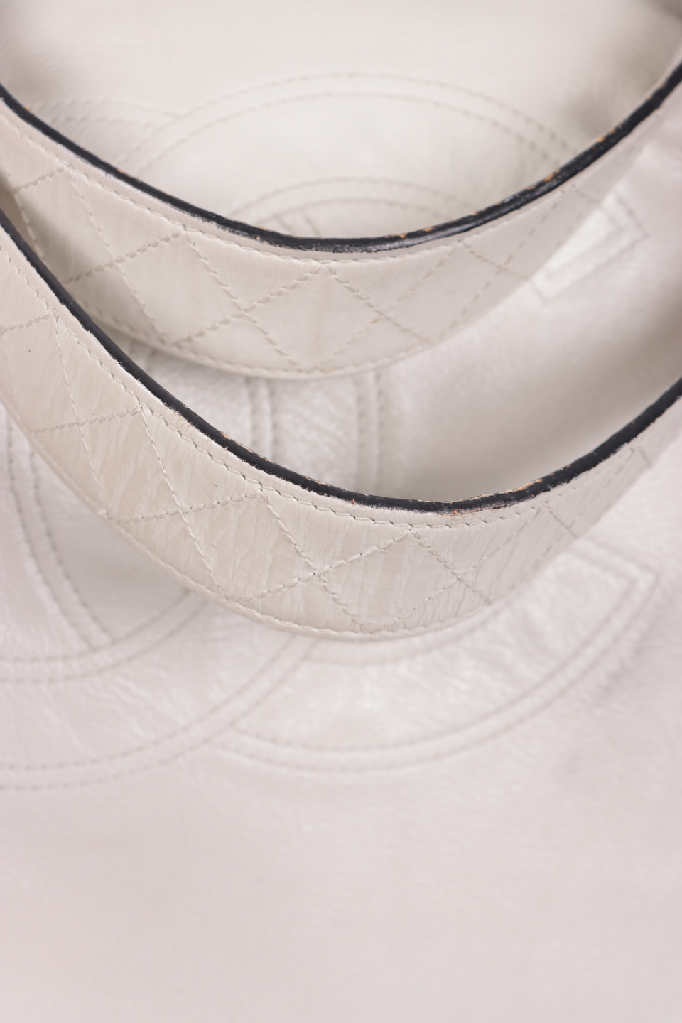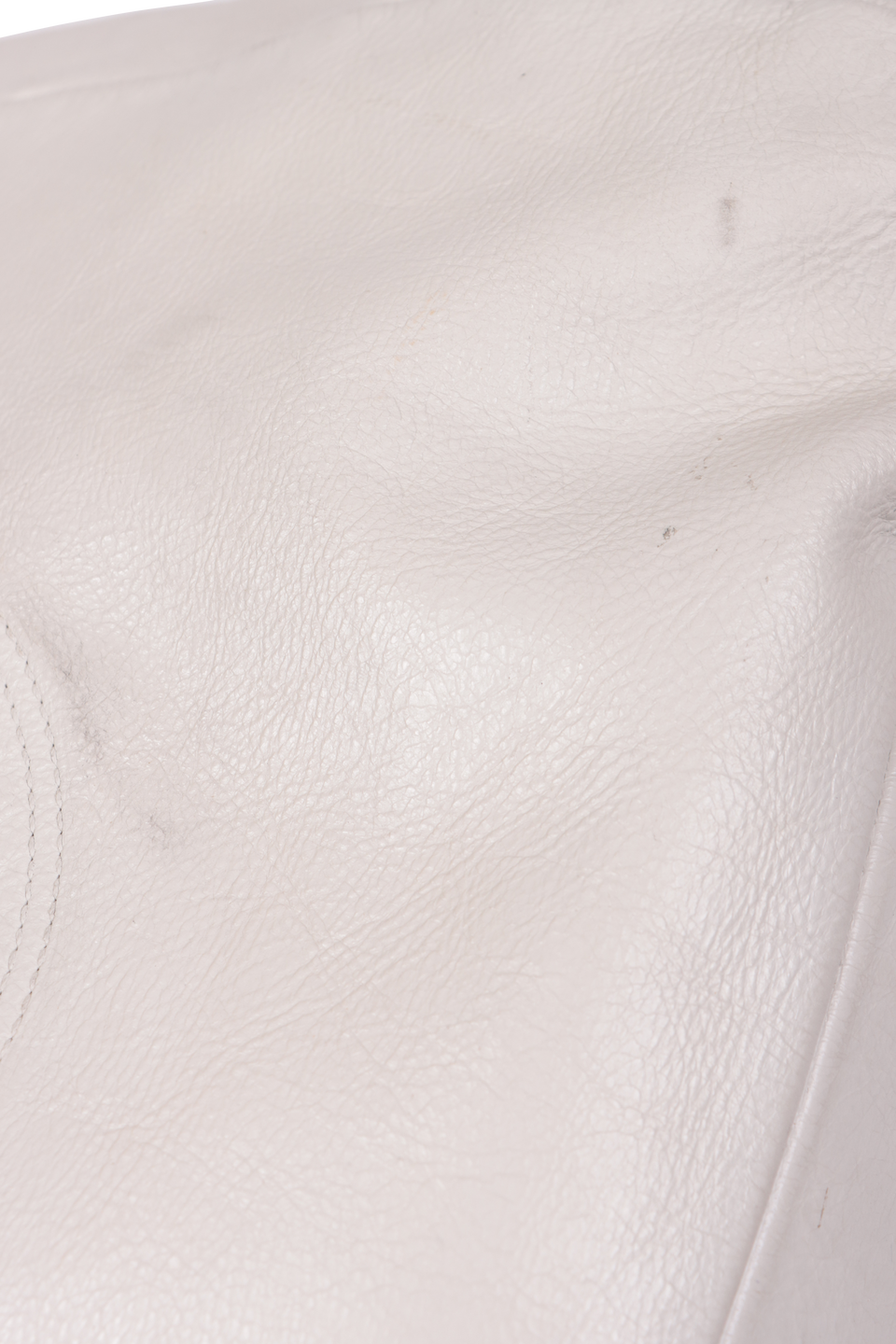 Regular. Apresenta severas manchas escurecidas, desgastes e marcas de uso pelo couro, especialmente na parte inferior frontal, couro consideravelmente ressecado, notáveis marcas de uso, desgastes e aberturas nas selagens das alças, considerável deformaçāo na estrutura da peça, principalmente nas laterais e faixas de couro das alças e notáveis marcas de uso e oxidações pelas ferragens.