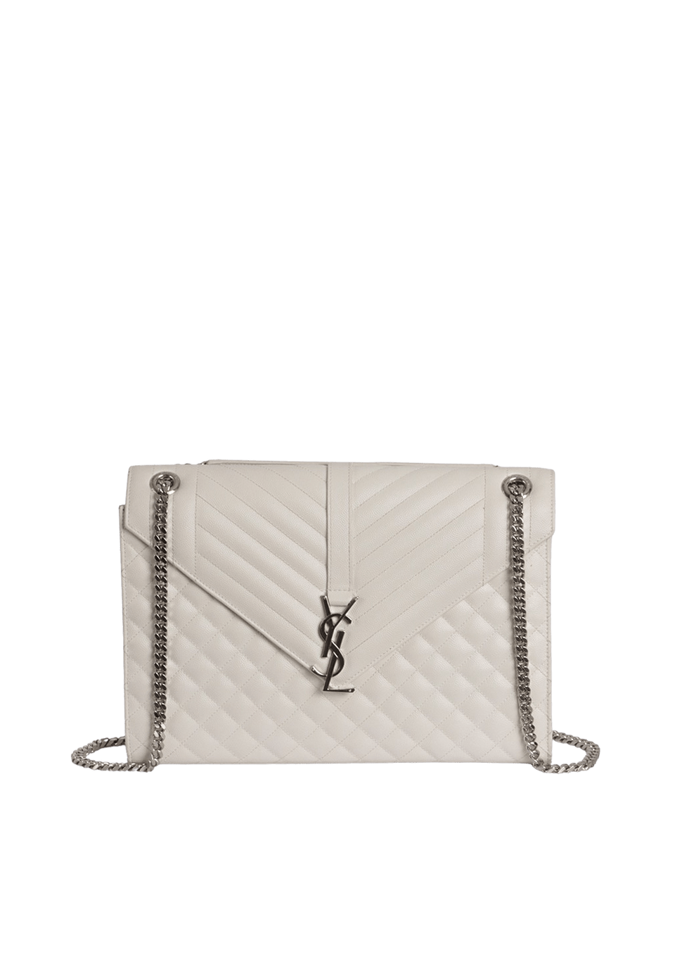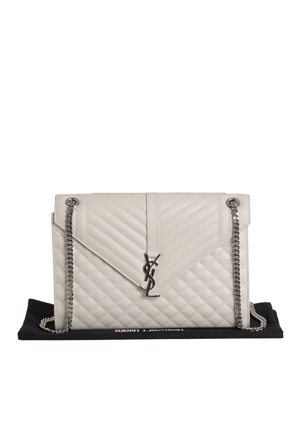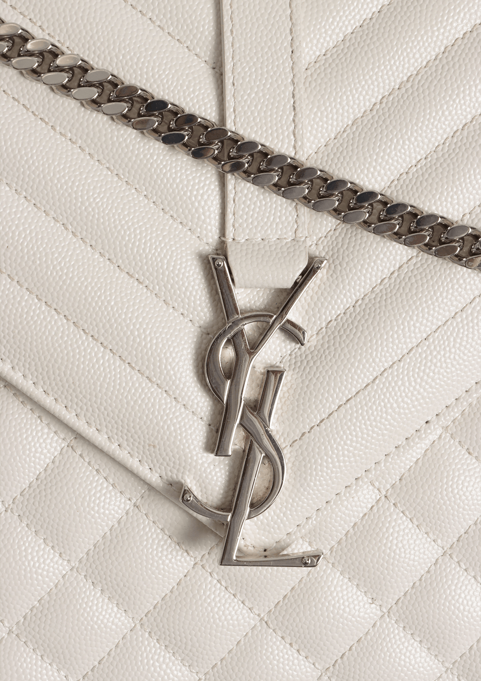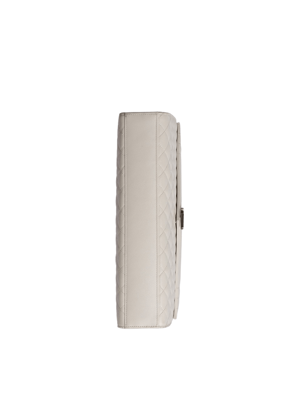 - Couro calfskin branco com acabamentos matelassê e Grain De Poudre;