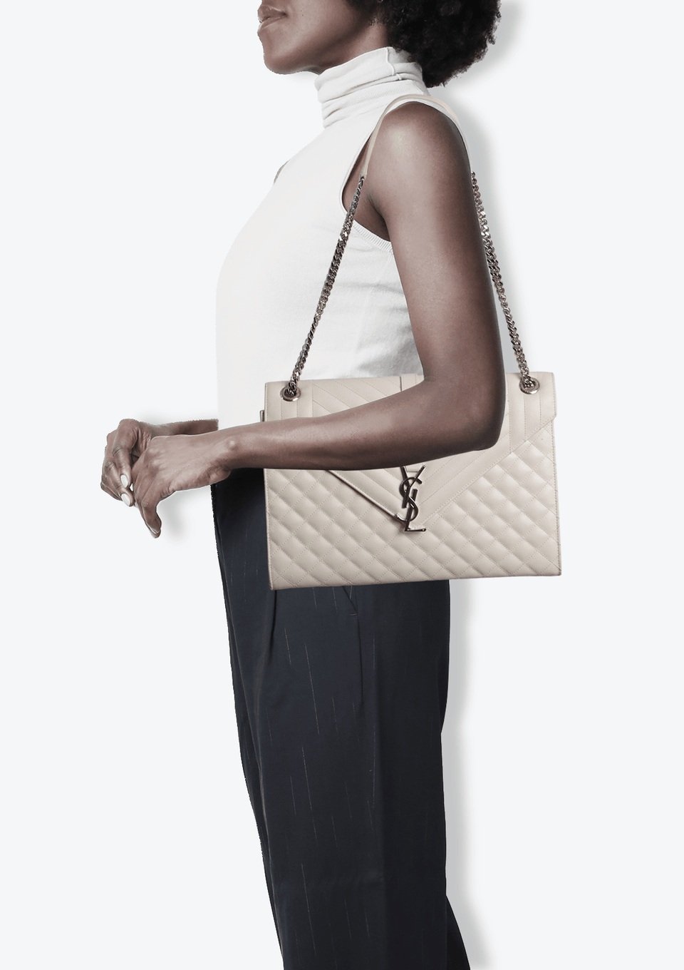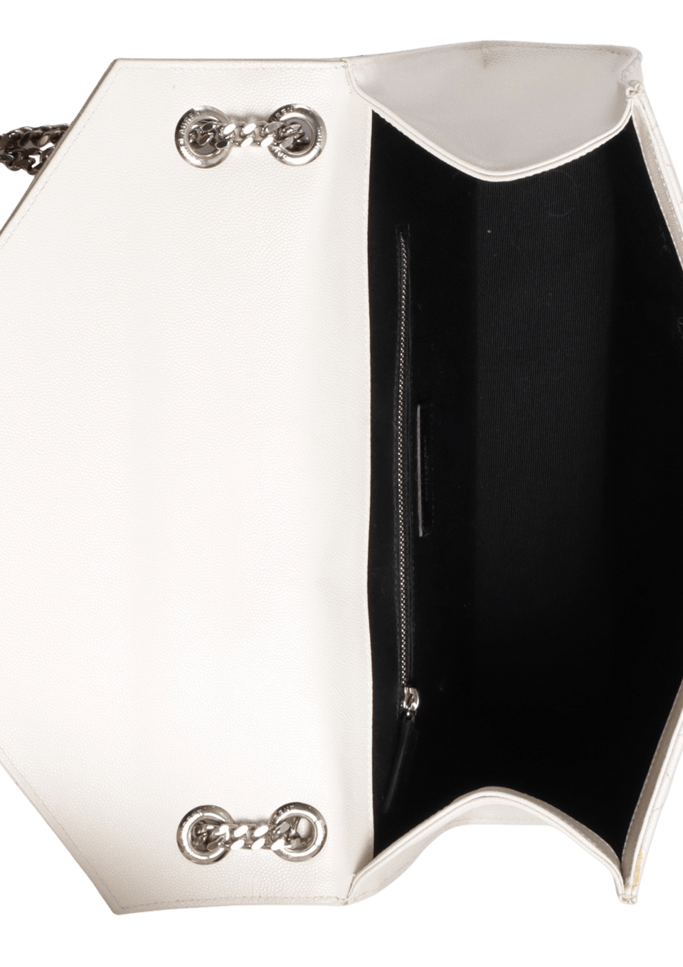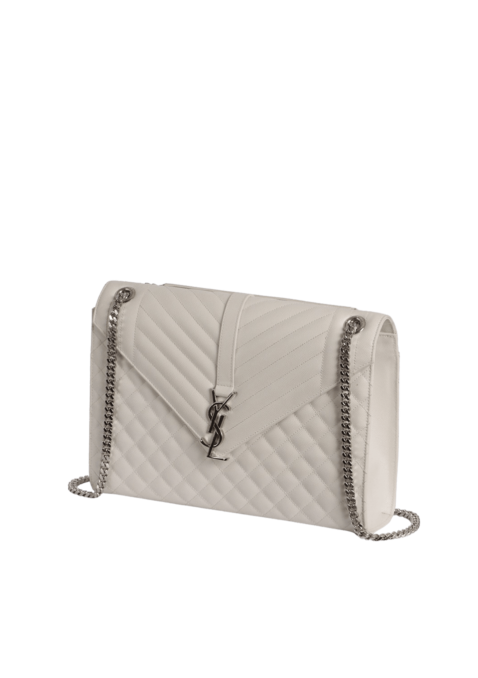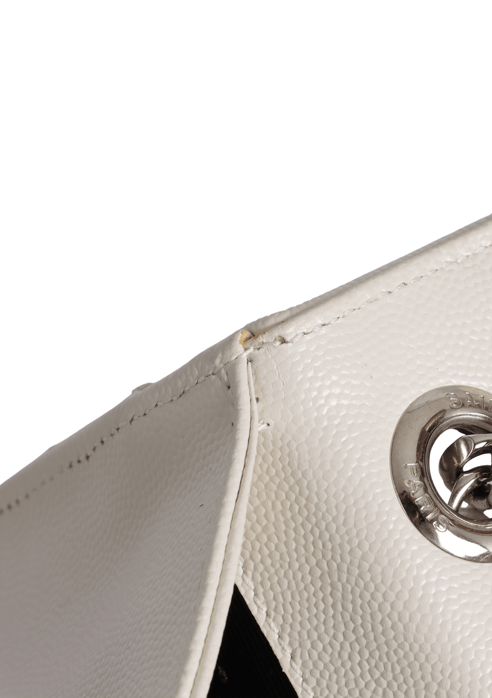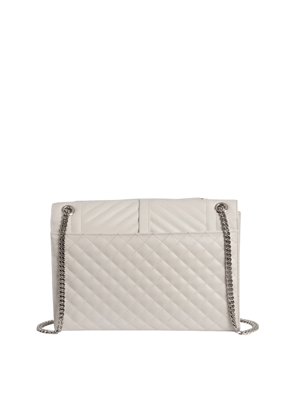 - Couro calfskin branco com acabamentos matelassê e Grain De Poudre;