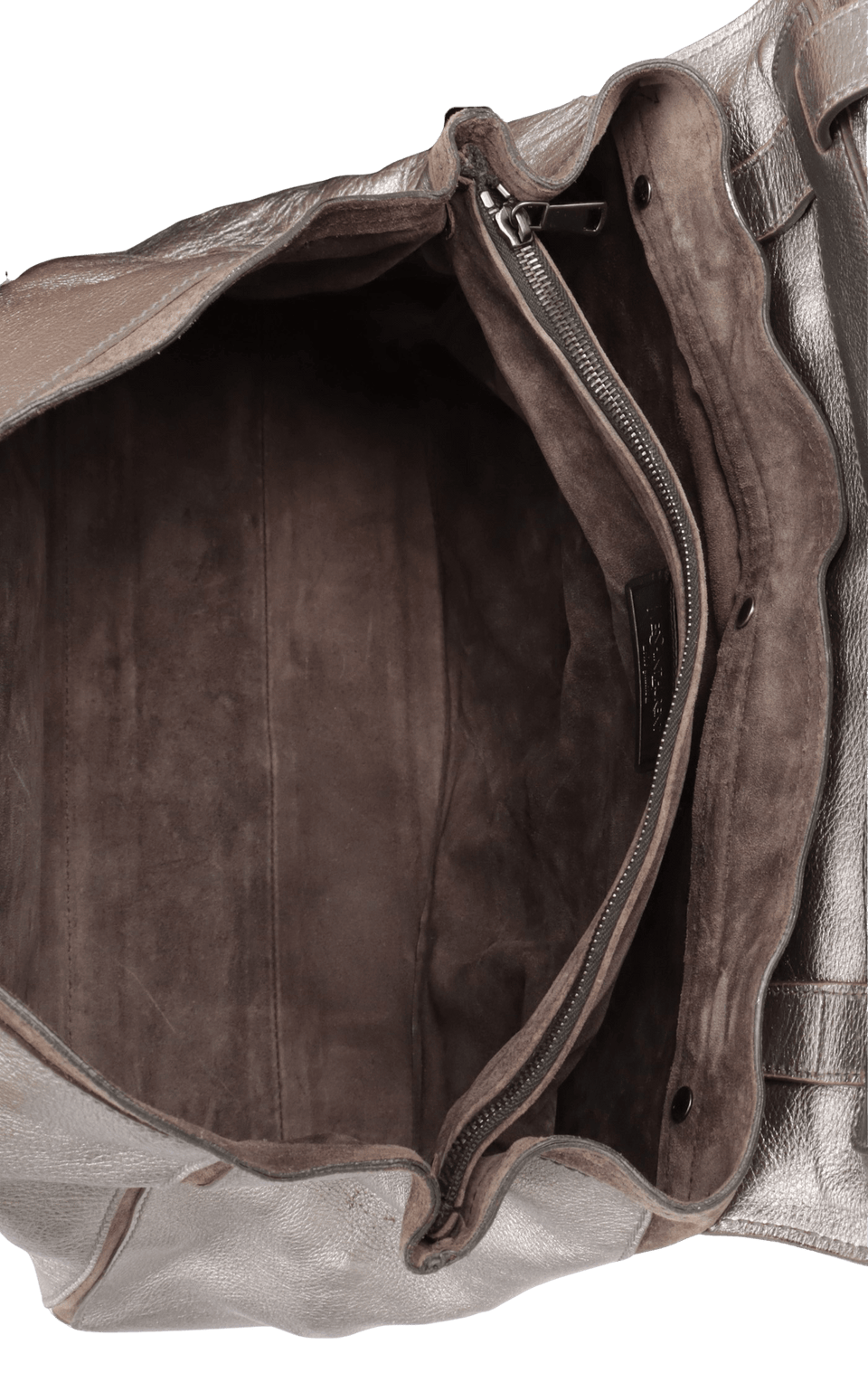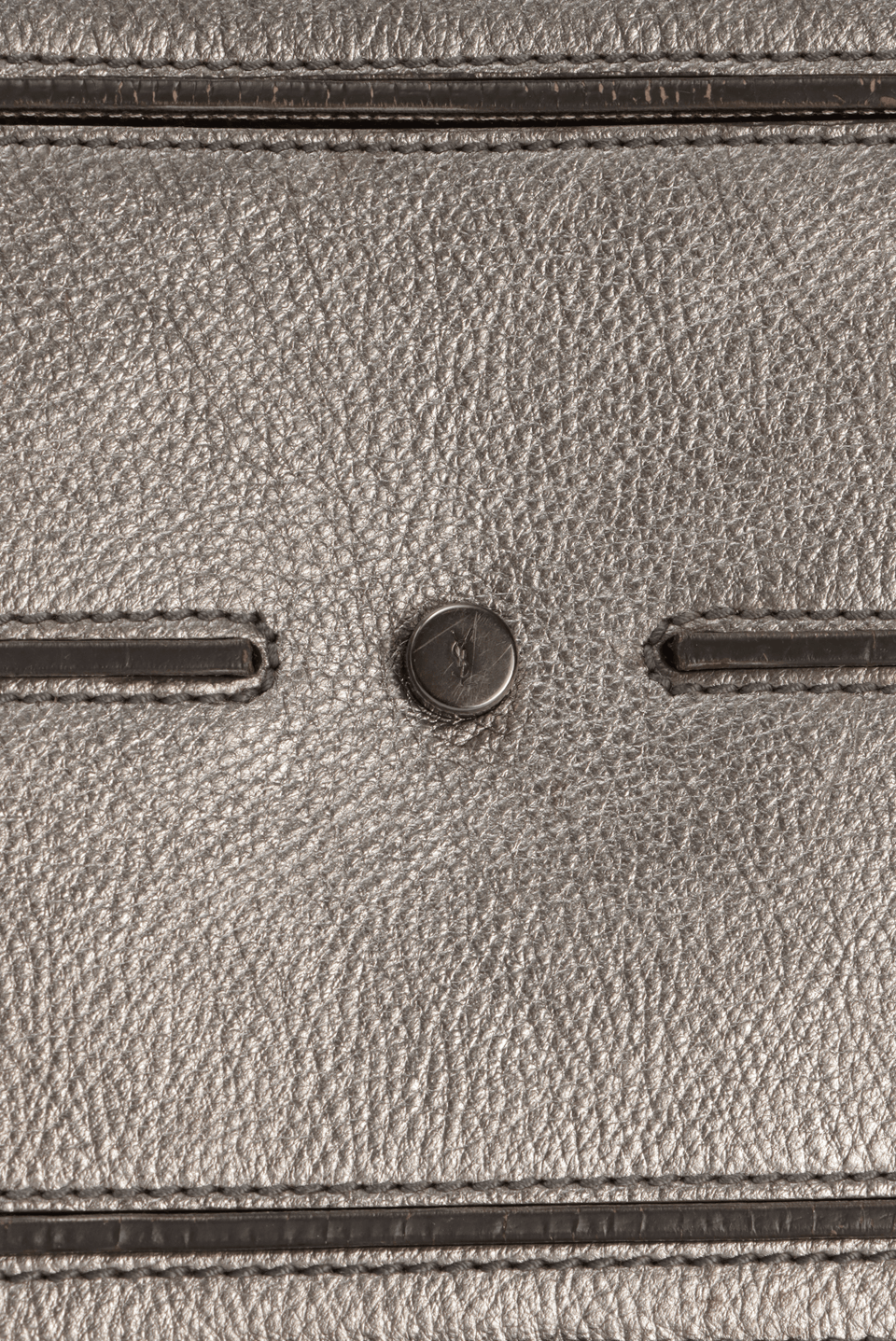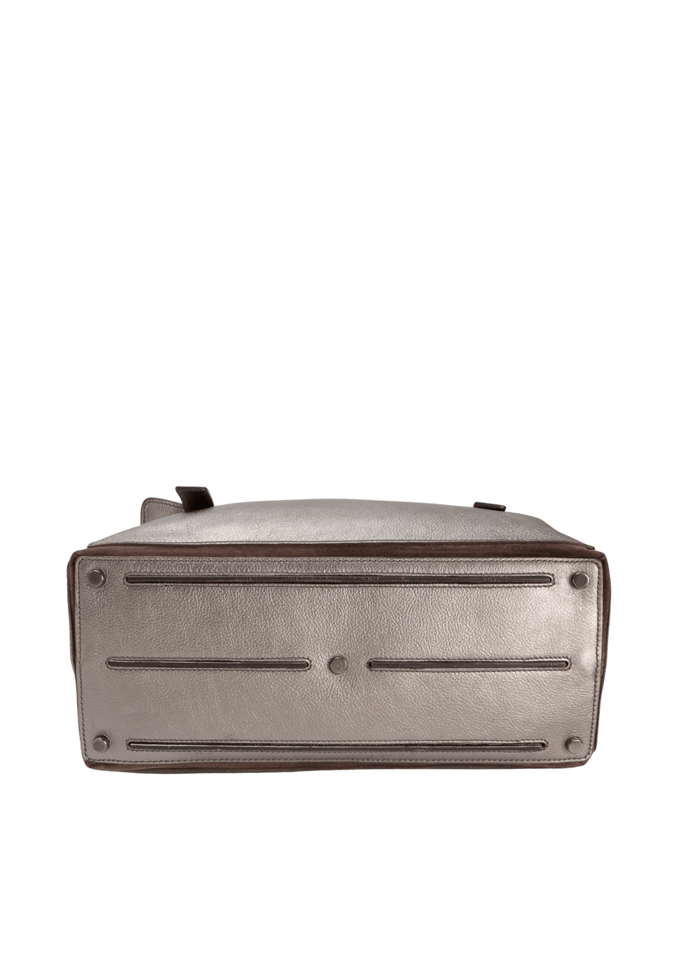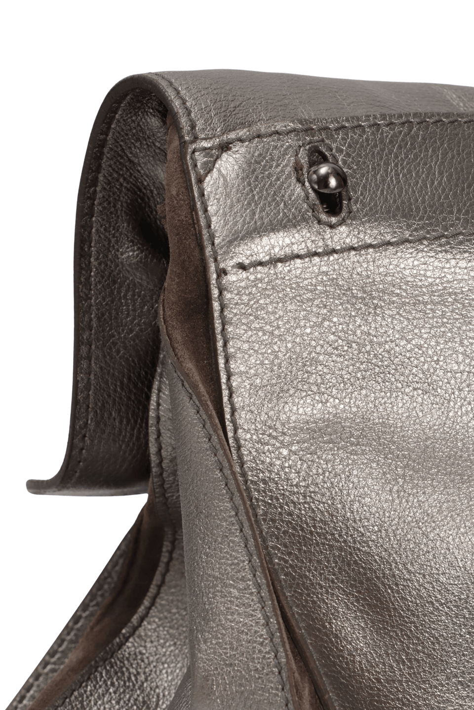 Descrição do Material: Couro calfskin cinza com acabamento metalizado e detalhes em camurça