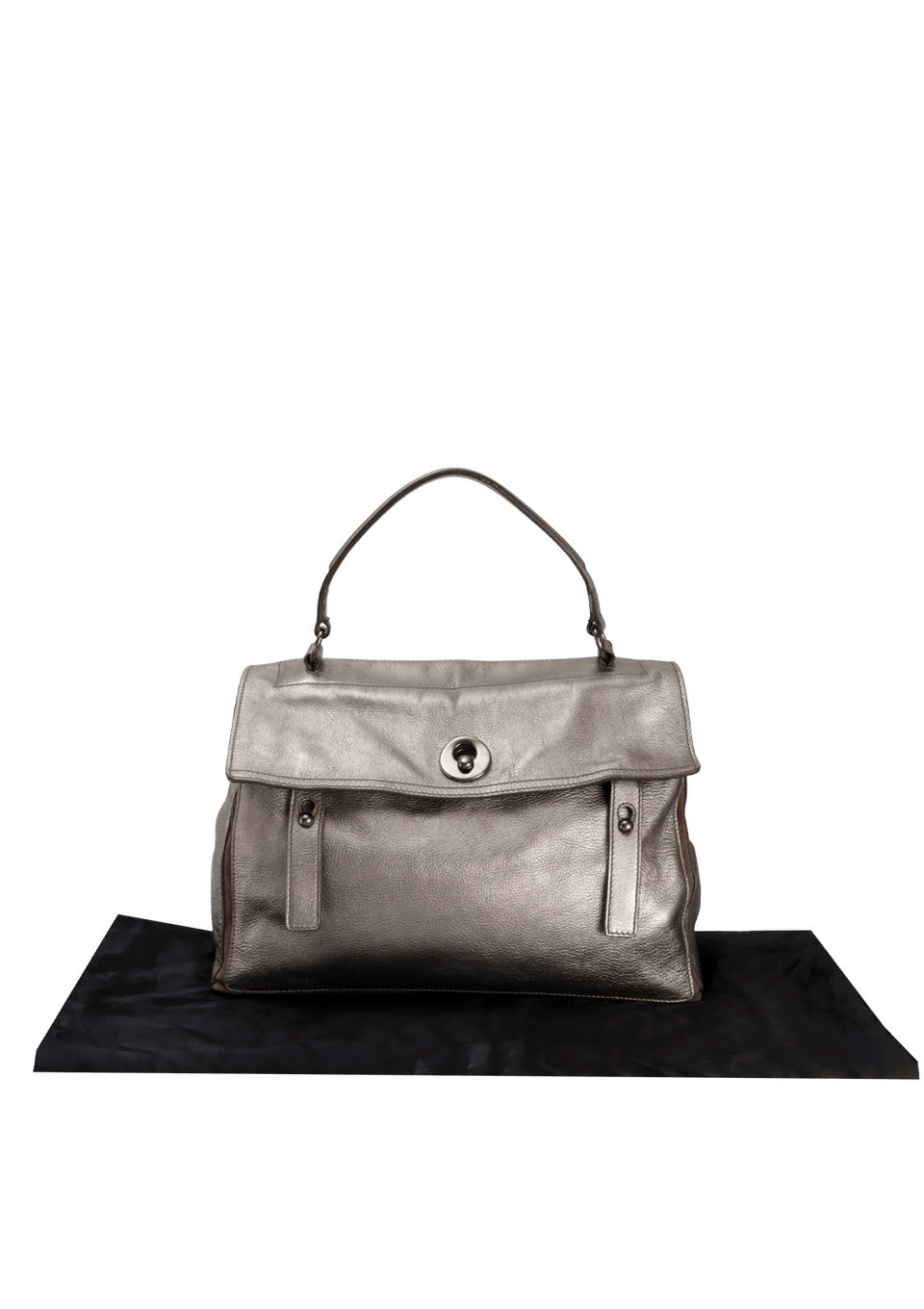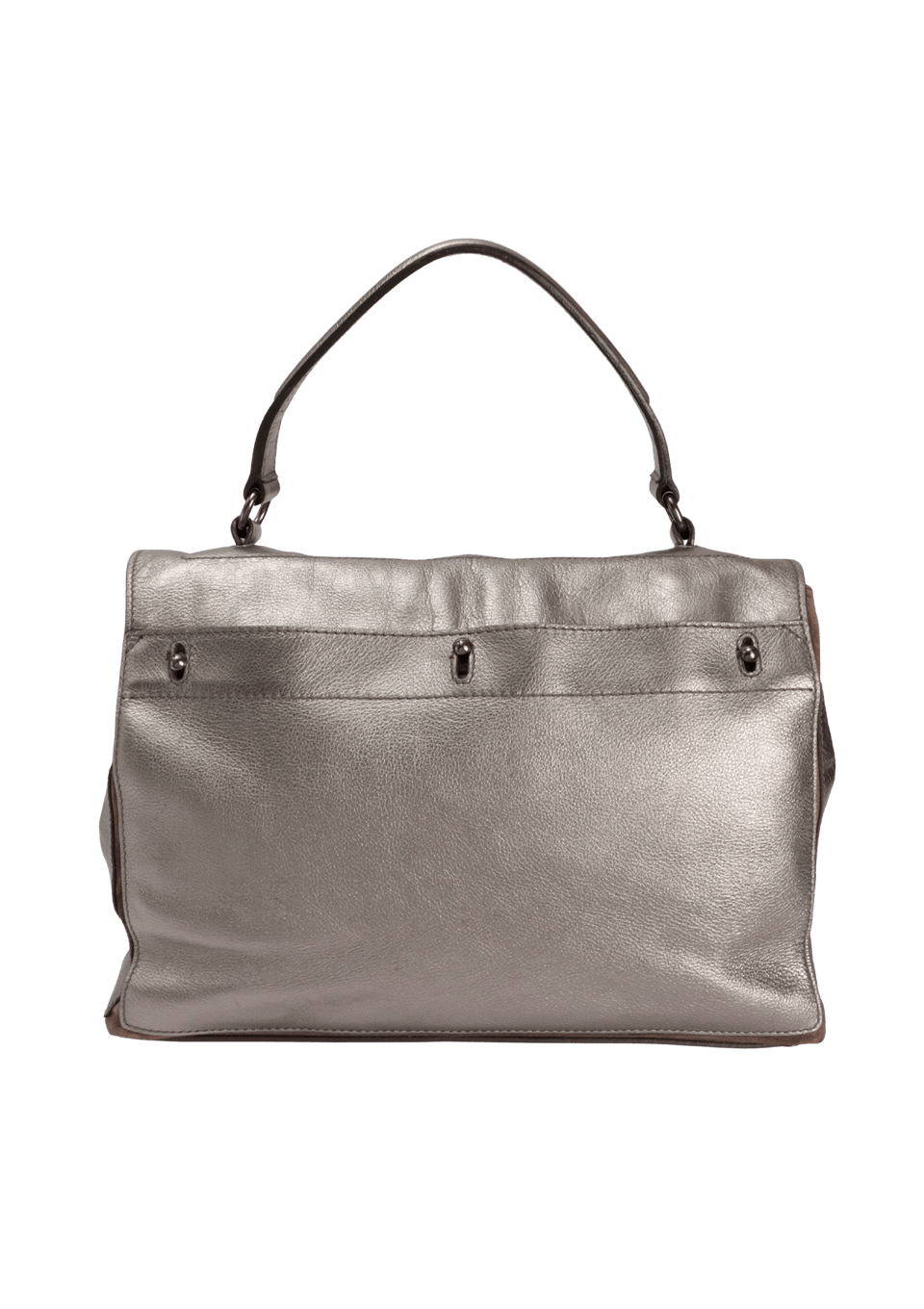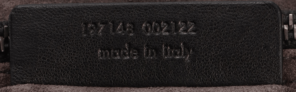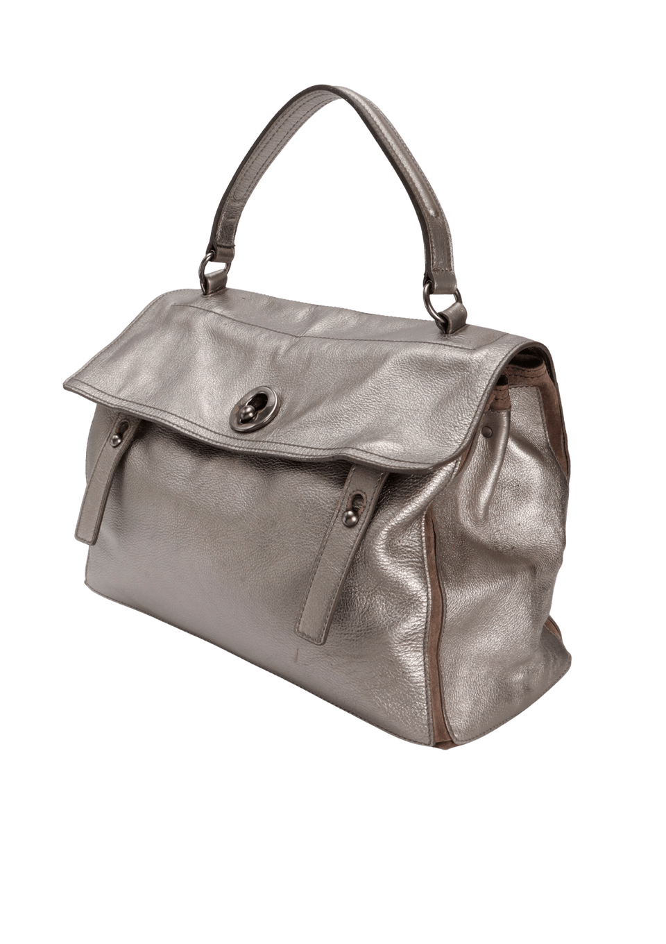 Descrição do Material: Couro calfskin cinza com acabamento metalizado e detalhes em camurça