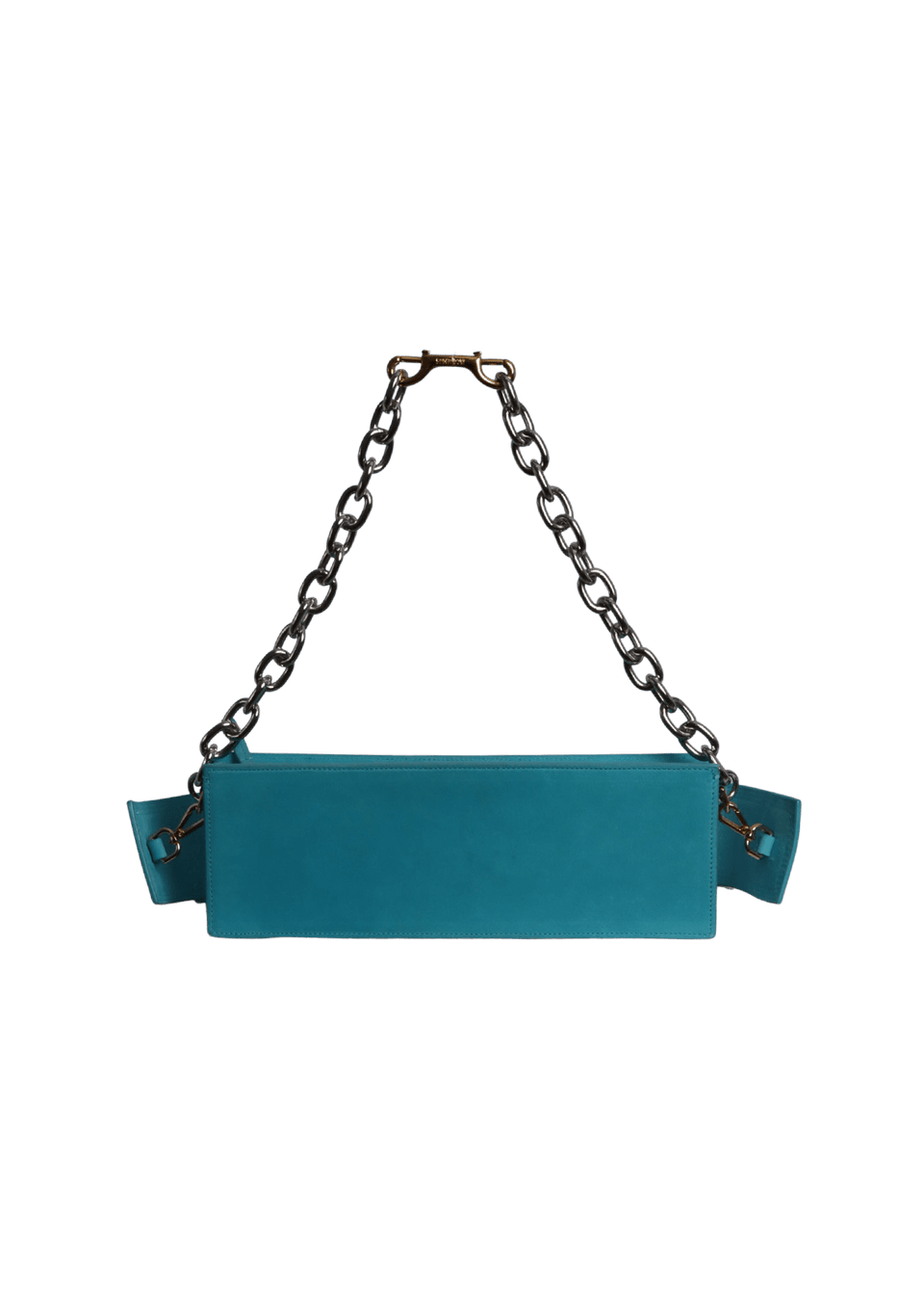 Condição: Bom, com aparência de usado. Apresenta leves desgastes por todo o suede, principalmente na parte inferior frontal, pequenas manchas escurecidas nas selagens, principalmente dos cantos da base, leves desgastes nas ferragens e leves marcas de uso na parte interna.