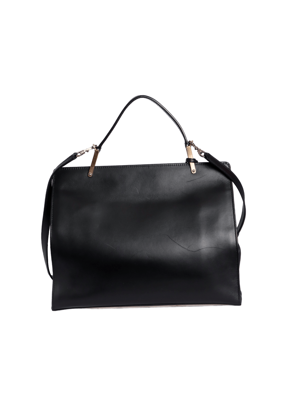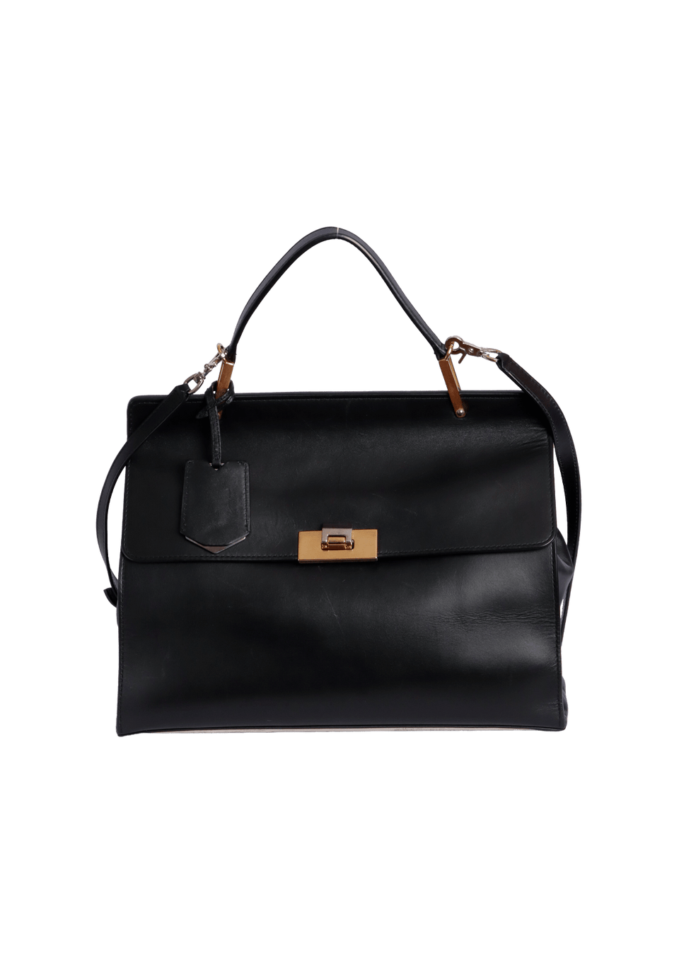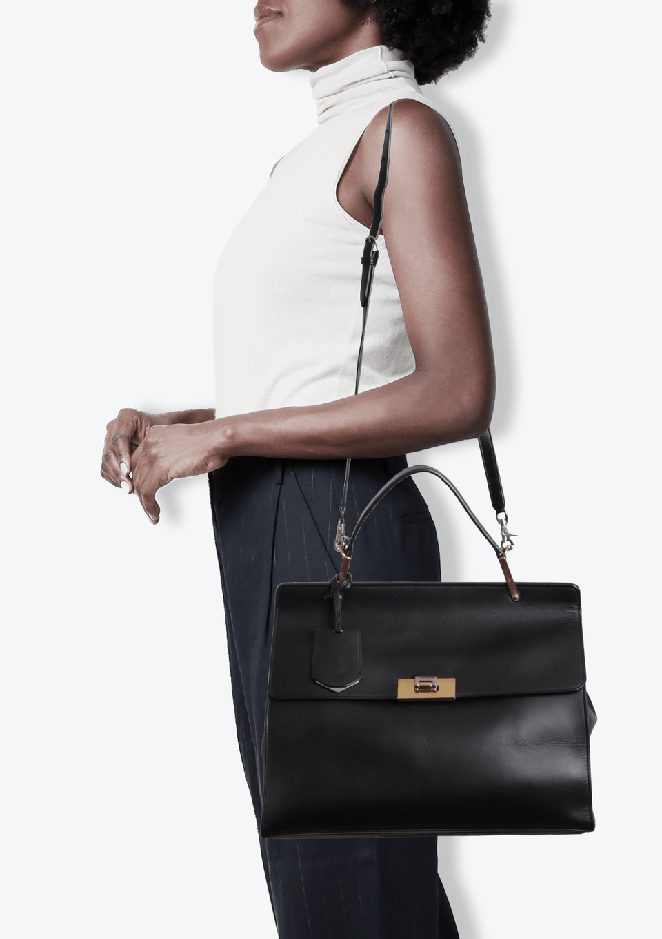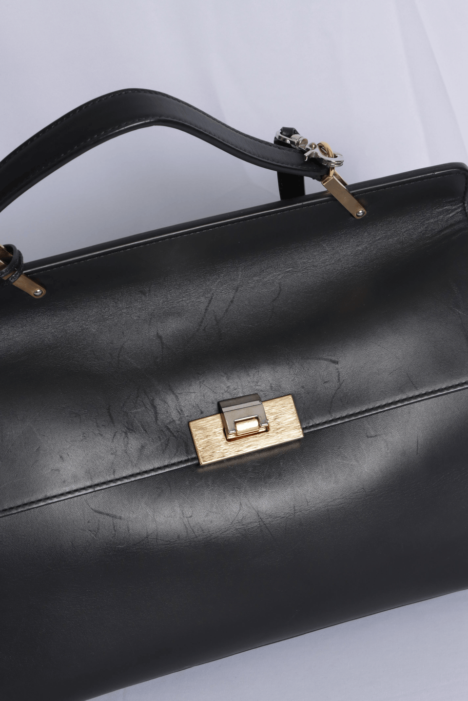 Condição: Bom, com aparência de usado. Apresenta notáveis desgastes e marcas de uso por todo o couro, especialmente na parte frontal, leve perda da estrutura original da bolsa, especialmente pequenas deformações e ressecamento na parte inferior frontal, leve deformação da alça de mão, leves desgastes nas ferragens e leves desgastes e pequenas manchas esbranquiçadas por toda a parte interna.