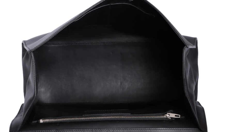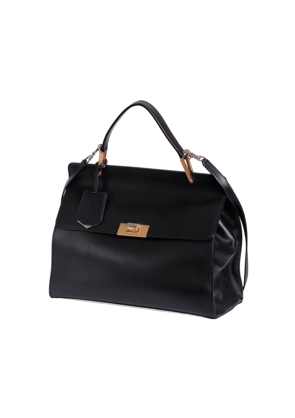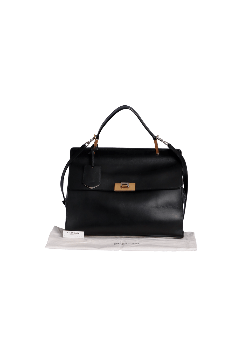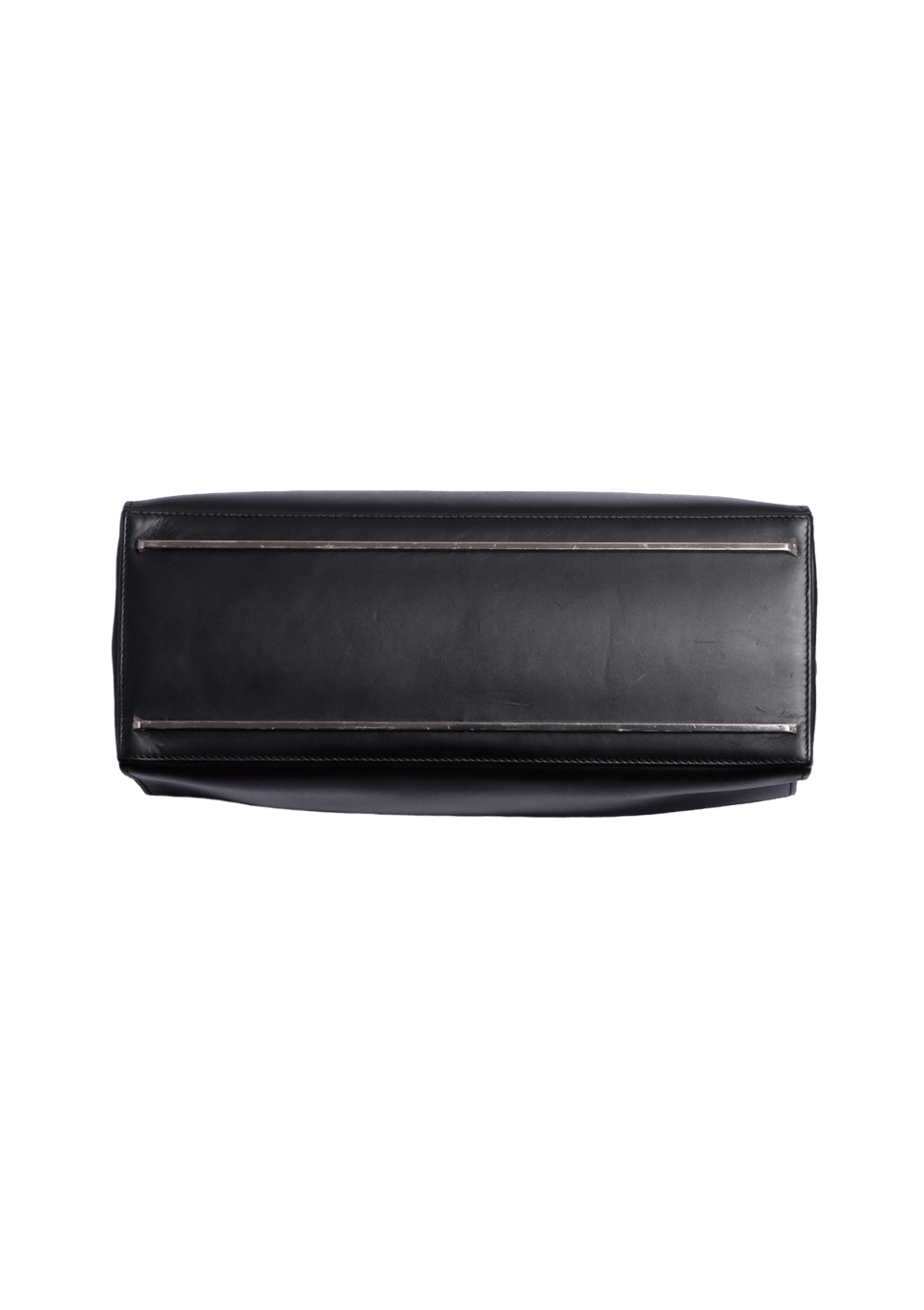 Condição: Bom, com aparência de usado. Apresenta notáveis desgastes e marcas de uso por todo o couro, especialmente na parte frontal, leve perda da estrutura original da bolsa, especialmente pequenas deformações e ressecamento na parte inferior frontal, leve deformação da alça de mão, leves desgastes nas ferragens e leves desgastes e pequenas manchas esbranquiçadas por toda a parte interna.