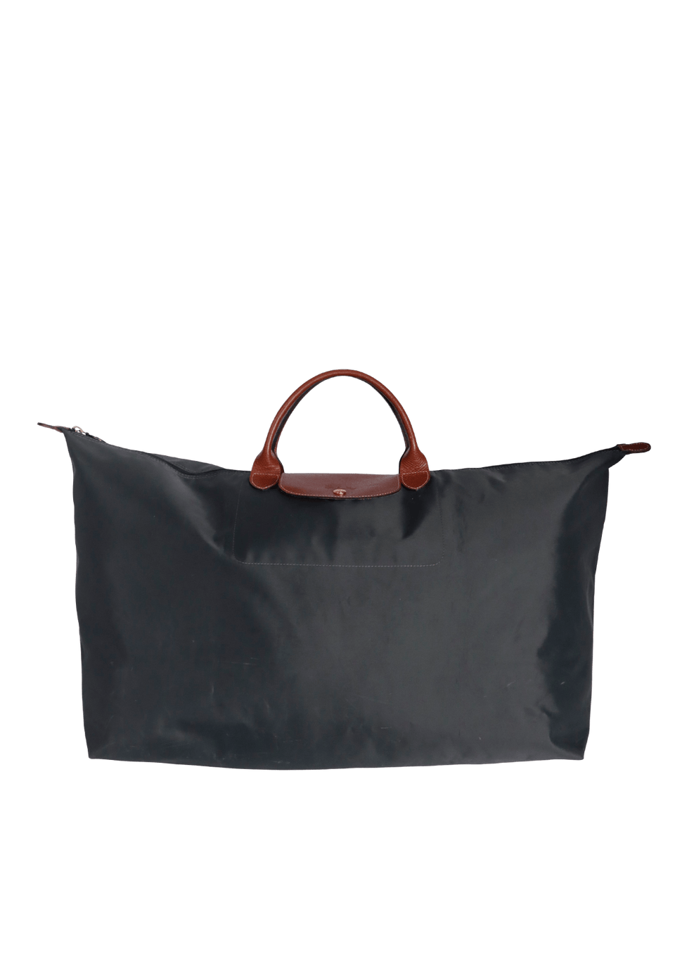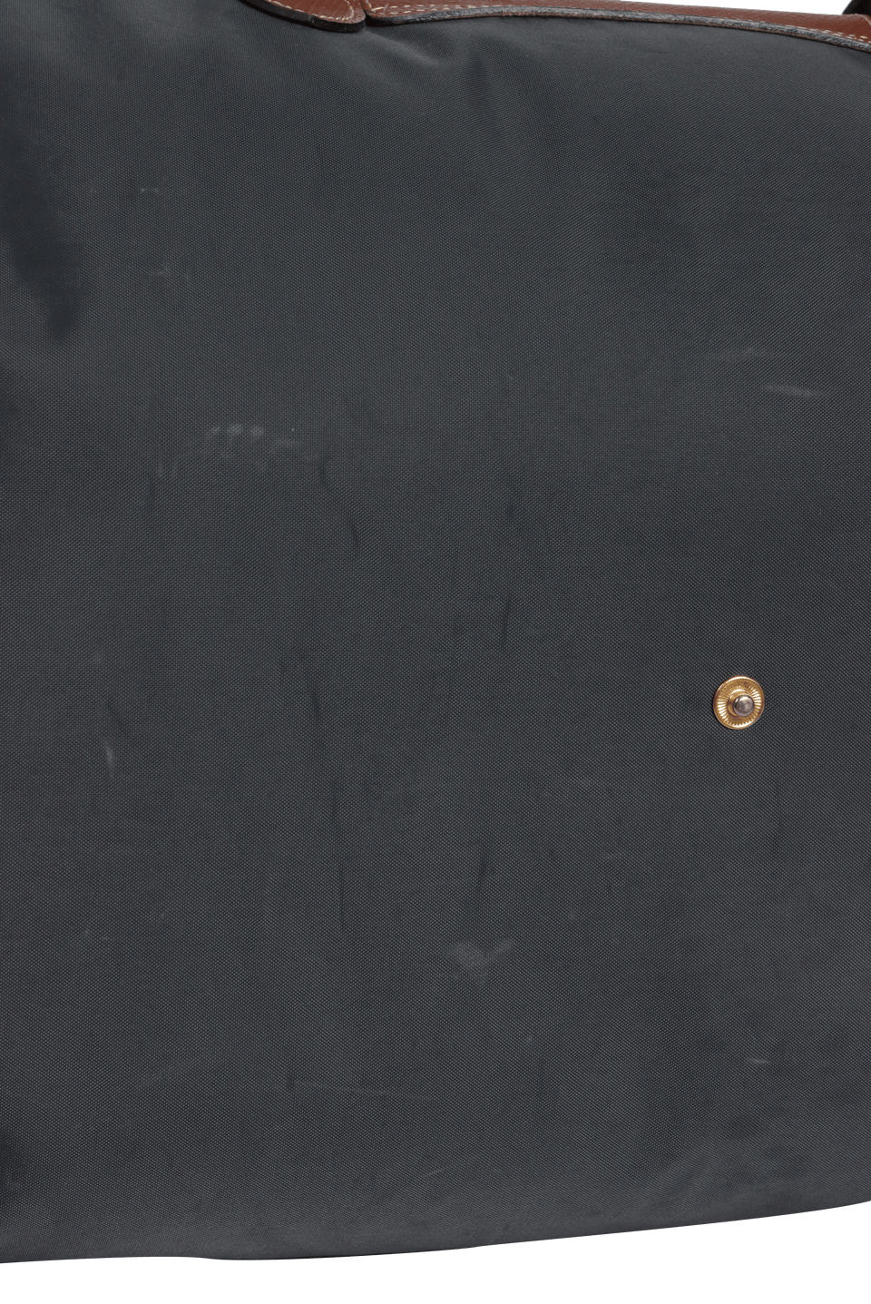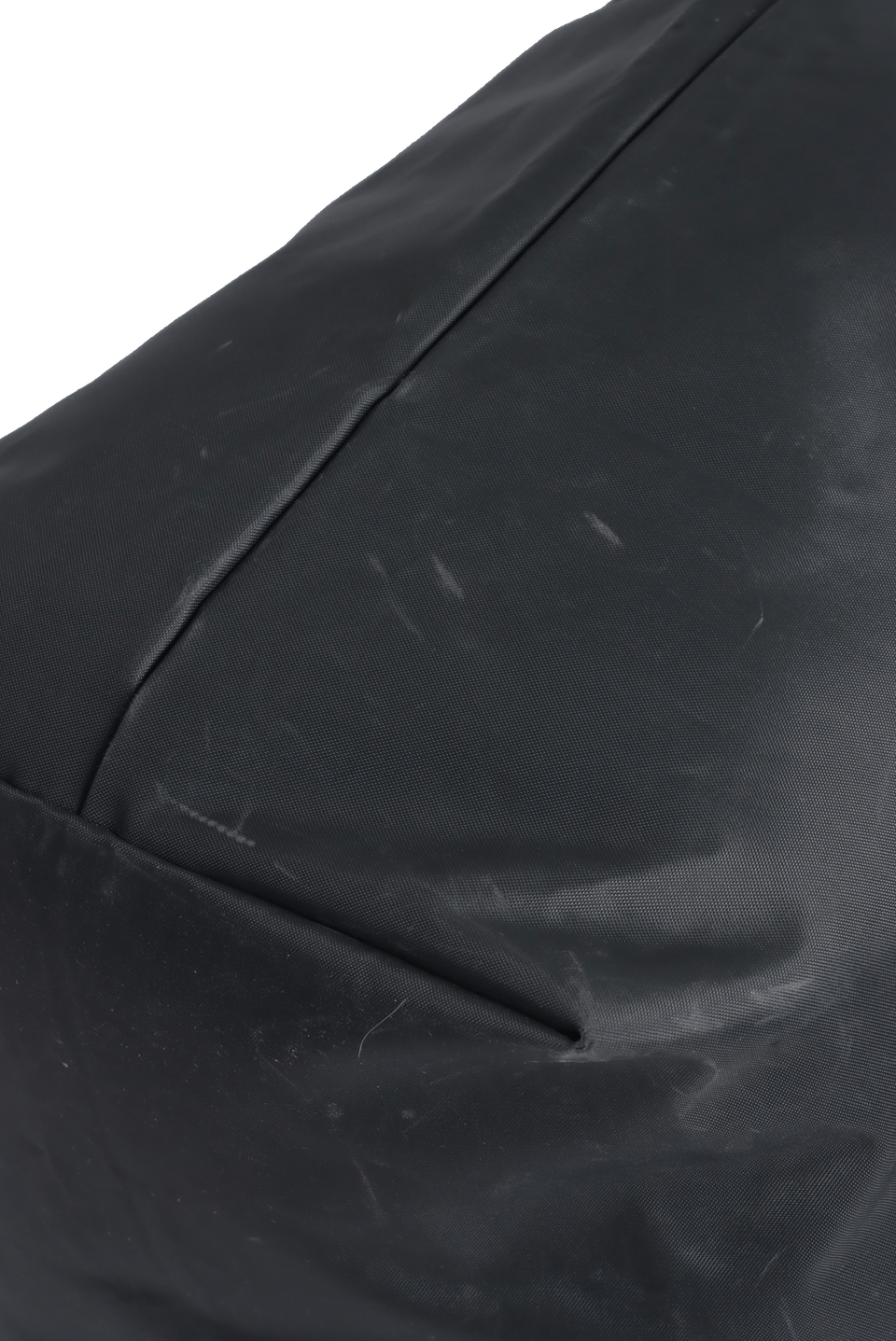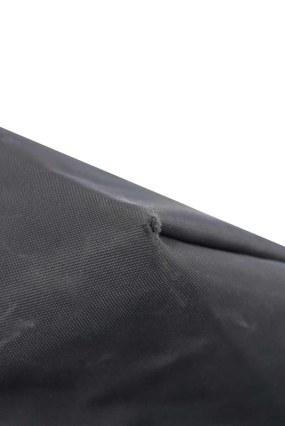 Condição: Regular. Apresenta severos desgastes, mínimo furo em um dos cantos da base, manchas escurecidas e esbranquiçadas por todo nylon, principalmente nos cantos inferiores e na parte frontal, notáveis desgastes e manchas de uso nos detalhes em couro, consideráveis desgastes nas ferragens, notáveis desgastes nas selagens e consideráveis marcas de uso no forro.
