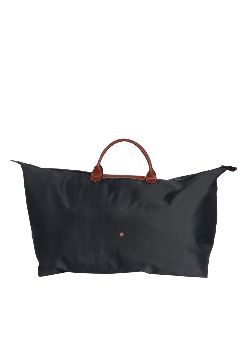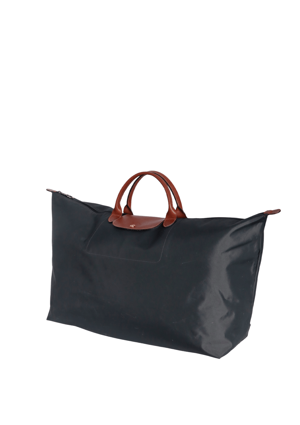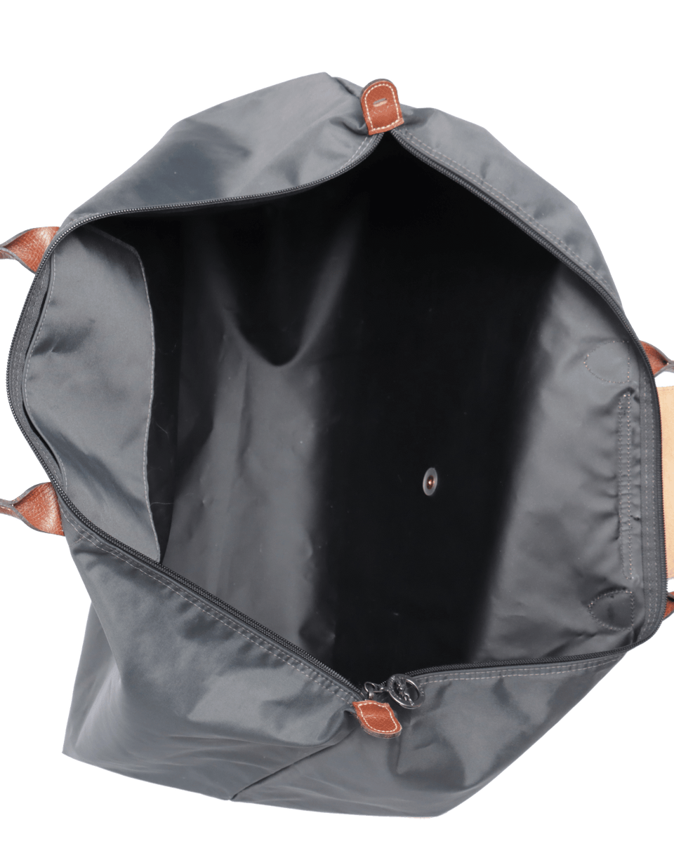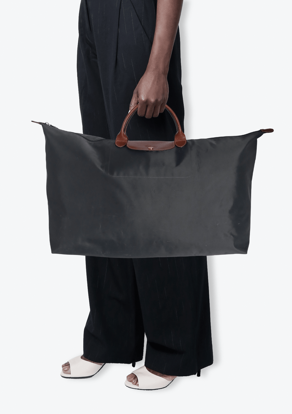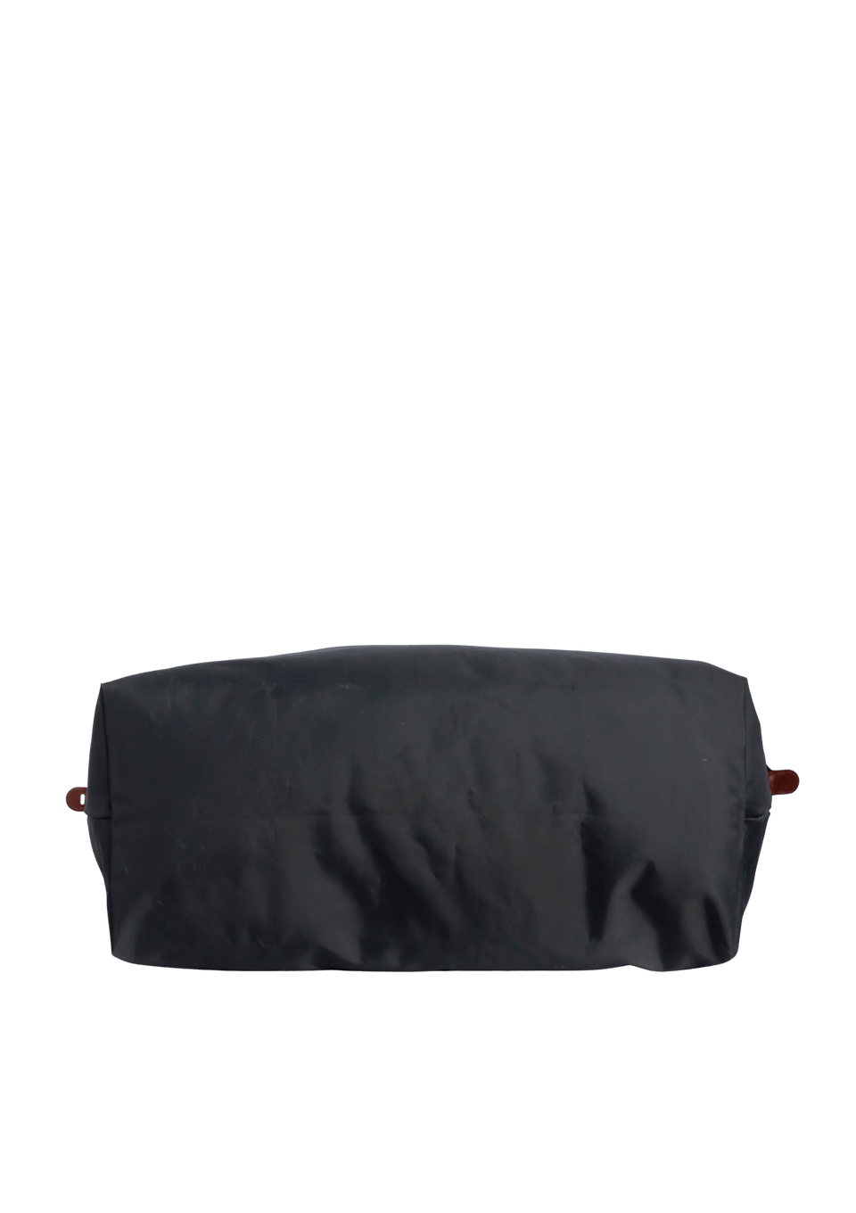 Condição: Regular. Apresenta severos desgastes, mínimo furo em um dos cantos da base, manchas escurecidas e esbranquiçadas por todo nylon, principalmente nos cantos inferiores e na parte frontal, notáveis desgastes e manchas de uso nos detalhes em couro, consideráveis desgastes nas ferragens, notáveis desgastes nas selagens e consideráveis marcas de uso no forro.