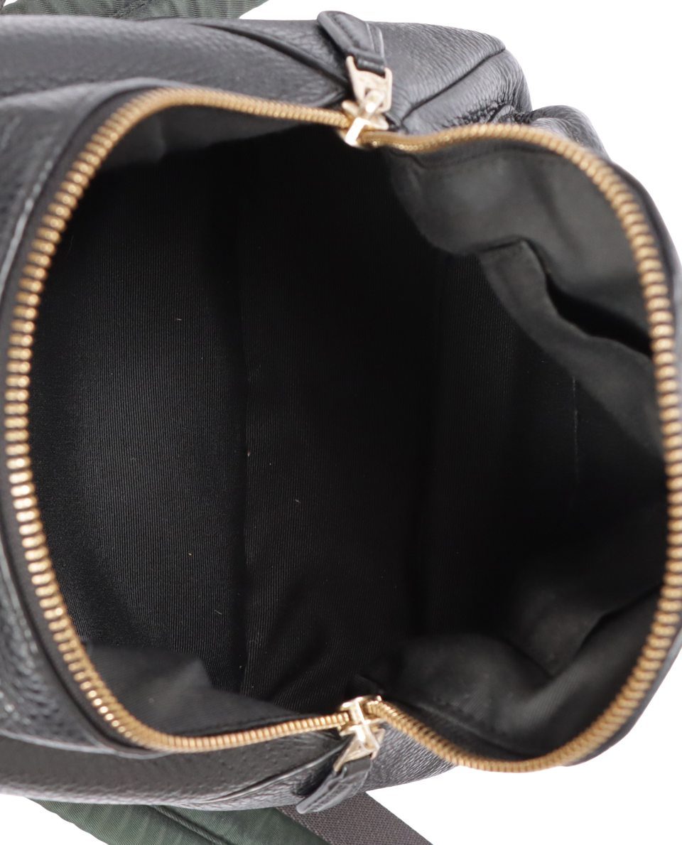 Bom, com aparência de usado. Apresenta leves deformidades pela estrutura, especialmente nas laterais superiores e parte central inferior de trás, pequenas manchas esbranquiçadas pelo couro na parte central do lado esquerdo frontal, leves oxidações, descolorações e marcas de uso nas ferragens dos puxadores dos cursores, nos detalhes das alças de ombro e na logomarca frontal, pequenas manchas de uso e desbotamentos pelo tecido da parte de trás e nas extremidades das alças de ombro e leves manchas de uso pelo forro.
