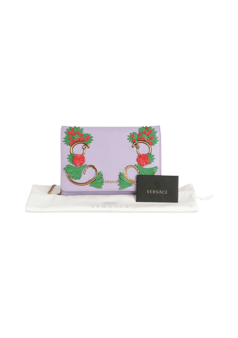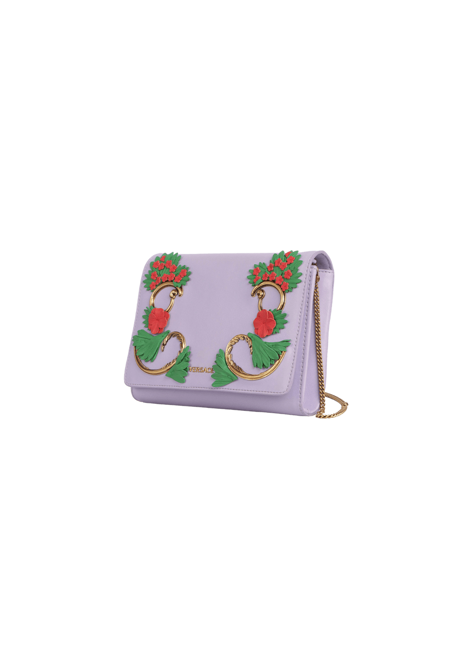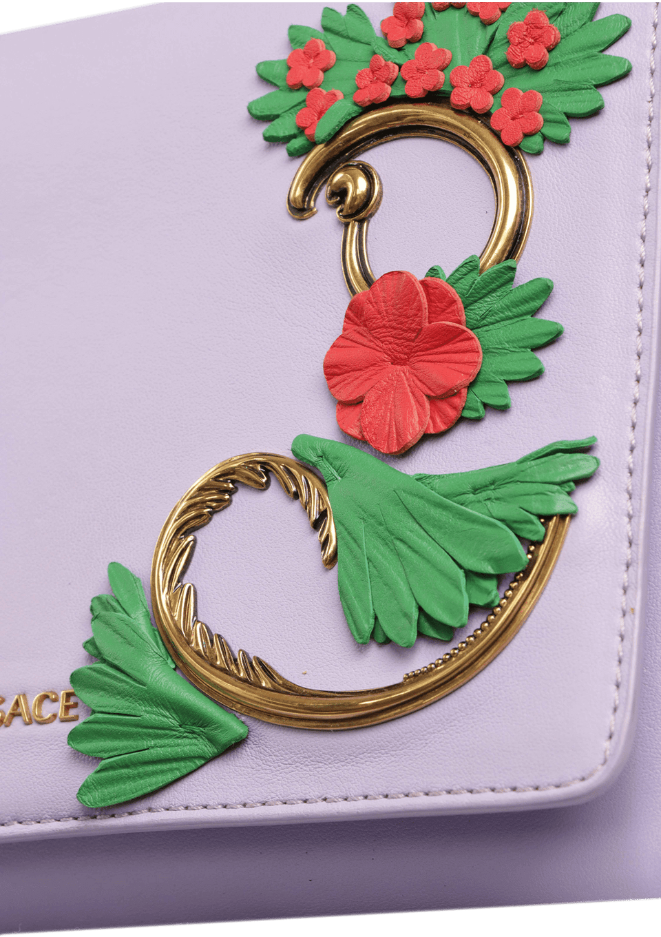 - Couro calfskin lilás com aplicação de flores nas cores vermelho e verde;