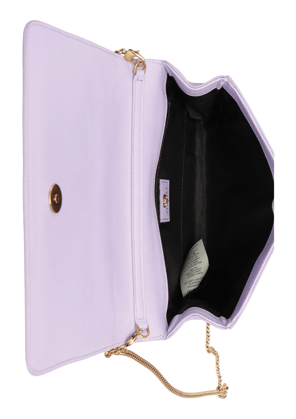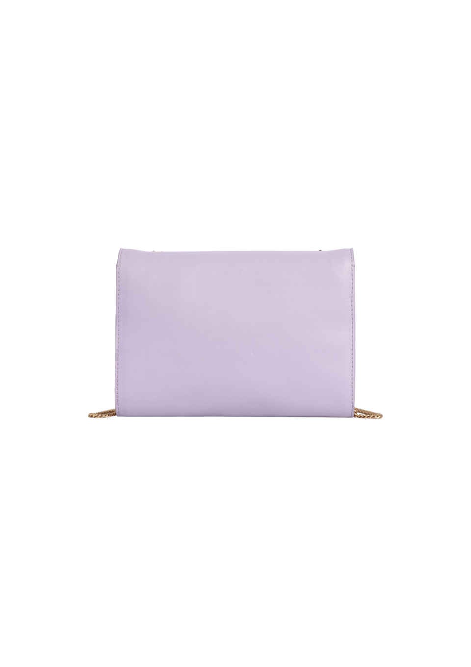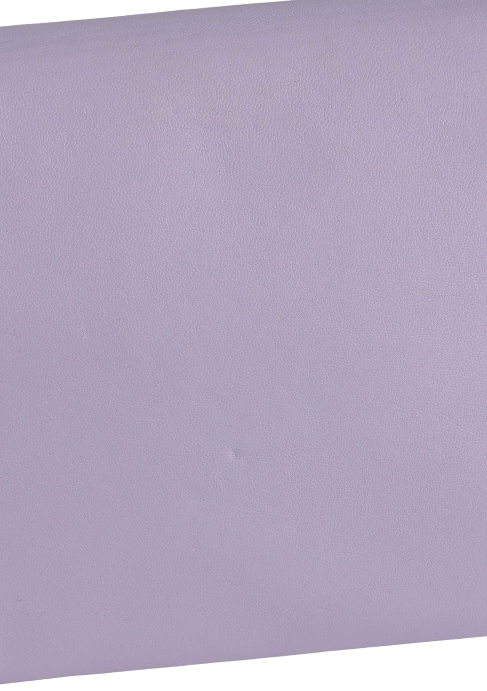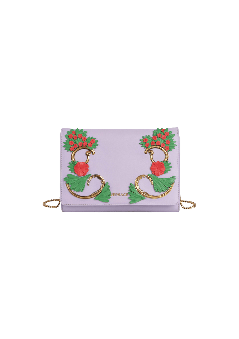 - Couro calfskin lilás com aplicação de flores nas cores vermelho e verde;