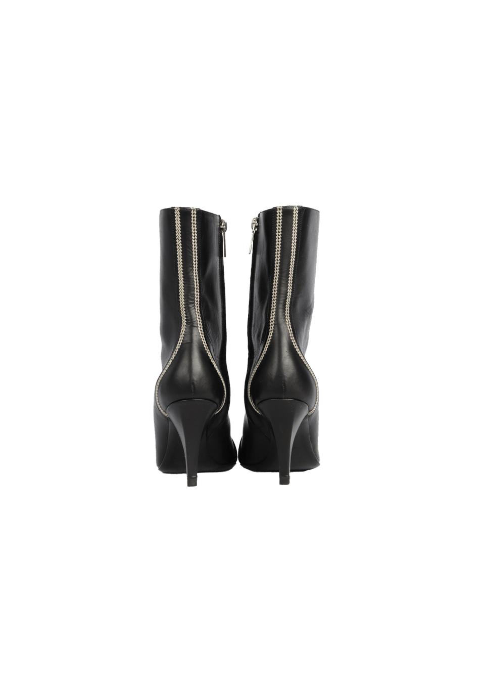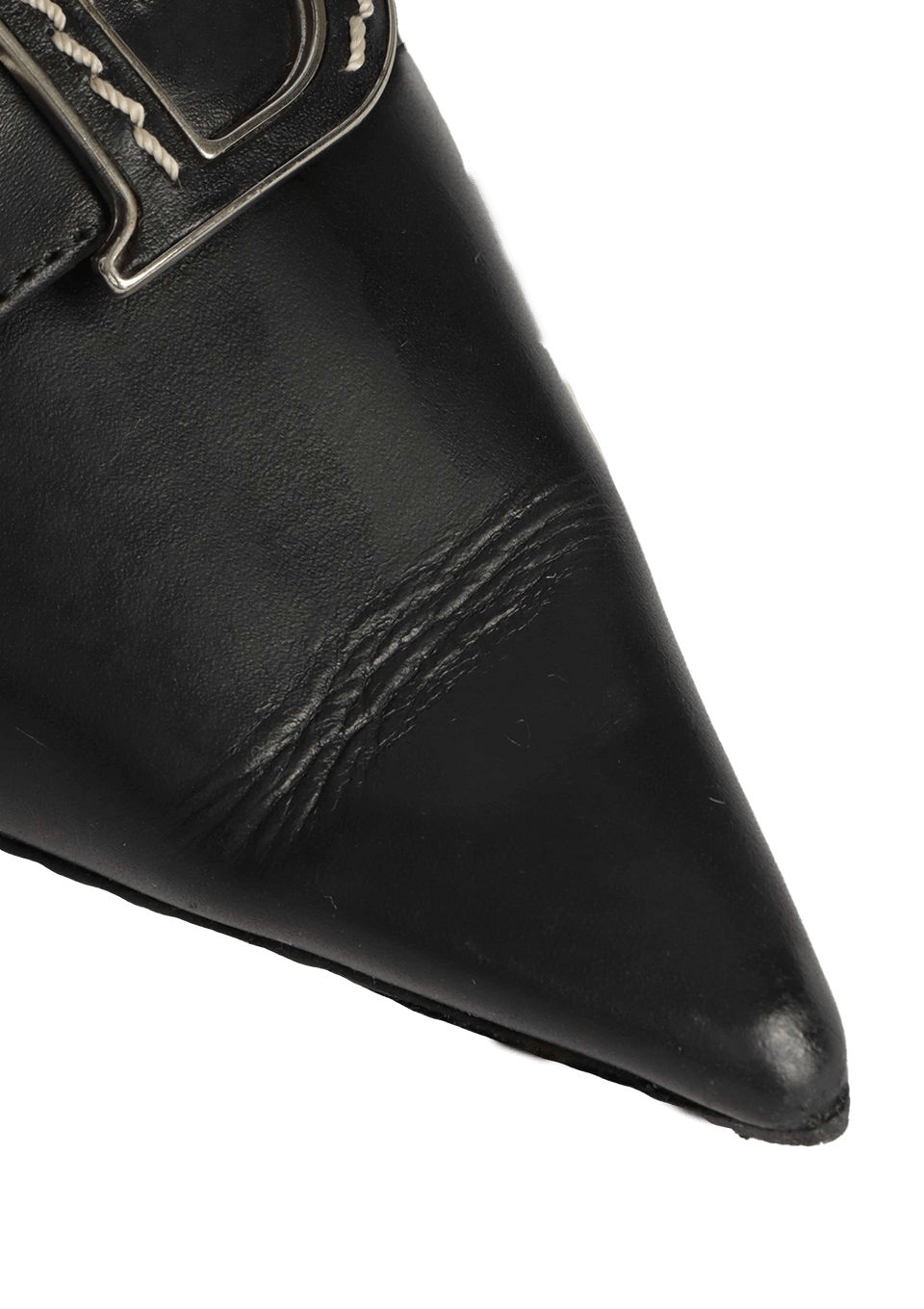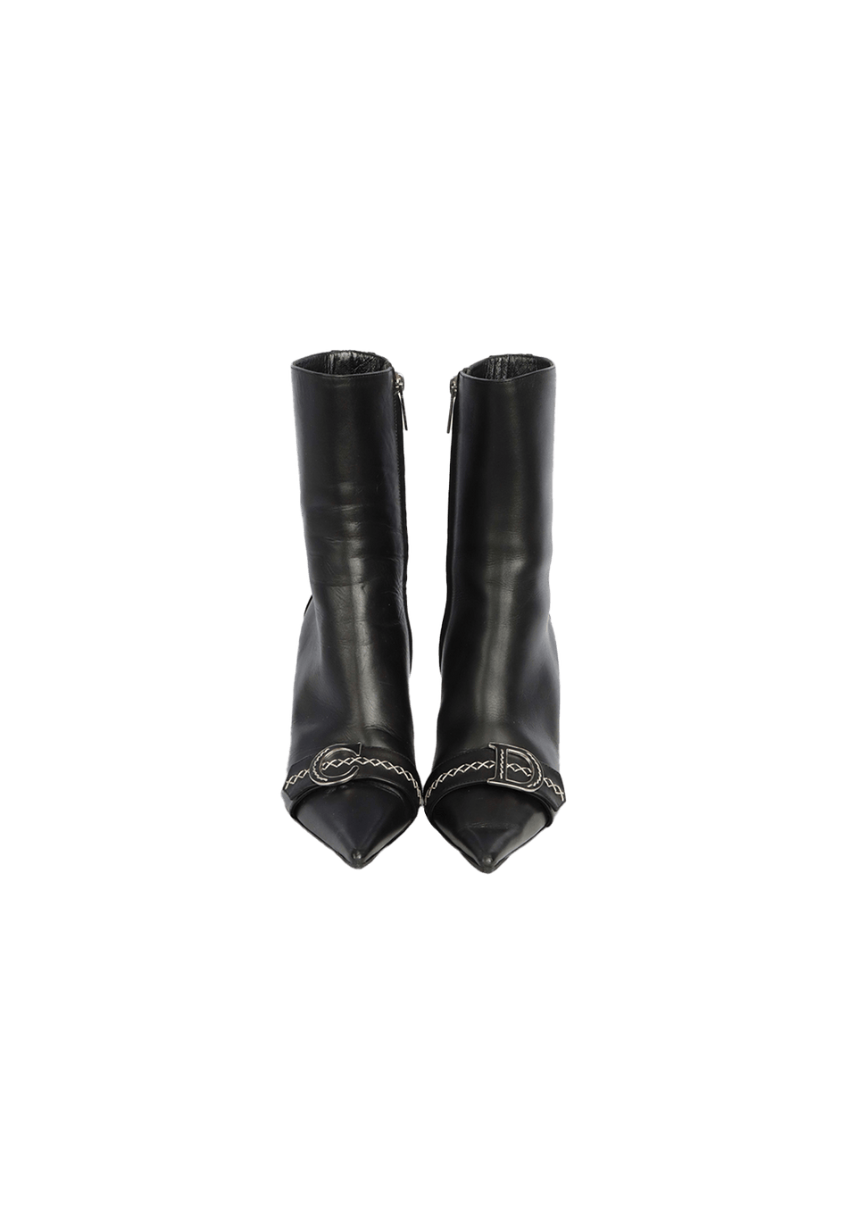 Condição: Regular. Apresenta fissuras severas no bico frontal do pé esquerdo, riscos fissuras pelo couro do cano do pé direito, manchas e riscos no couro interno, desgaste na sola e saltinho e ferragens com leve oxidação interna.