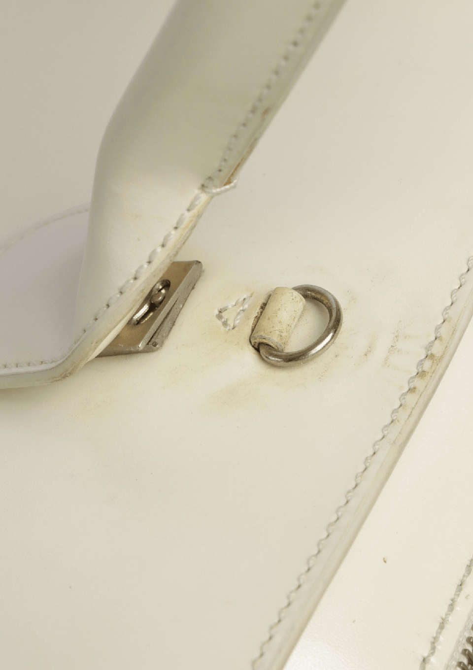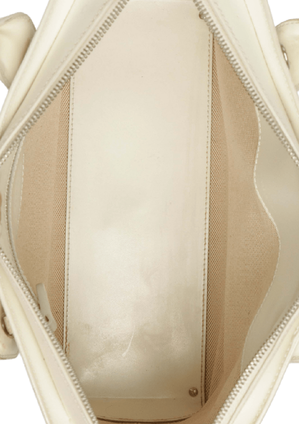 Condição: Regular. Apresenta riscos e manchas severamente escurecidas pelo couro externo, principalmente na base das alças de mão, manchas no forro do bolso, no couro interno e no couro das alças e leves manchas, opacidade e marcas de uso nas ferragens.