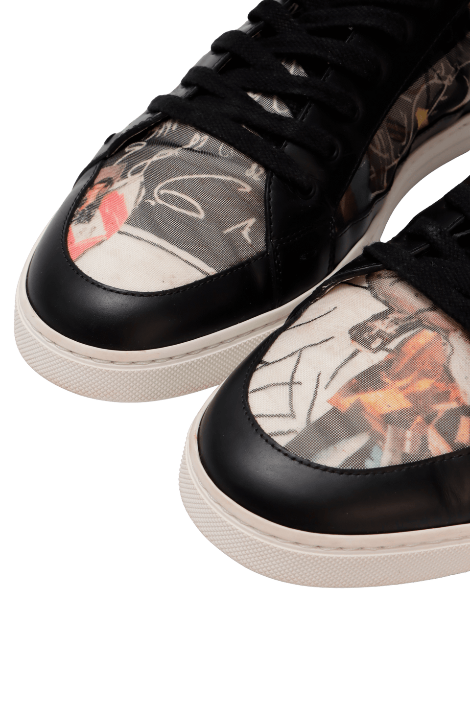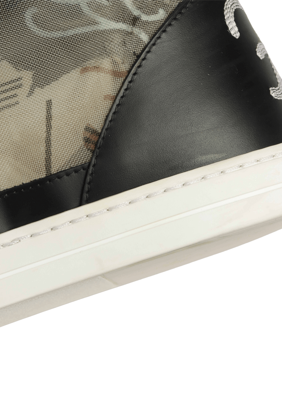 - Couro preto, tela estampada e borracha branca;
