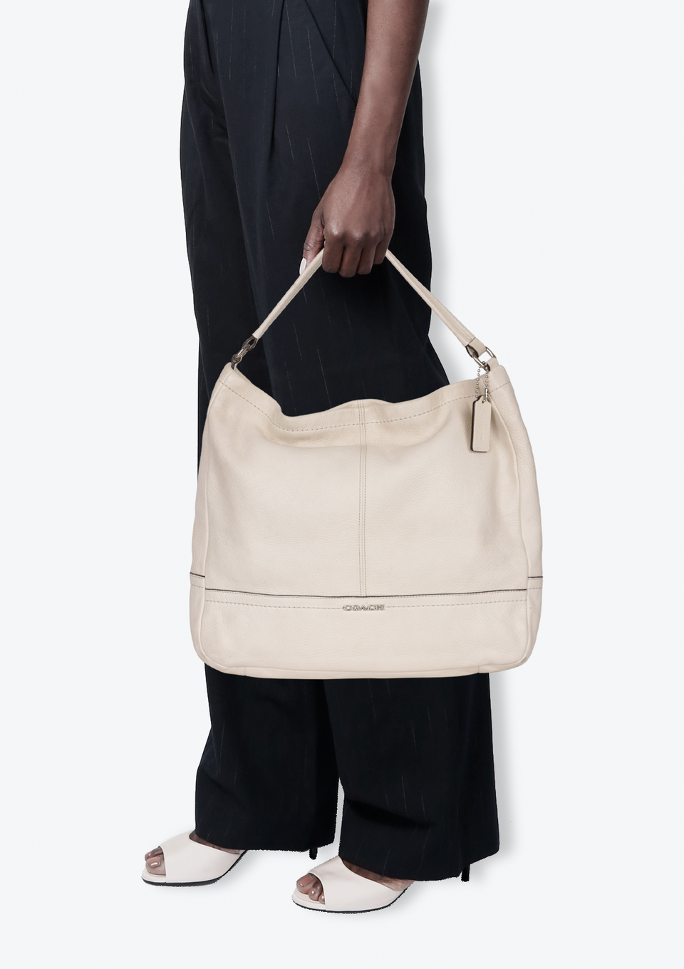 Bom, com aparência de usado. Apresenta leves desgastes, manchas e marcas de uso pelo couro, especialmente nos cantos da base, nas extremidades superiores, do lado esquerdo frontal, na alça e do lado esquerdo de trás, pequenas marcas de uso, descolorações e oxidações nas ferragens dos detalhes da alça, no puxador do cursor, na logo frontal e na tag de metal da marca, leves deformidades pela estrutura, principalmente nas laterais da base, nos cantos inferiores frontais, na alça e no canto inferior esquerdo de trás, pequenas fissuras e desgastes nas selagens da alça e nos acabamentos superiores laterais e leves manchas de uso e puídos pelo forro.