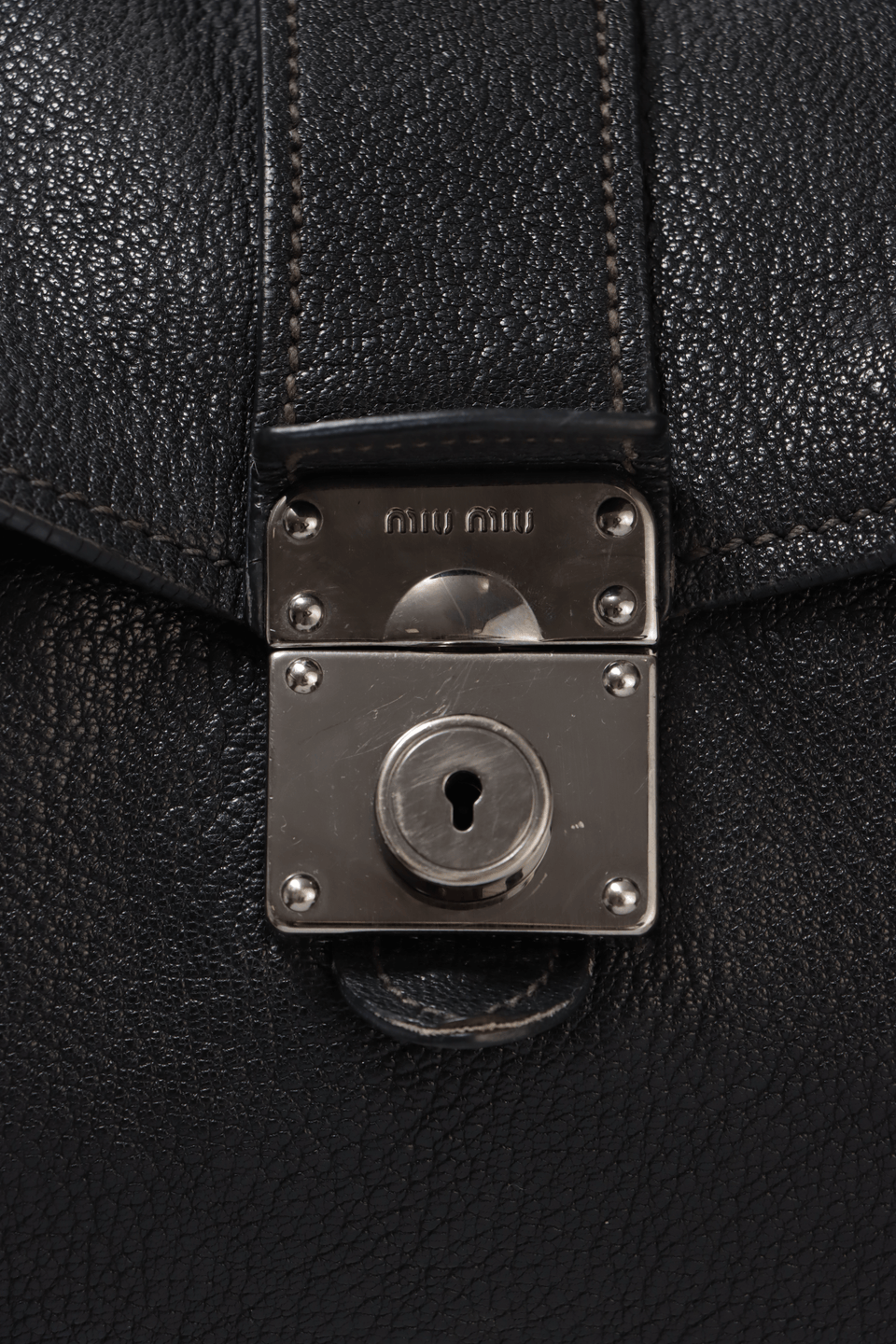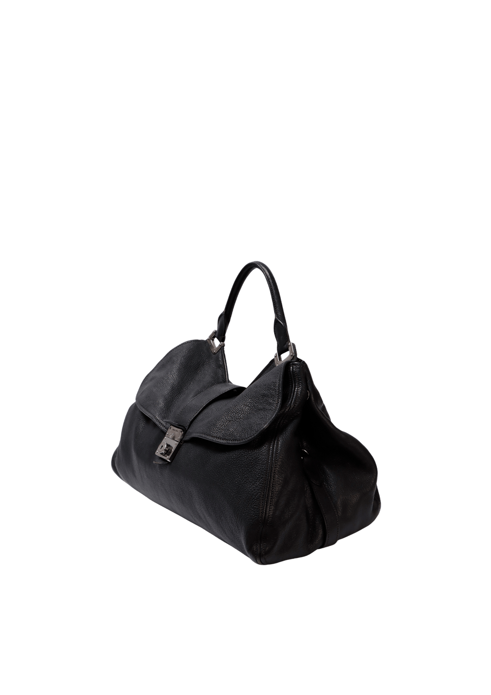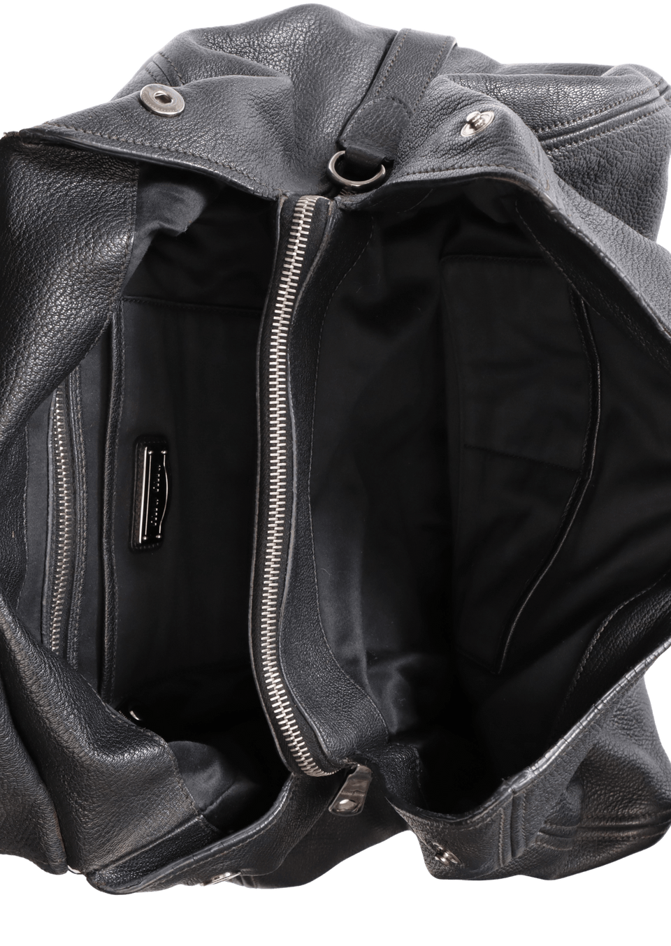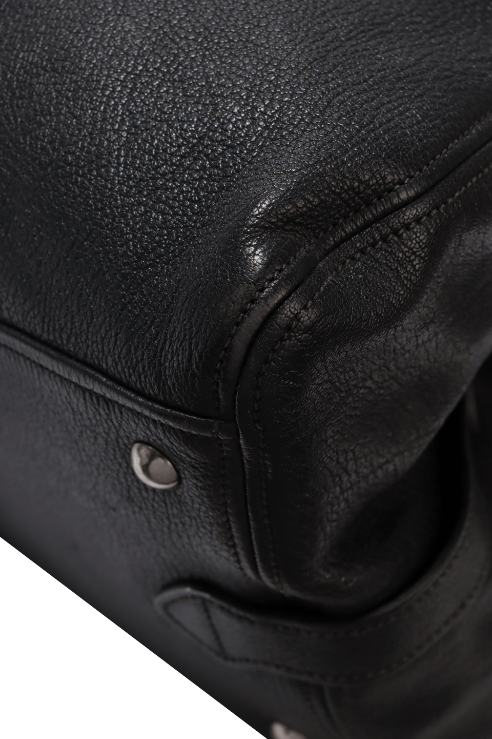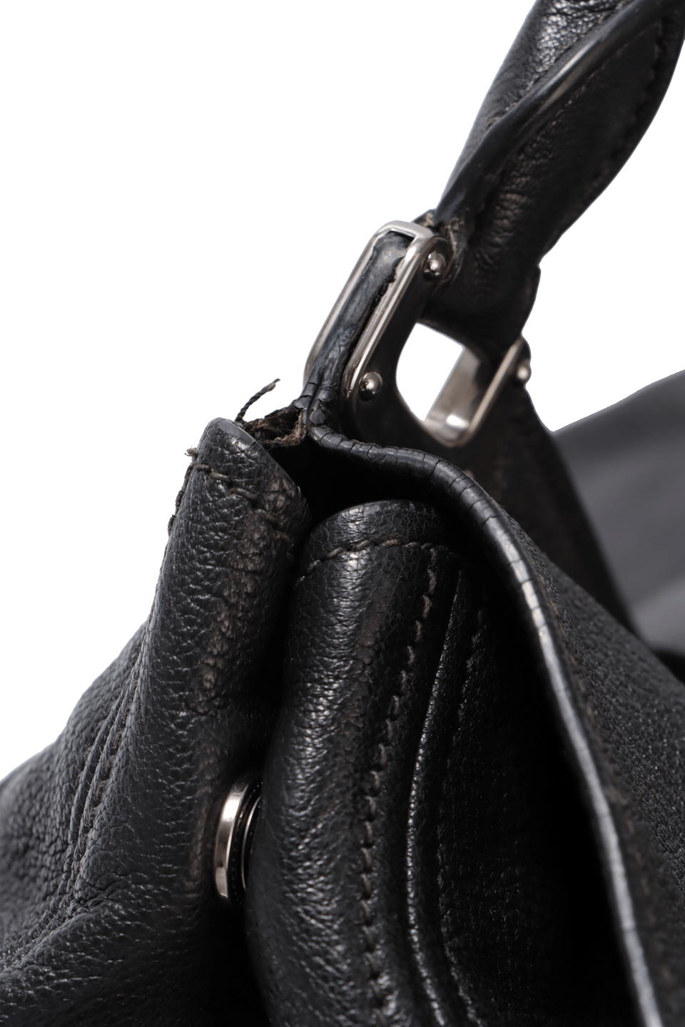 Regular. Apresenta severos desgastes, perda da tonalidade e manchas esbranquiçadas pelo couro, especialmente nos cantos da base e na aba, consideráveis desgastes e fissuras nas selagens, principalmente nos acabamentos laterais superiores e da alça, couro ressecado, notáveis marcas de uso nas ferragens, especialmente no fecho e consideráveis desgastes e manchas escurecidas e esbranquiçadas nas partes internas, principalmente no compartimento frontal.
