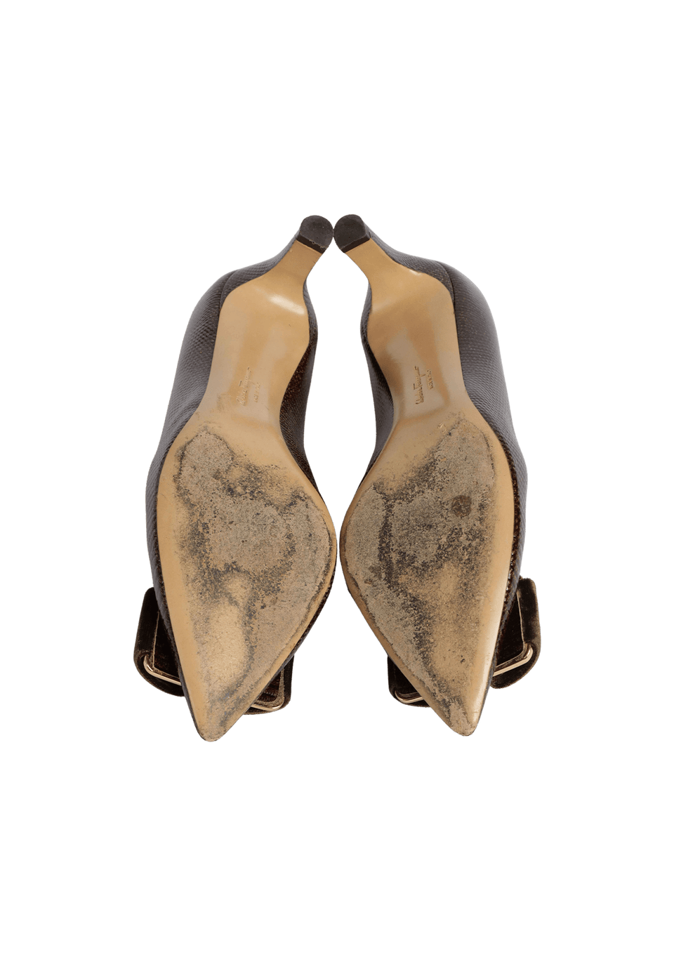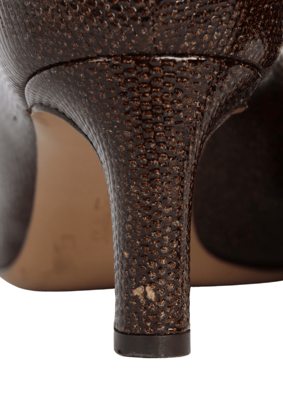 Condição: Regular. Apresenta manchas e desgastes aparentes nas solas, desgastes nos bicos, saltos e no veludo dos laços, marcas de uso nas palmilhas e parte interna e leves desgastes e leves oxidações nas ferragens.