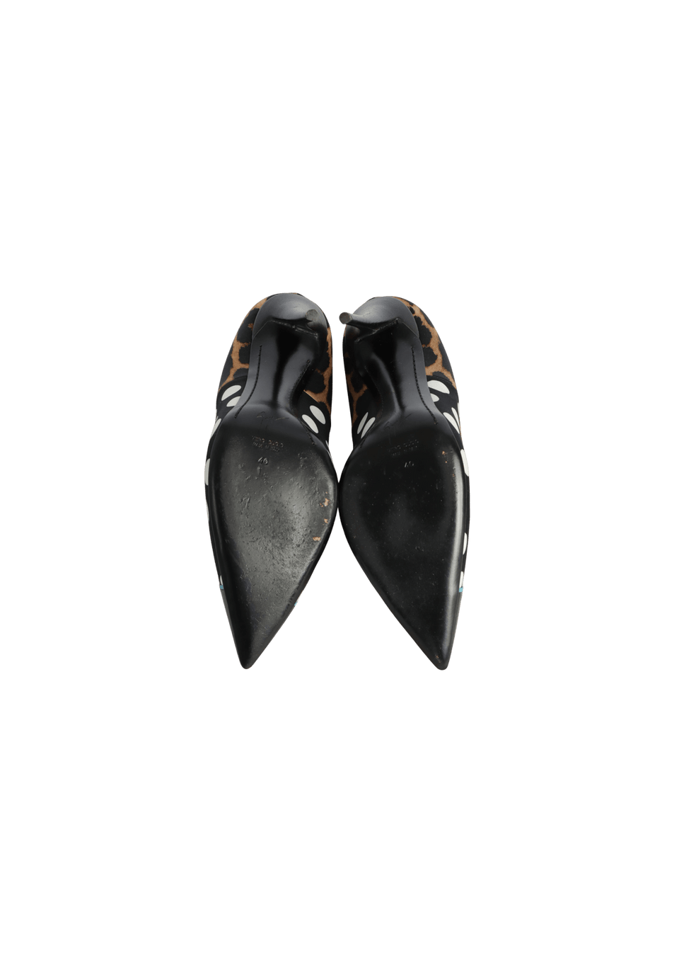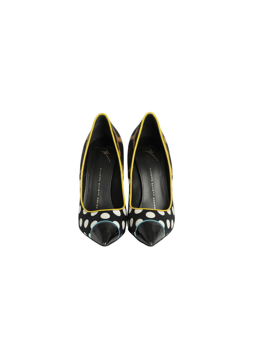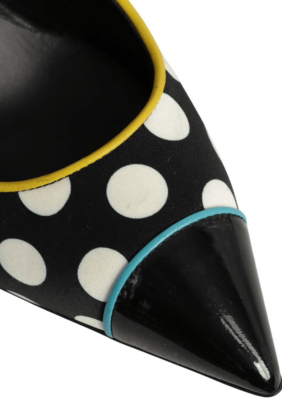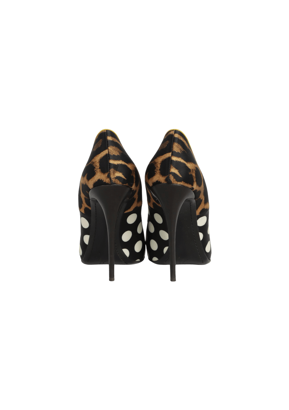 Condição: Bom, com aparência de usado. Apresenta pequenas manchas escurecidas na estampa de poá, leves desgastes nos saltos e marcas de uso nas solas.