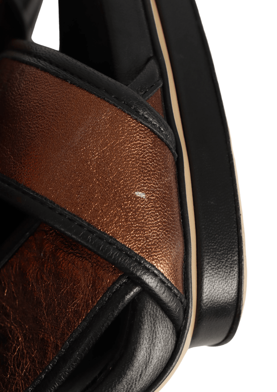Condição: Bom, com aparência de usado. Apresenta leves desgastes nas laterais da tira frontal, principalmente no pé direito, na parte inferior do salto do pé direito e nas extremidades da palmilha, principalmente na traseira do pé direito, e marcas de uso nas solas.