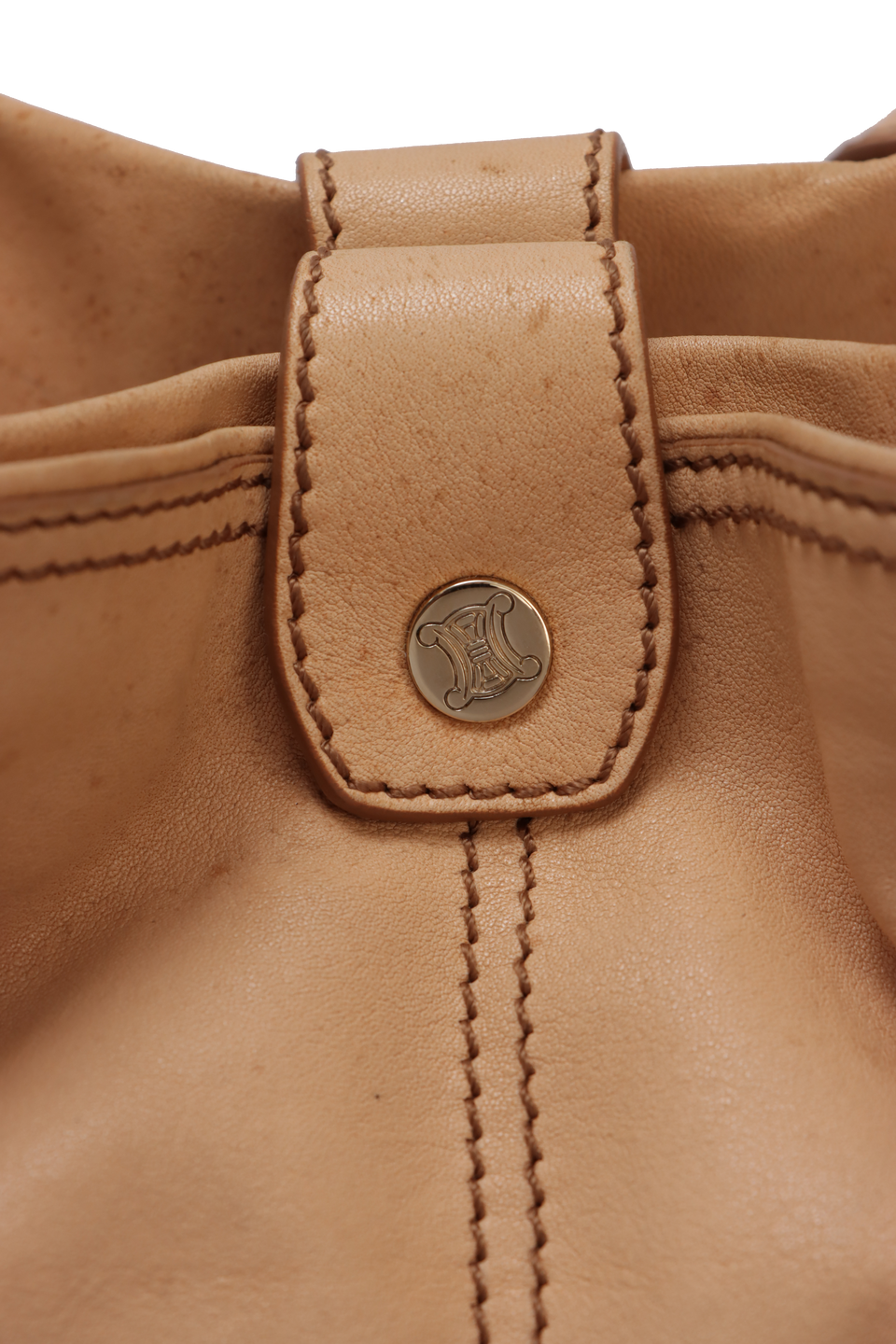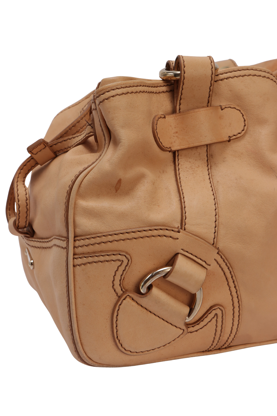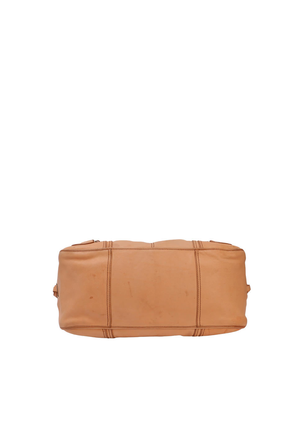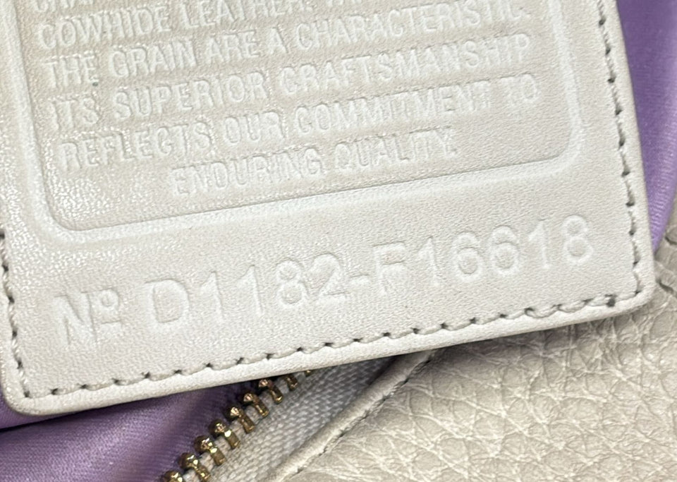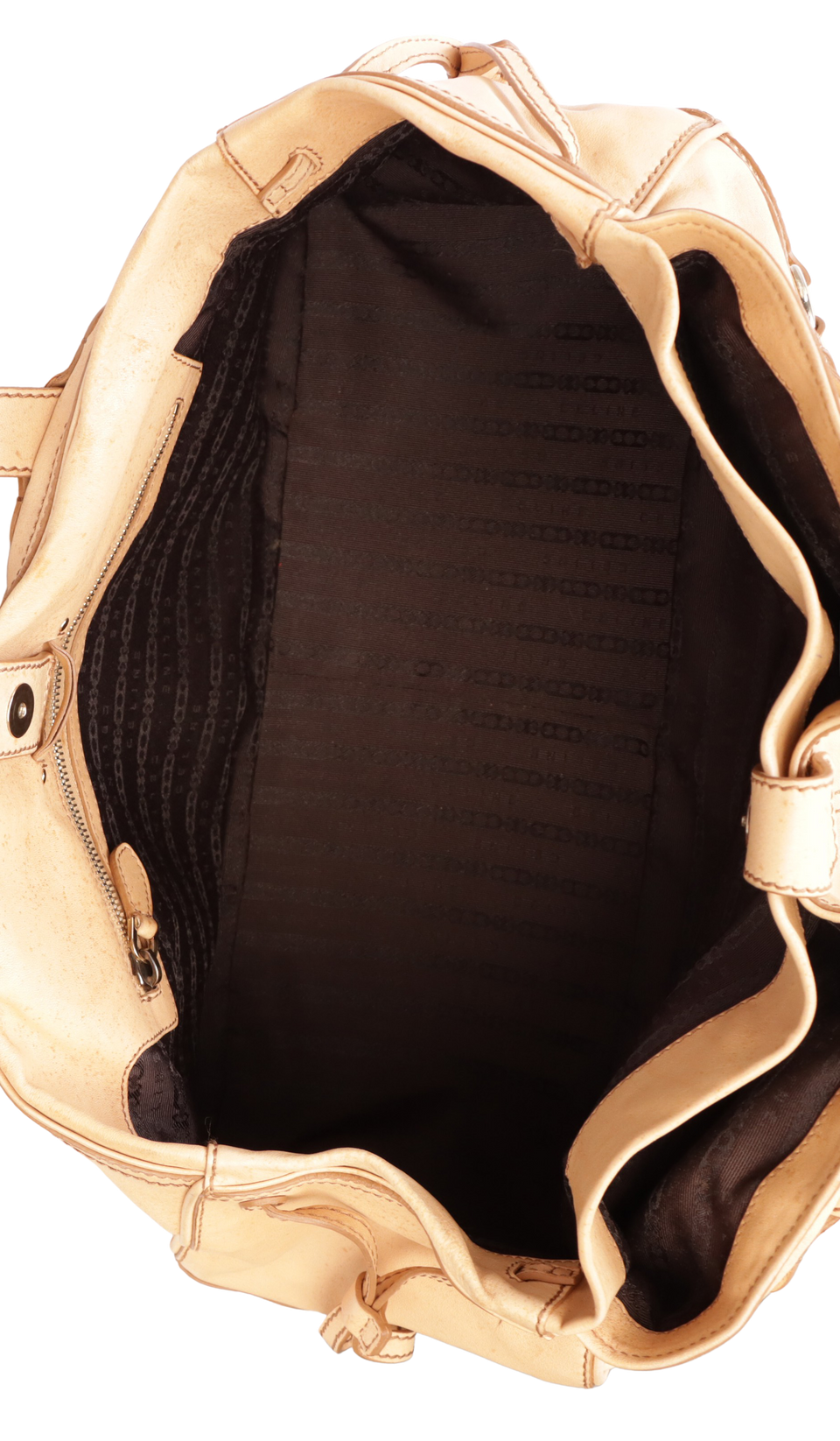 Regular. Apresenta severas manchas escurecidas e de mofo, desgastes e marcas de uso pelo couro, especialmente na parte frontal superior e na base, consideráveis fissuras e desgastes nas selagens, principalmente nos acabamentos inferiores das alças, notável deformação na estrutura, especialmente na lateral esquerda, consideráveis descolorações, oxidações e marcas de uso nas ferragens, principalmente nas argolas e no cursor, perceptíveis manchas de caneta nos acabamentos internos superiores, notáveis desgastes no forro e considerável odor de mofo.