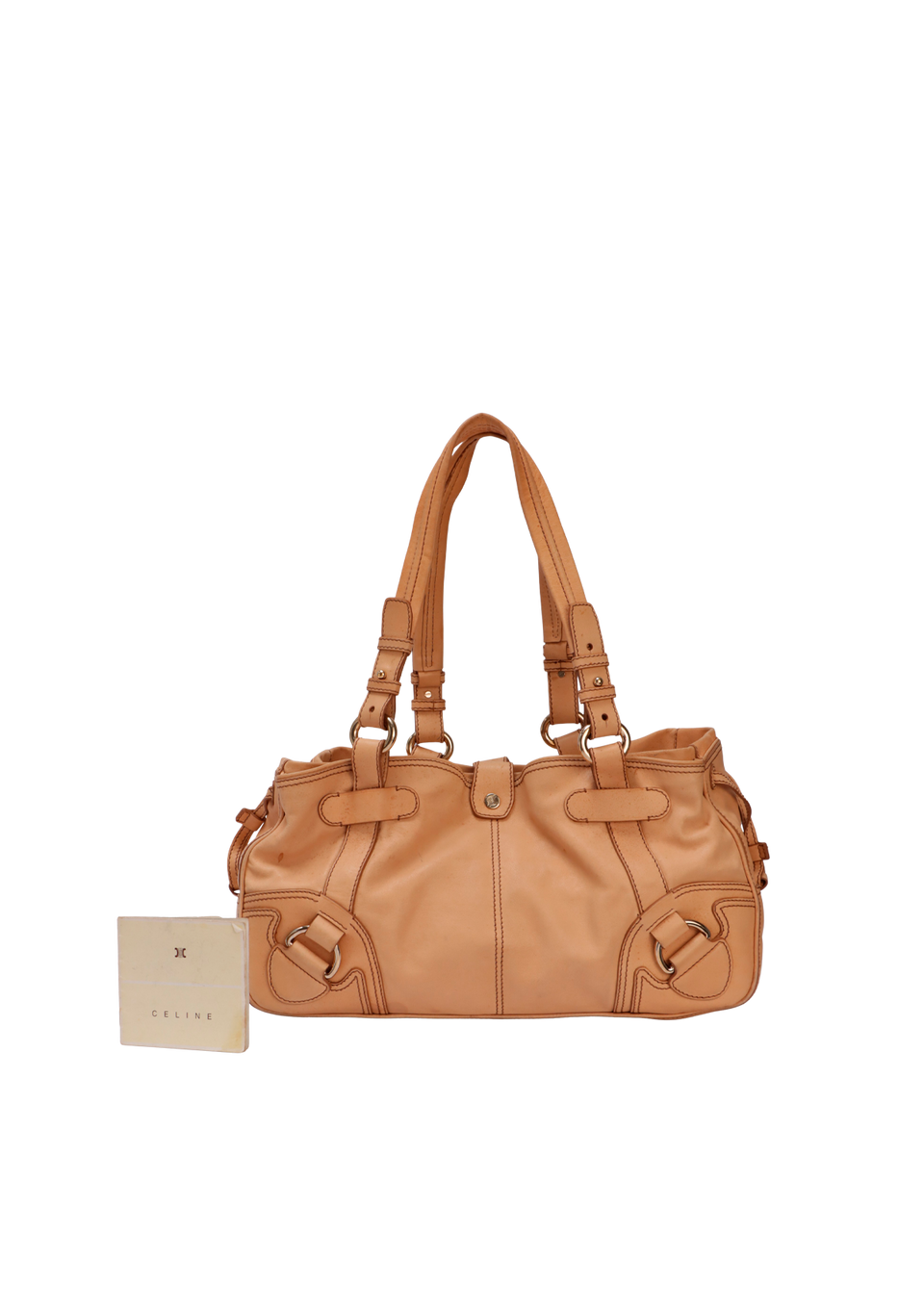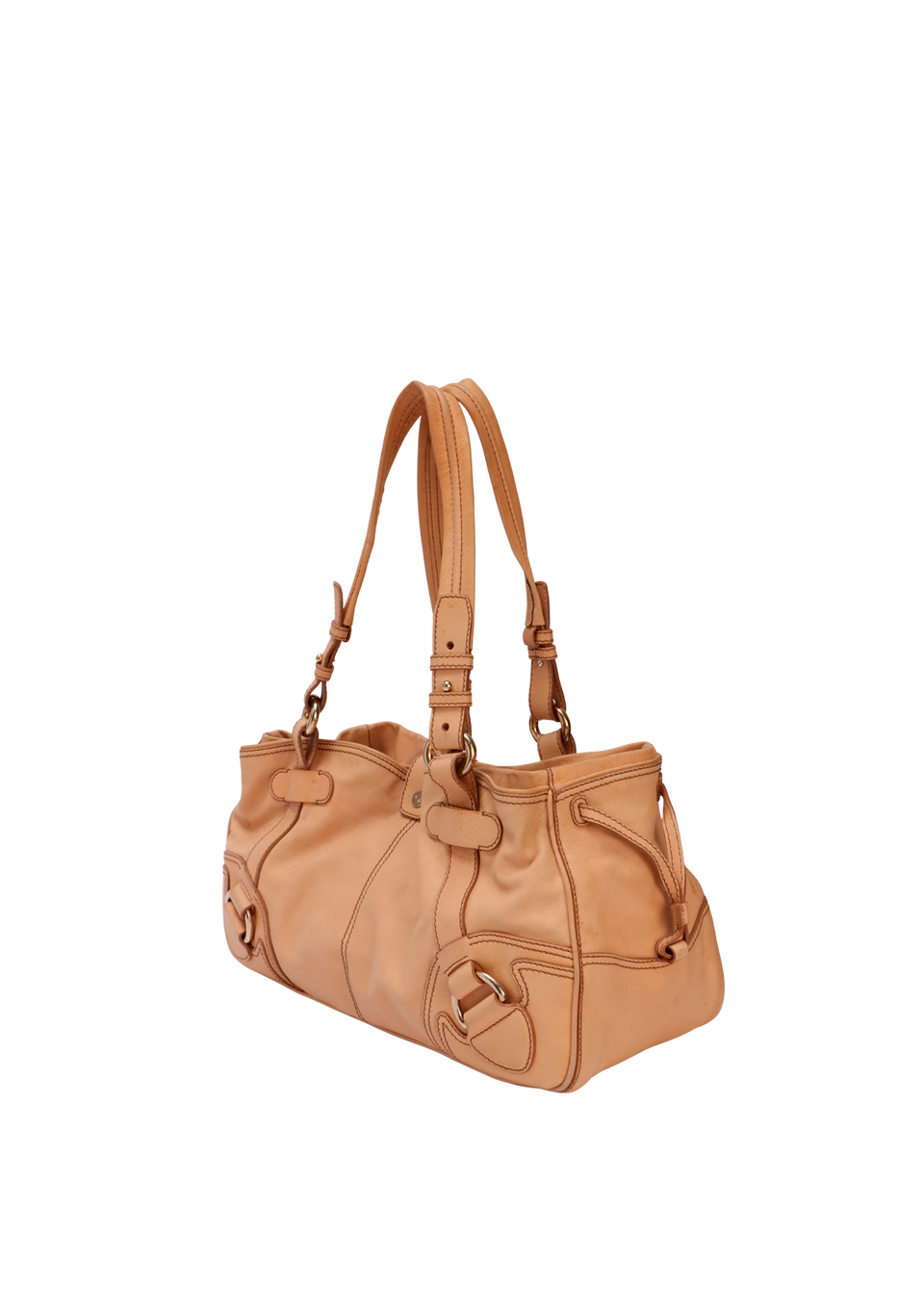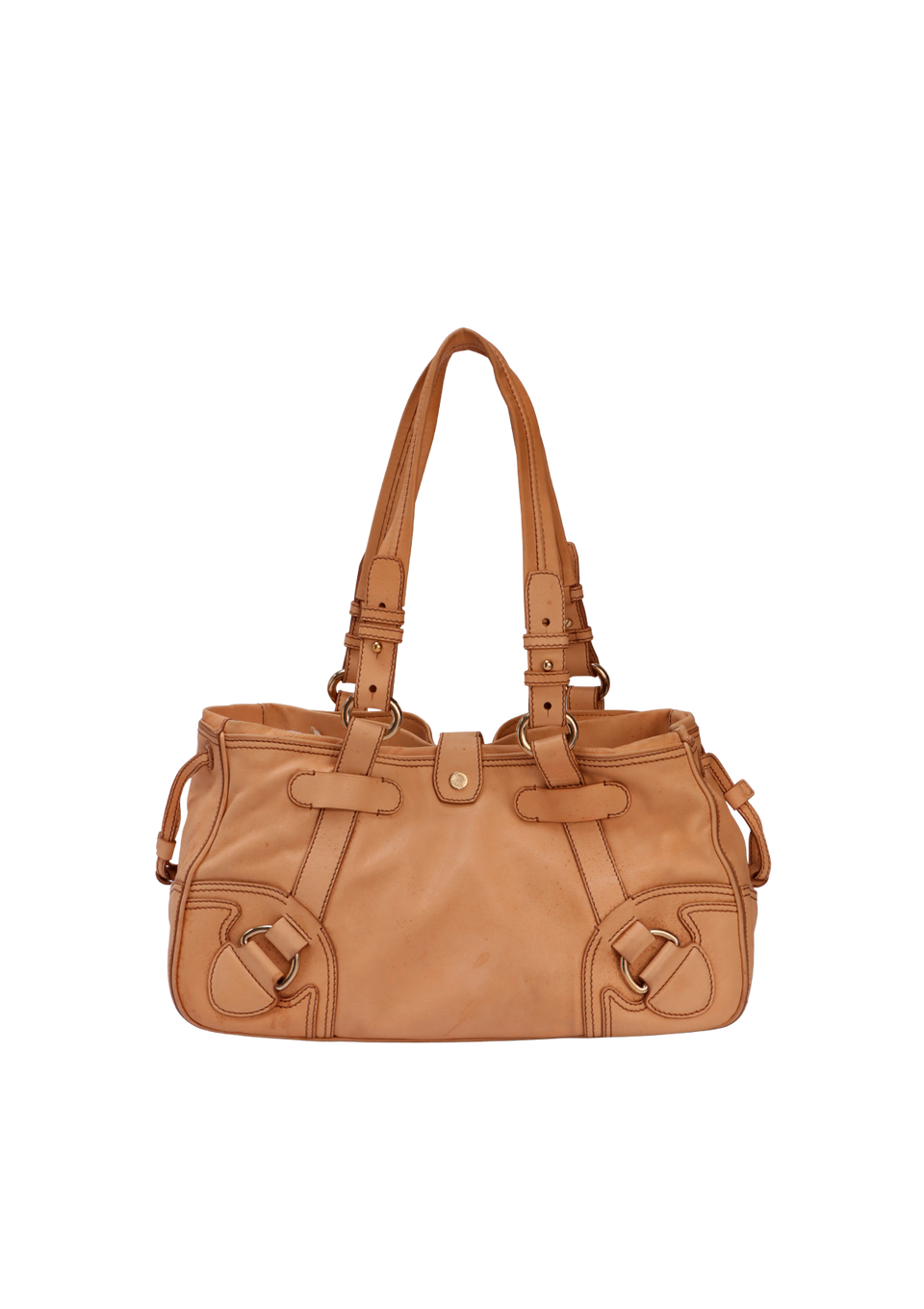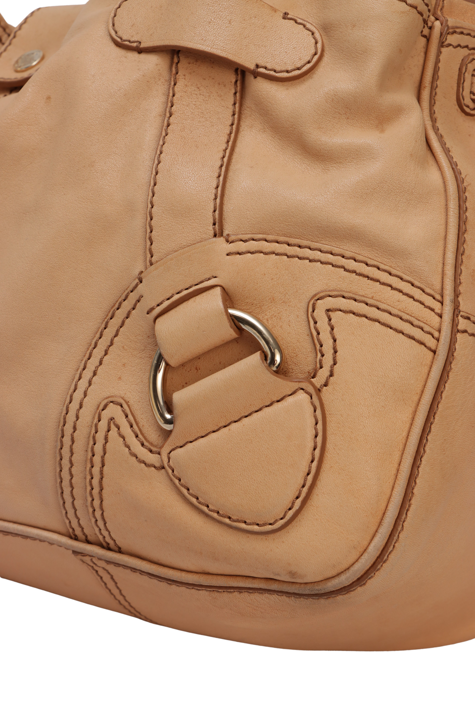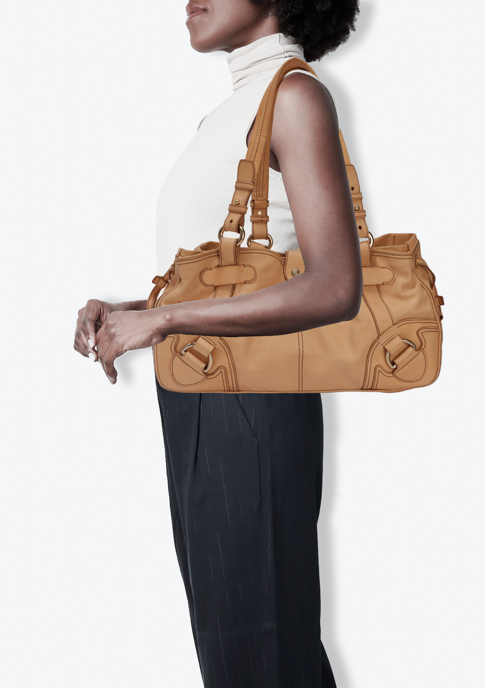Regular. Apresenta severas manchas escurecidas e de mofo, desgastes e marcas de uso pelo couro, especialmente na parte frontal superior e na base, consideráveis fissuras e desgastes nas selagens, principalmente nos acabamentos inferiores das alças, notável deformação na estrutura, especialmente na lateral esquerda, consideráveis descolorações, oxidações e marcas de uso nas ferragens, principalmente nas argolas e no cursor, perceptíveis manchas de caneta nos acabamentos internos superiores, notáveis desgastes no forro e considerável odor de mofo.