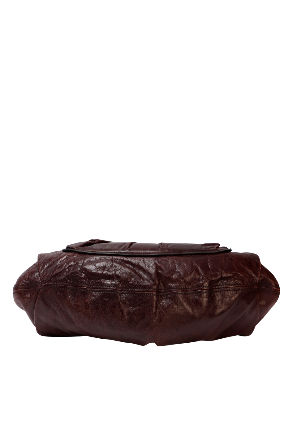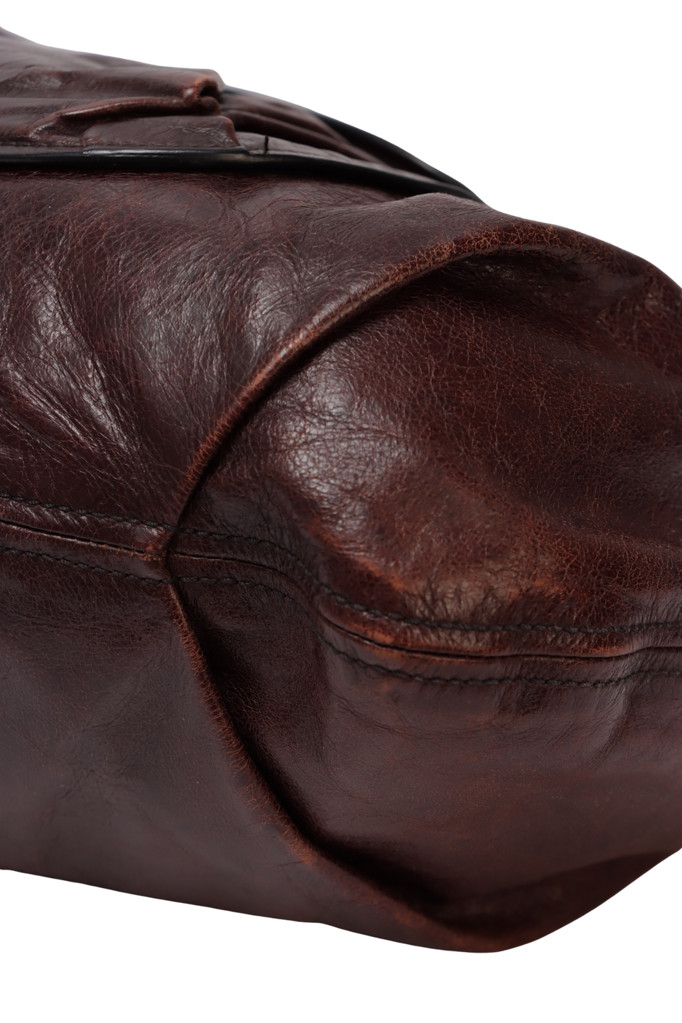 Regular. Apresenta severos desgastes pelo couro, especialmente n parte superior da aba de fechamento, extremidades inferiores e laterais, couro consideravelmente ressecado, notáveis marcas de oxidações e uso pelas ferragens, pequenas fissuras e marcas de uso na selagens das alças e leves manchas de uso pelo forro.