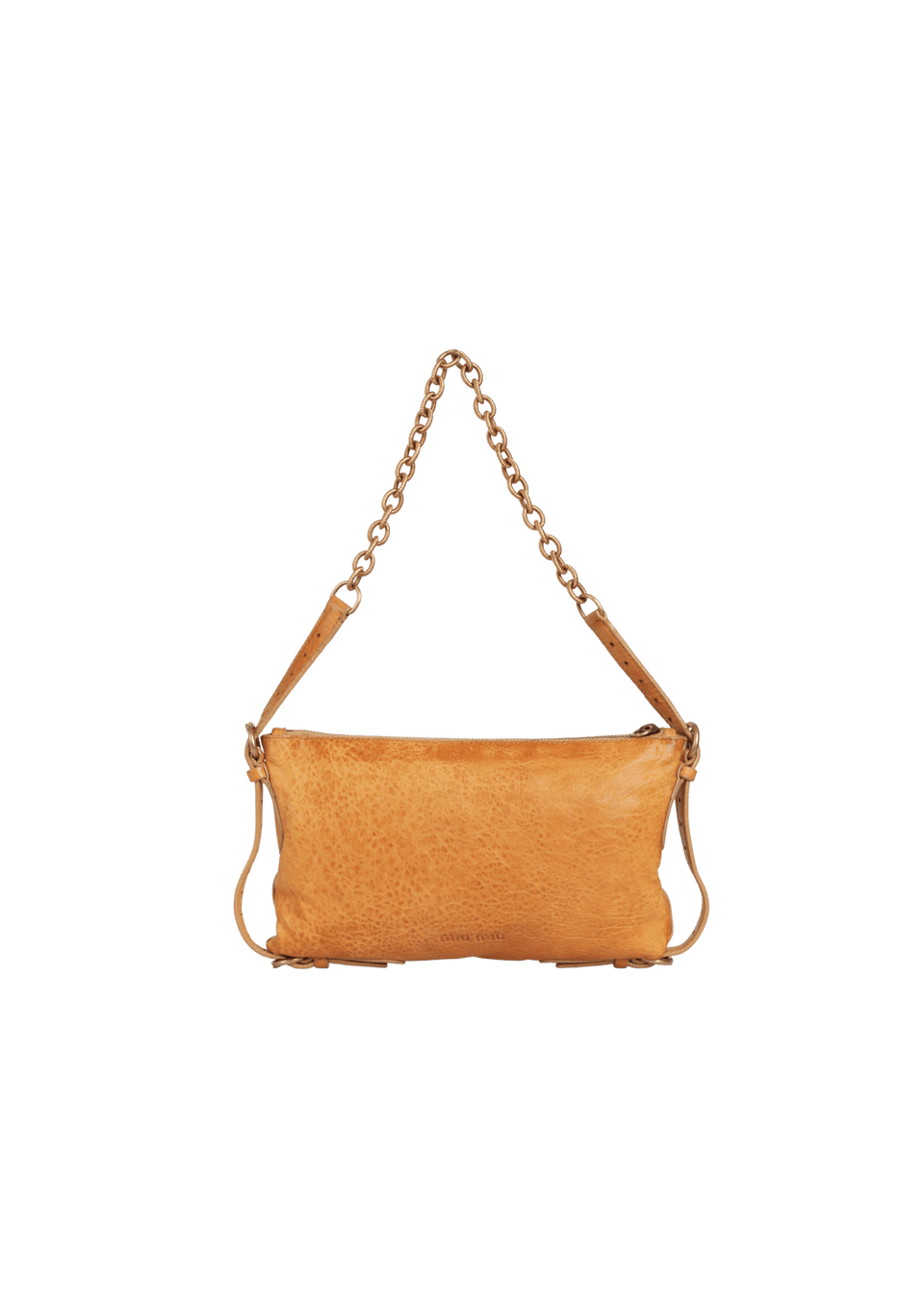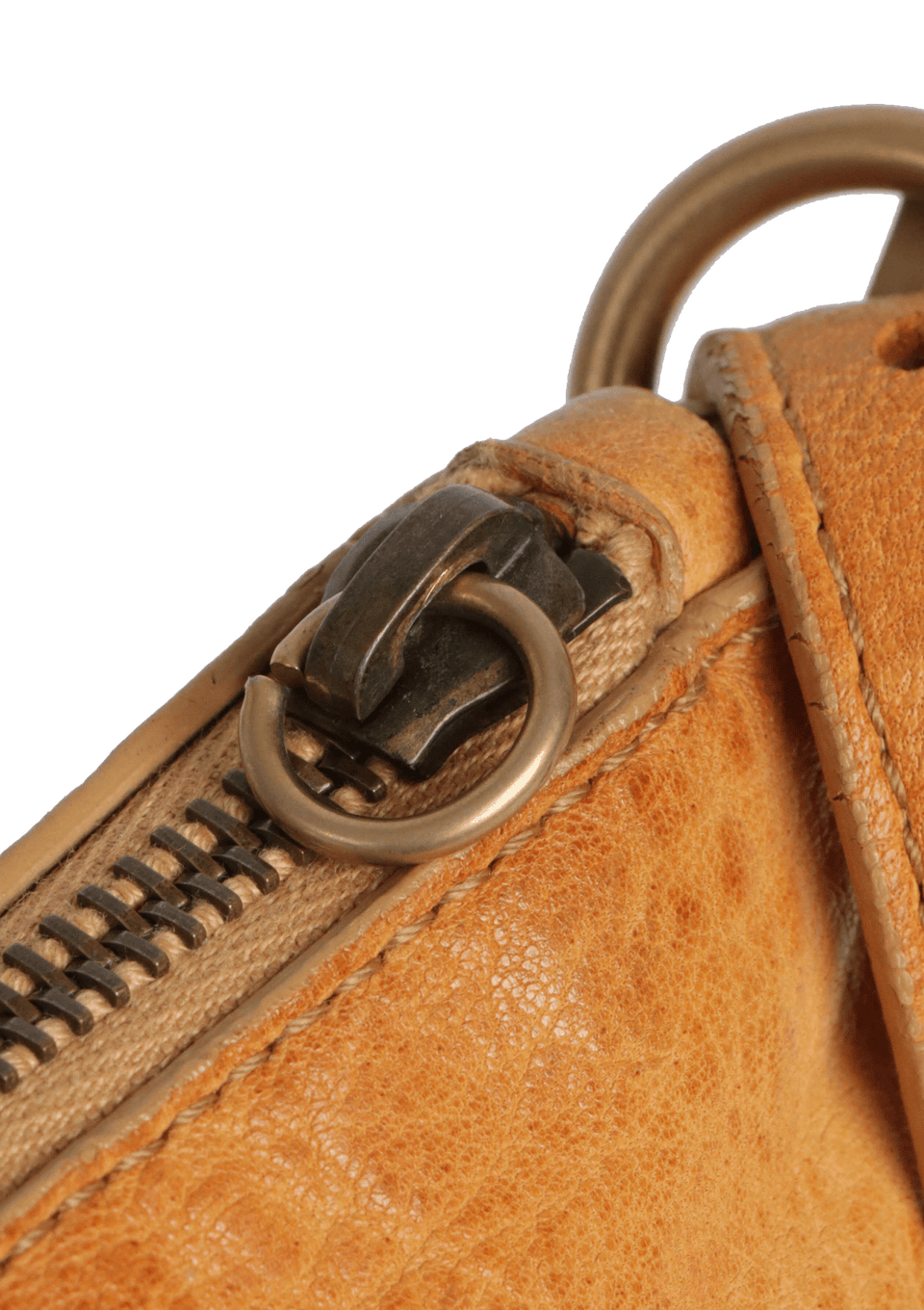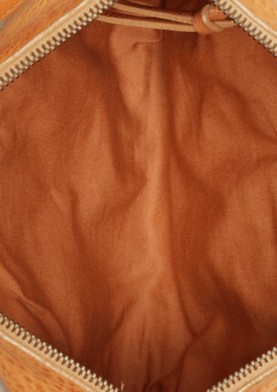 Condição: Regular, faltando item. Apresenta ausência de puxador no cursor principal, manchas, desgastes e alteração de tonalidade severa no couro externo e no couro da alça, fissuras e craquelamento nas selagens da alça, oxidações nas ferragens e manchas, desbotamentos e fios puxados no forro.