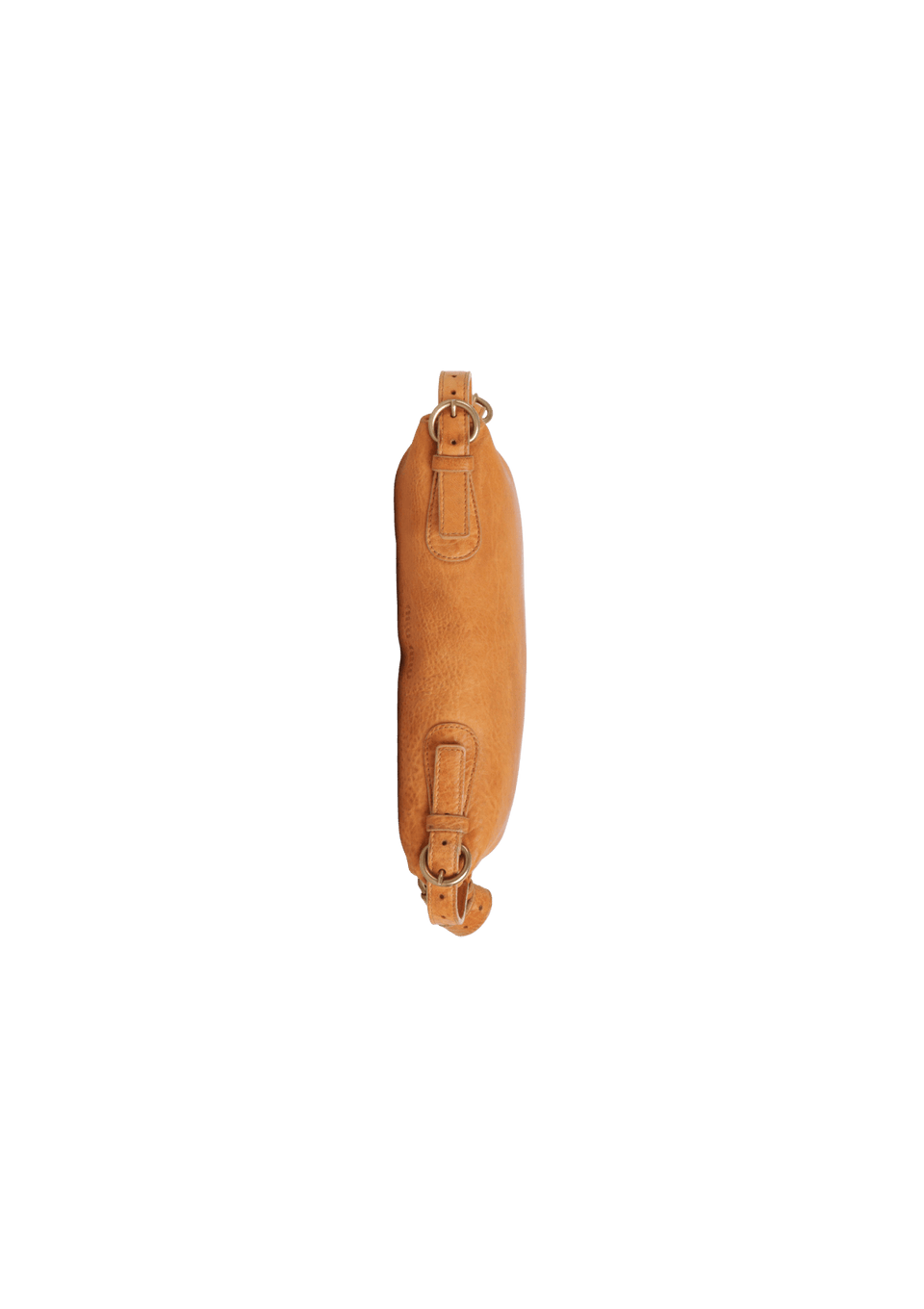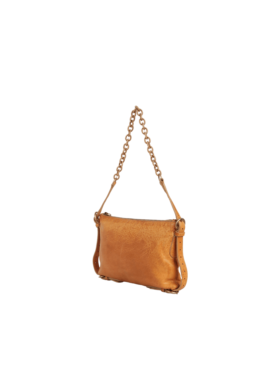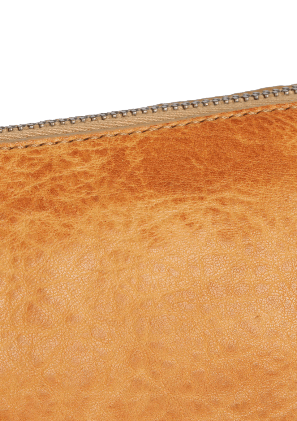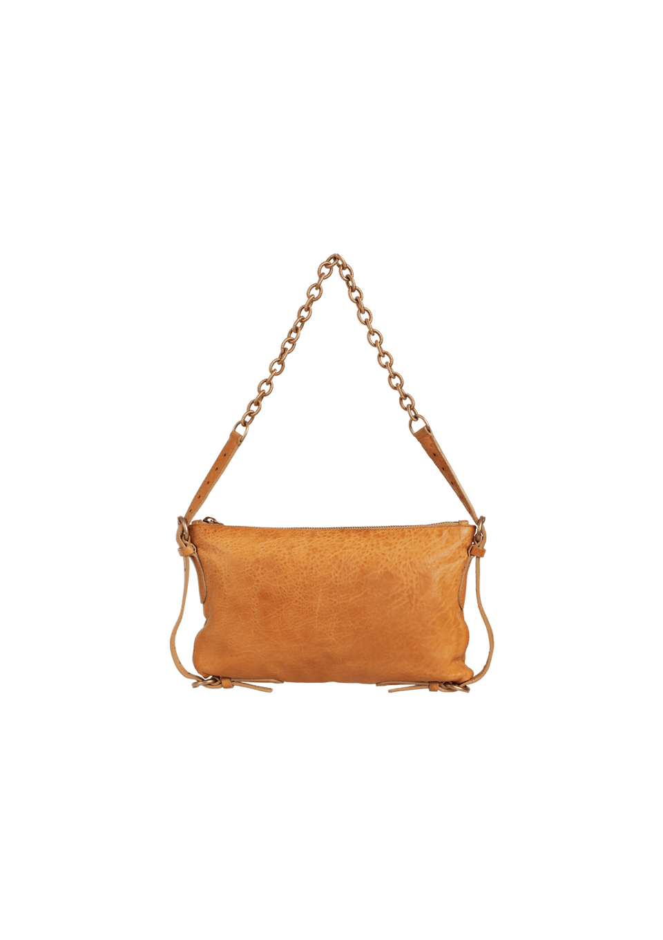 Condição: Regular, faltando item. Apresenta ausência de puxador no cursor principal, manchas, desgastes e alteração de tonalidade severa no couro externo e no couro da alça, fissuras e craquelamento nas selagens da alça, oxidações nas ferragens e manchas, desbotamentos e fios puxados no forro.