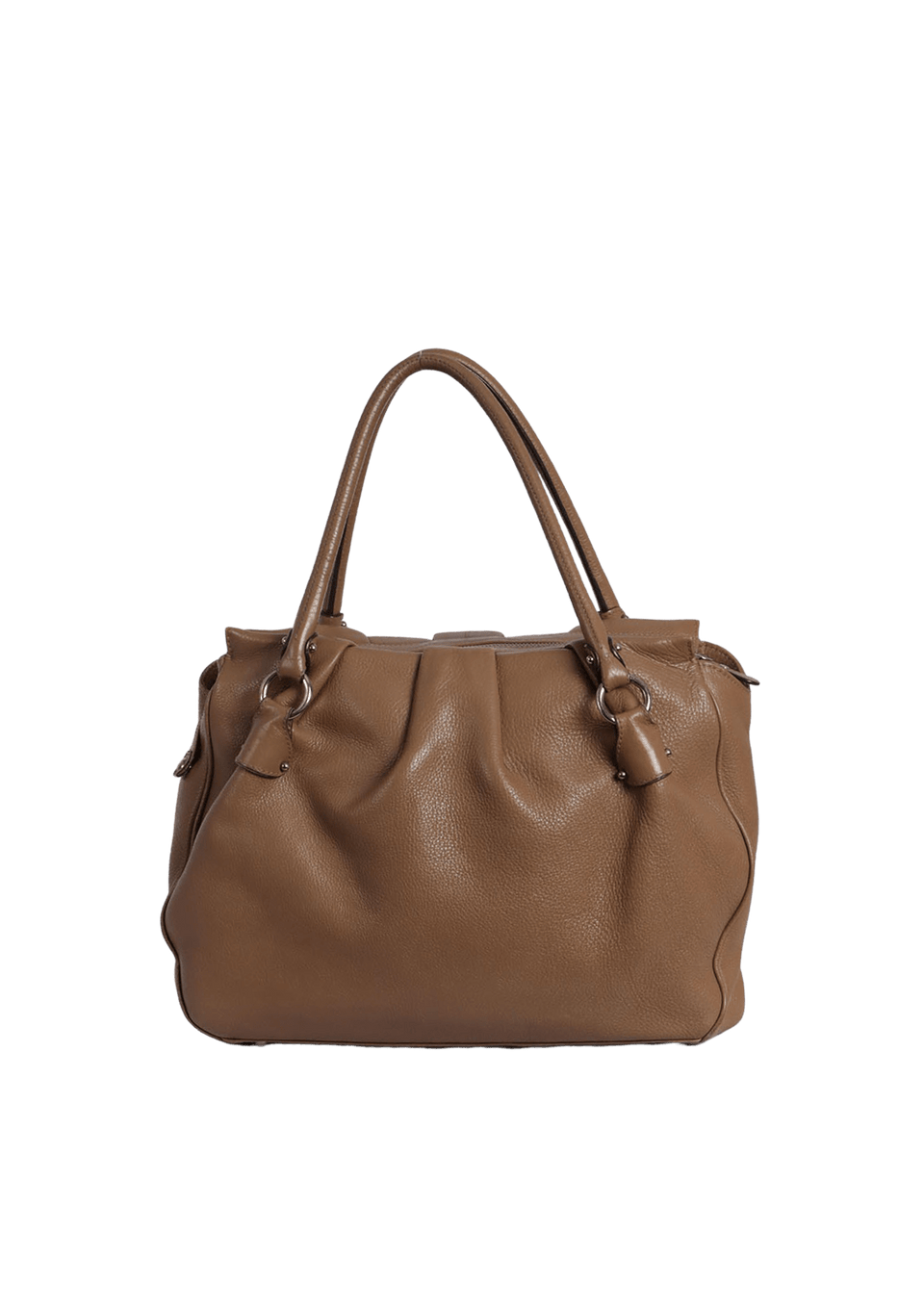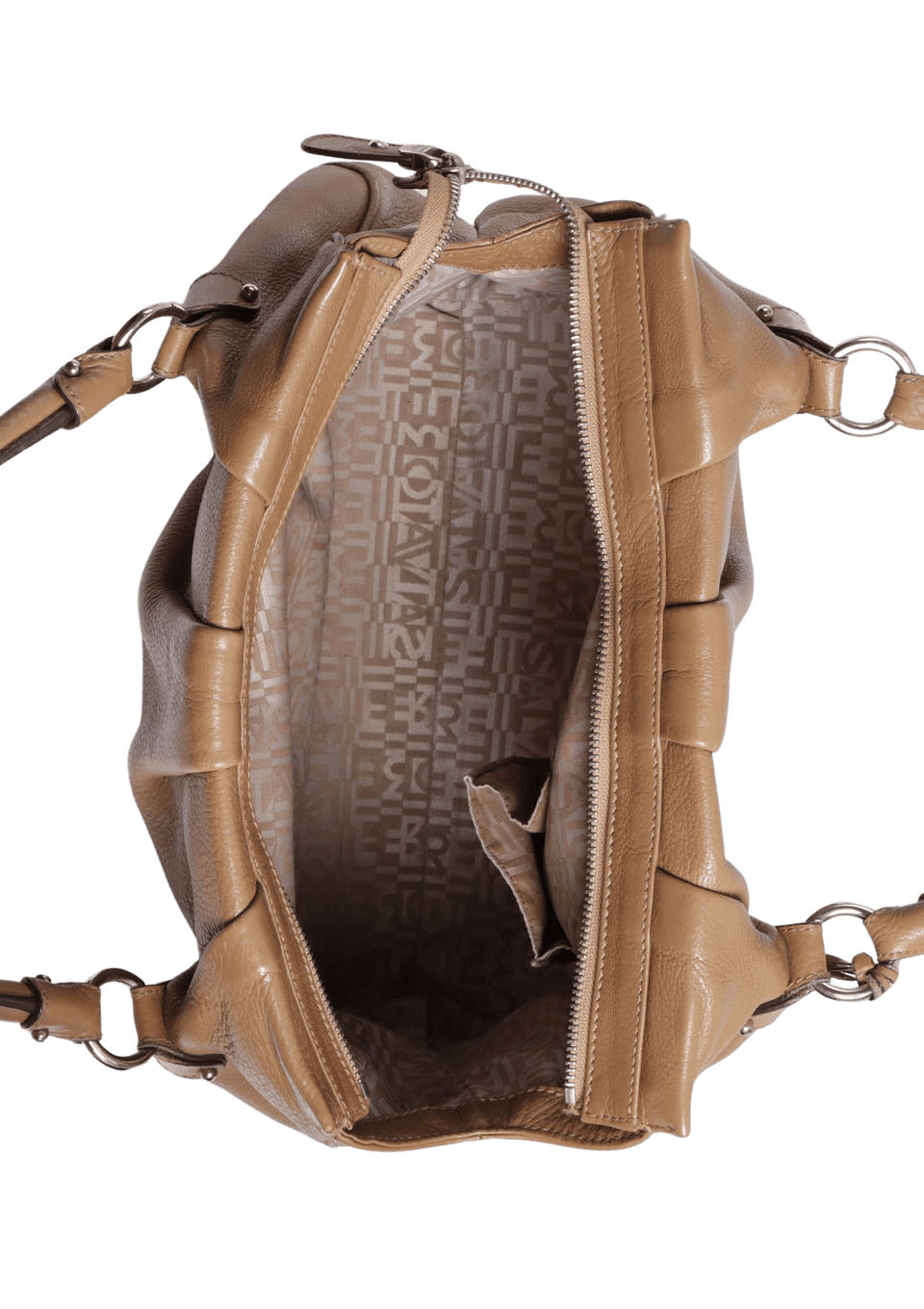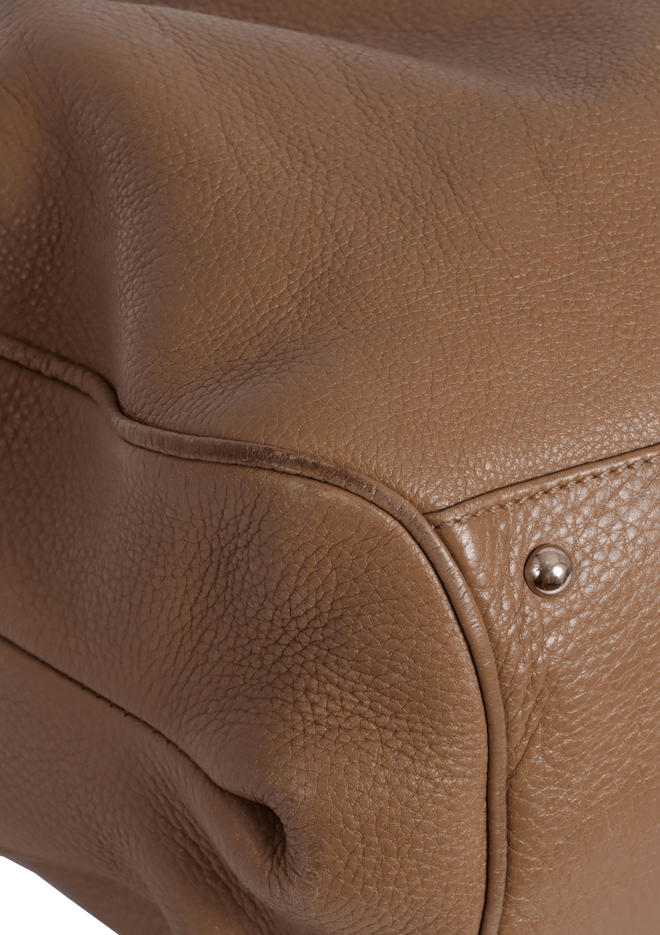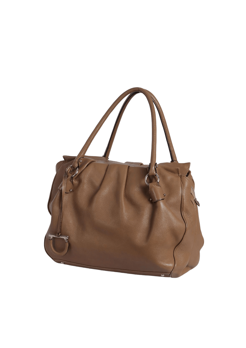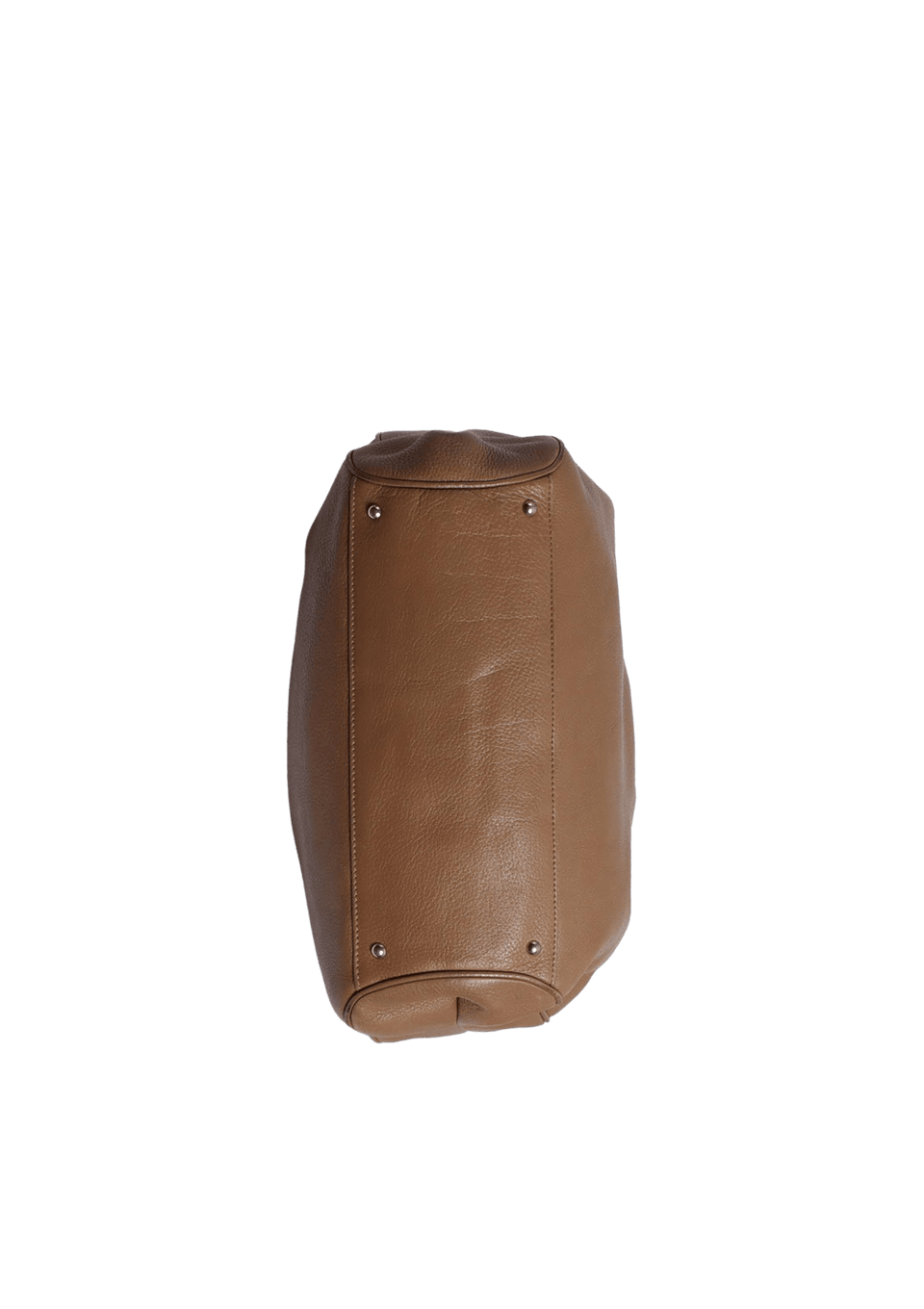 Condição: Regular. Apresenta considerável perda da estrutura original da bolsa, consideráveis desgastes nas ferragens, notáveis marcas de uso no couro, especialmente desgastes e manchas escurecidas nos cantos inferiores, consideráveis desgastes nas selagens das alças, notáveis manchas amareladas e escurecidas no forro e notável odor característico de item guardado.