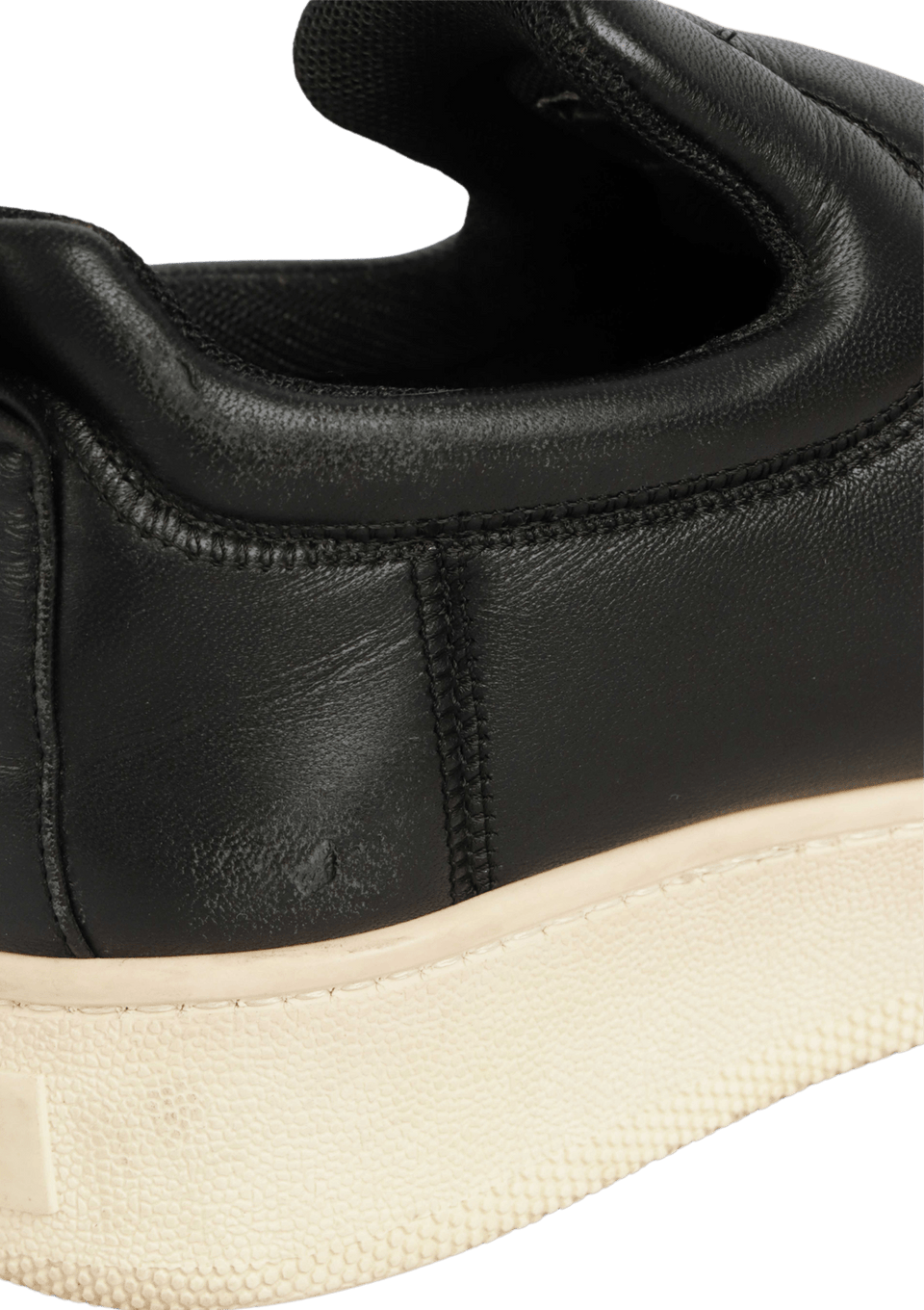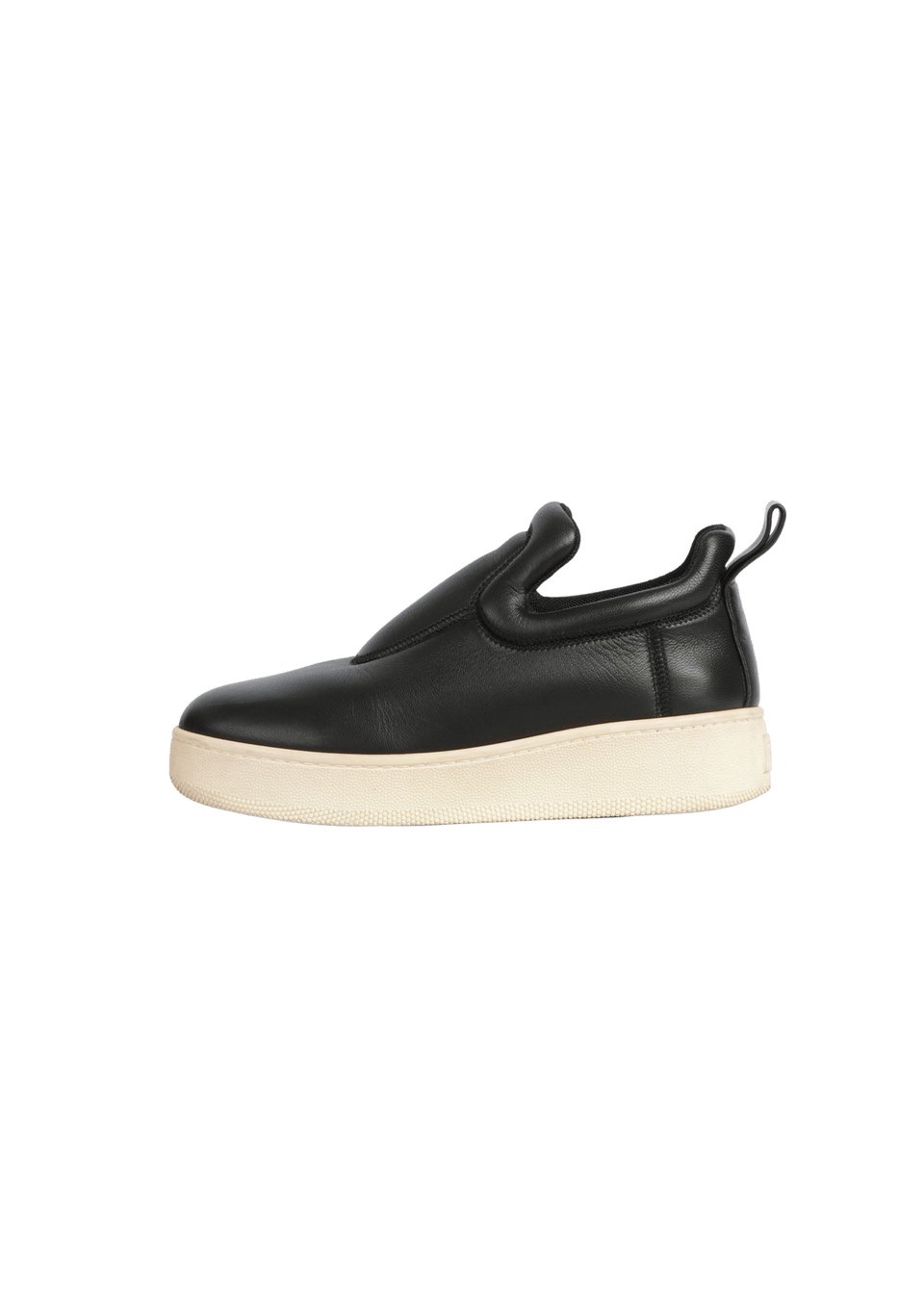 - Couro preto e borracha bege.