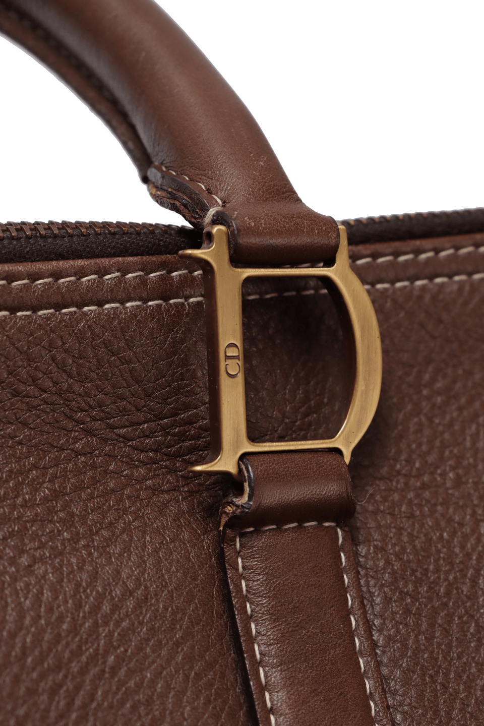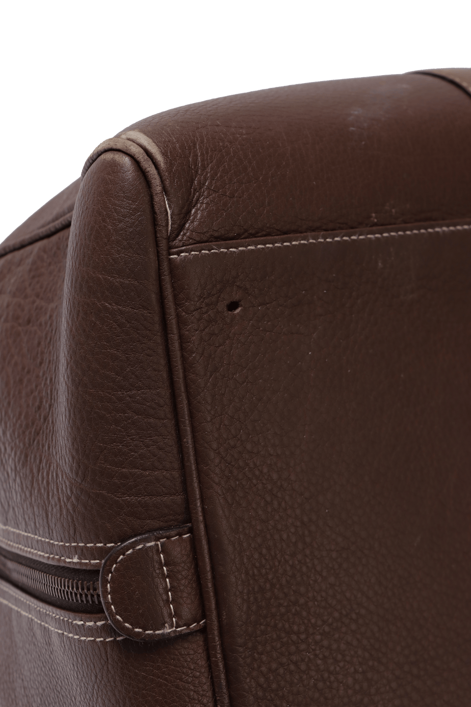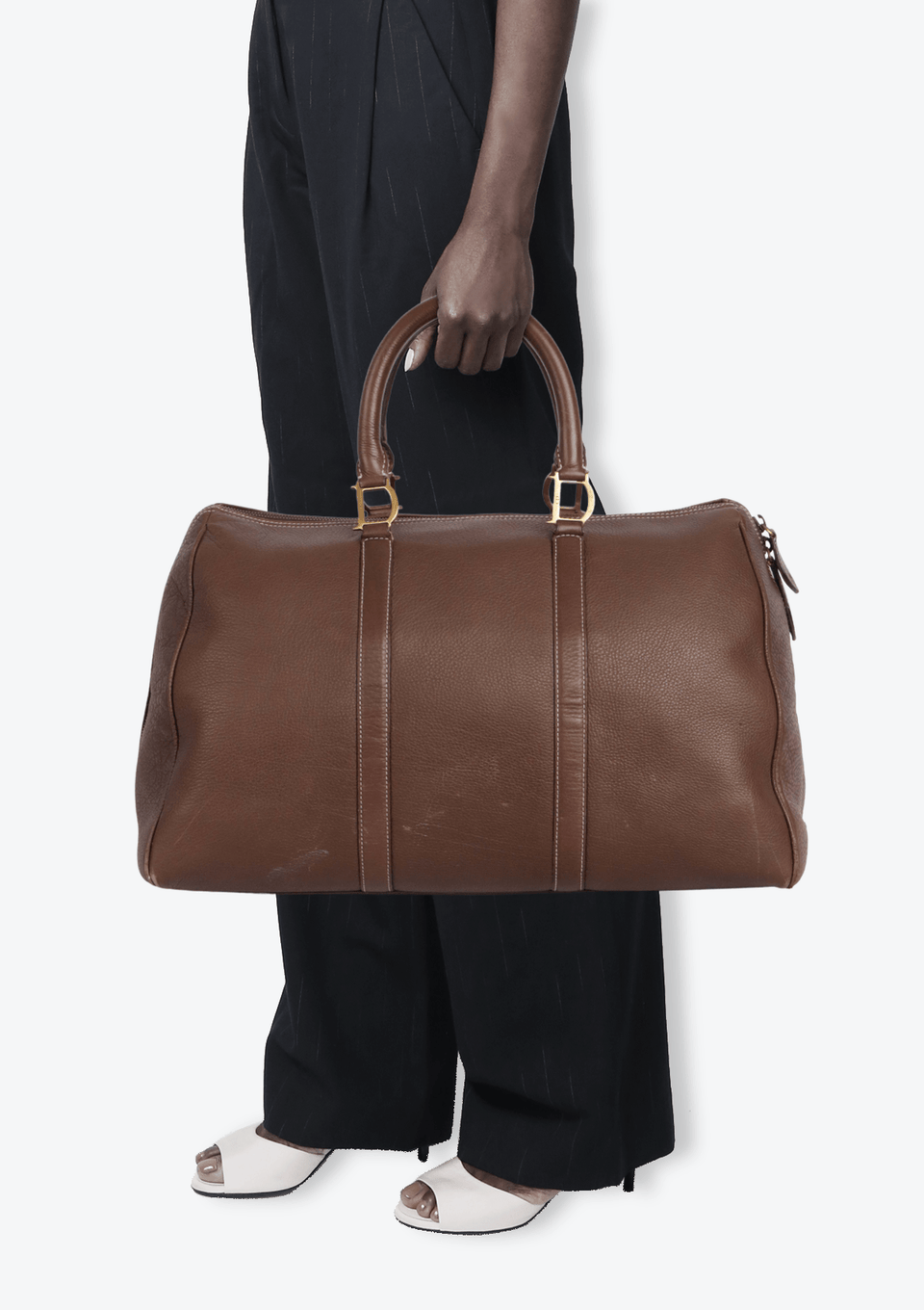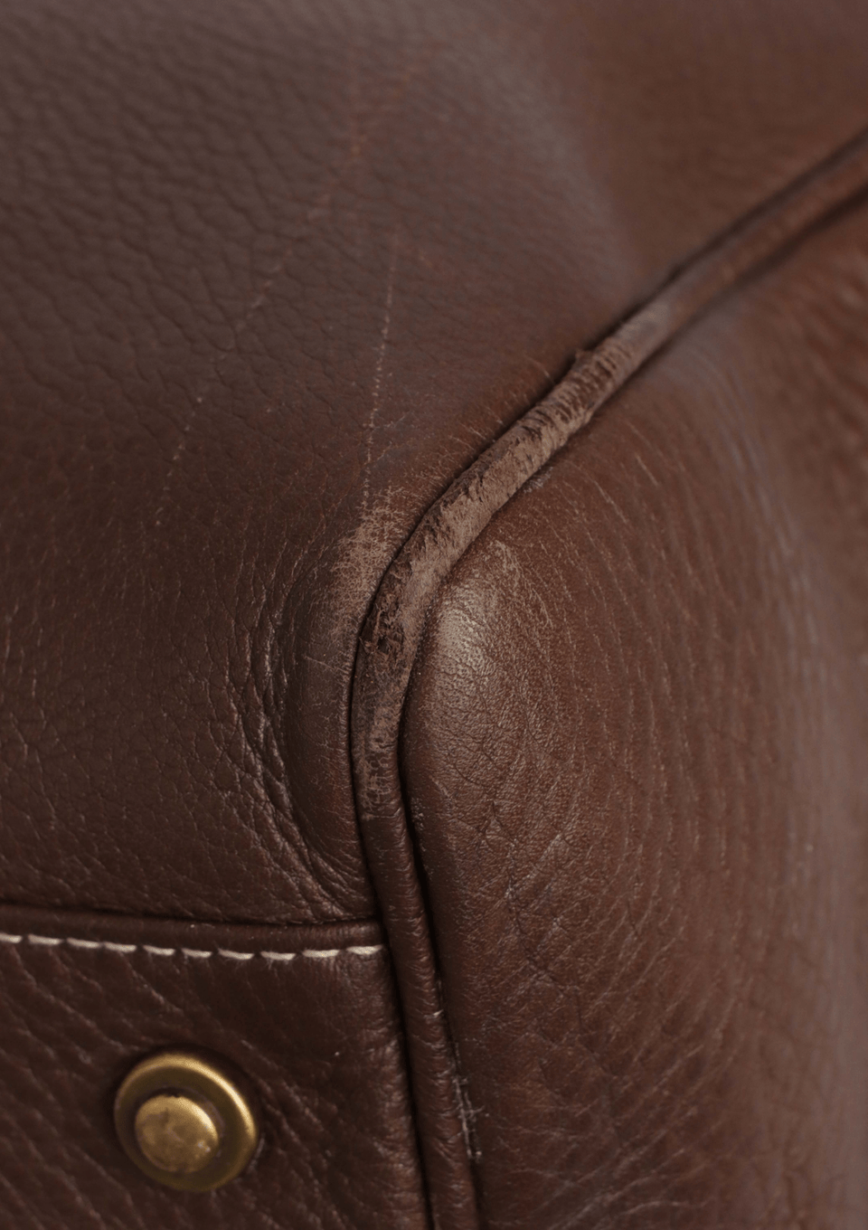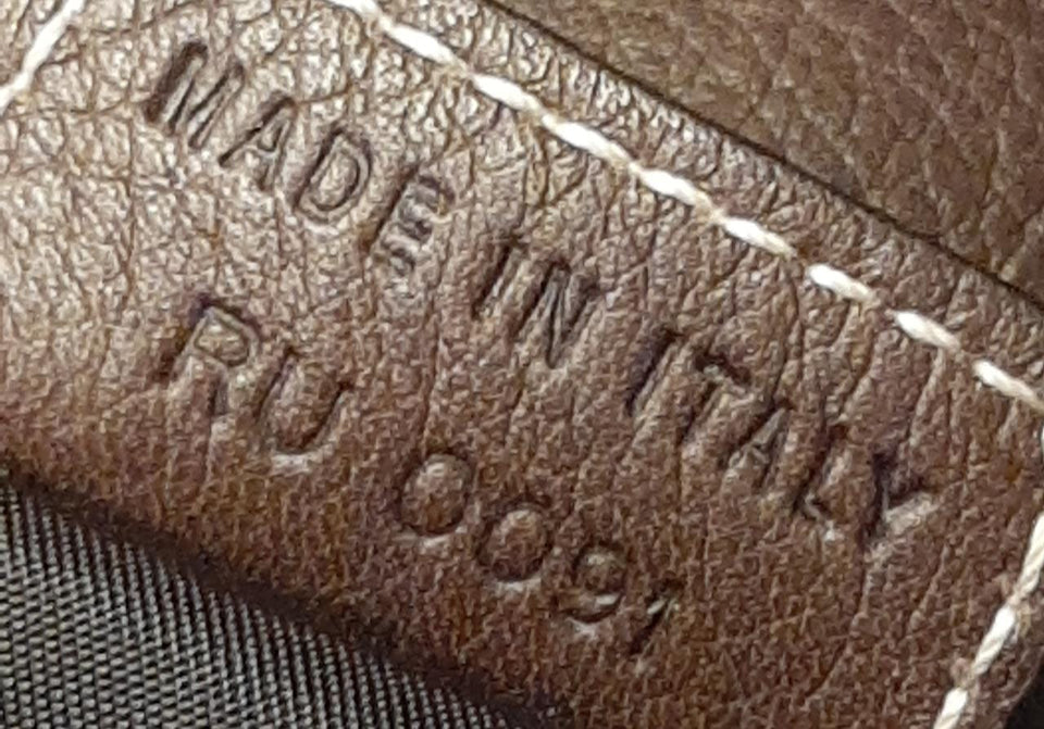Condição: Regular. Apresenta ausência de um dos pinos da base, severos desgastes e fissuras nos acabamentos em couro, especialmente nos inferiores, consideráveis marcas de uso, desgastes e manchas pelo couro, principalmente na parte frontal inferior, nos acabamentos superiores, nas alças e na base, couro ressecado, severas fissuras e desgastes nas selagens, especialmente nos acabamentos inferiores das alças, notável furo na base devido a ausência de um dos pinos, perceptível deformação na estrutura, principalmente nas laterais inferiores, considerável rasgo na parte interna inferior do lado esquerdo e severos desgastes e manchas esverdeadas no forro, especialmente nos acabamentos superiores e na base.