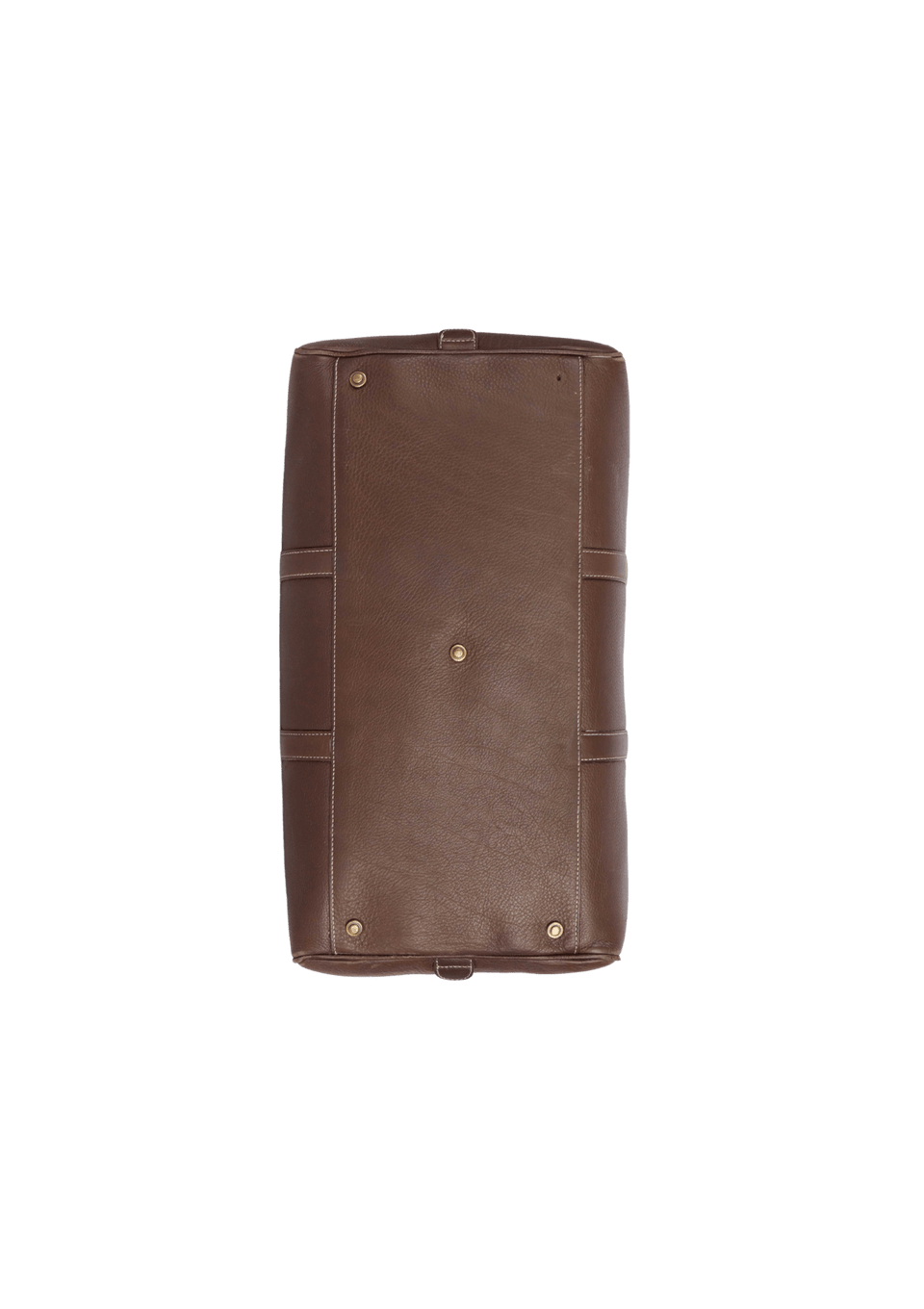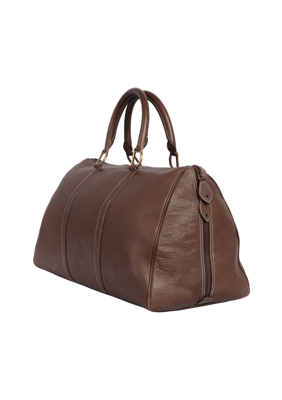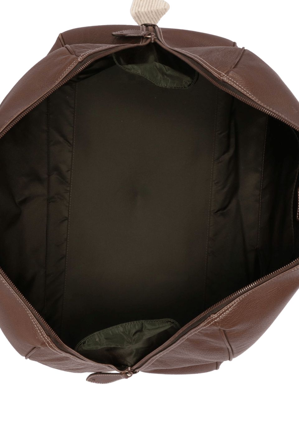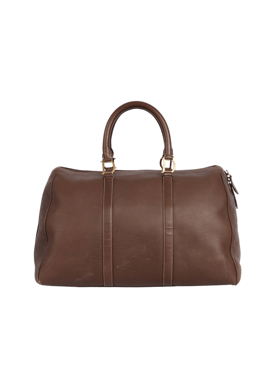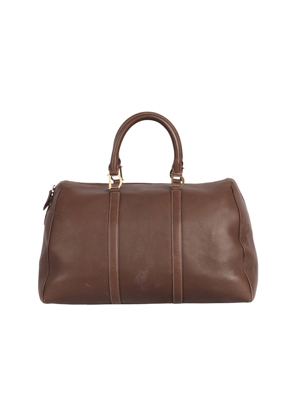 Condição: Regular. Apresenta ausência de um dos pinos da base, severos desgastes e fissuras nos acabamentos em couro, especialmente nos inferiores, consideráveis marcas de uso, desgastes e manchas pelo couro, principalmente na parte frontal inferior, nos acabamentos superiores, nas alças e na base, couro ressecado, severas fissuras e desgastes nas selagens, especialmente nos acabamentos inferiores das alças, notável furo na base devido a ausência de um dos pinos, perceptível deformação na estrutura, principalmente nas laterais inferiores, considerável rasgo na parte interna inferior do lado esquerdo e severos desgastes e manchas esverdeadas no forro, especialmente nos acabamentos superiores e na base.