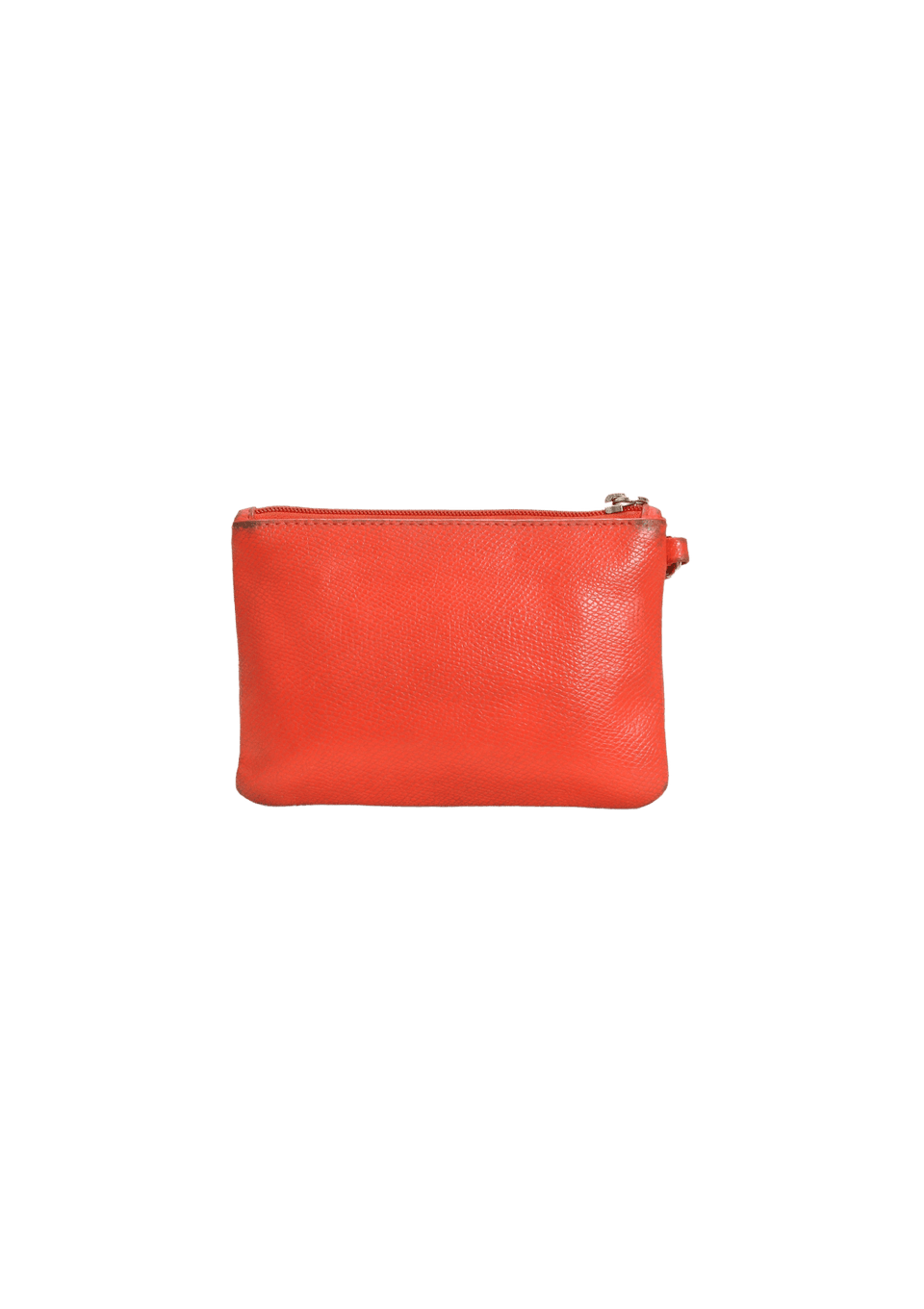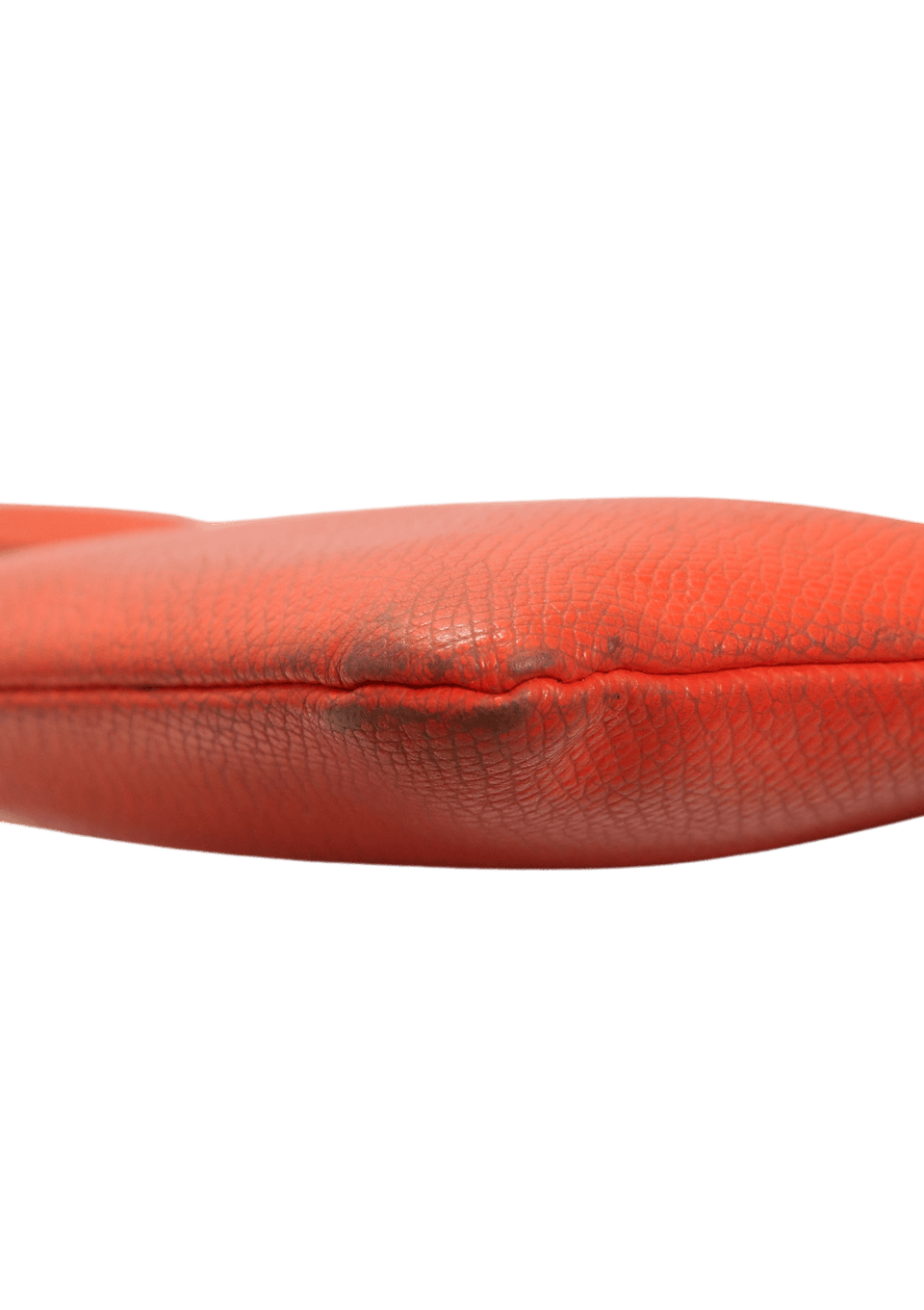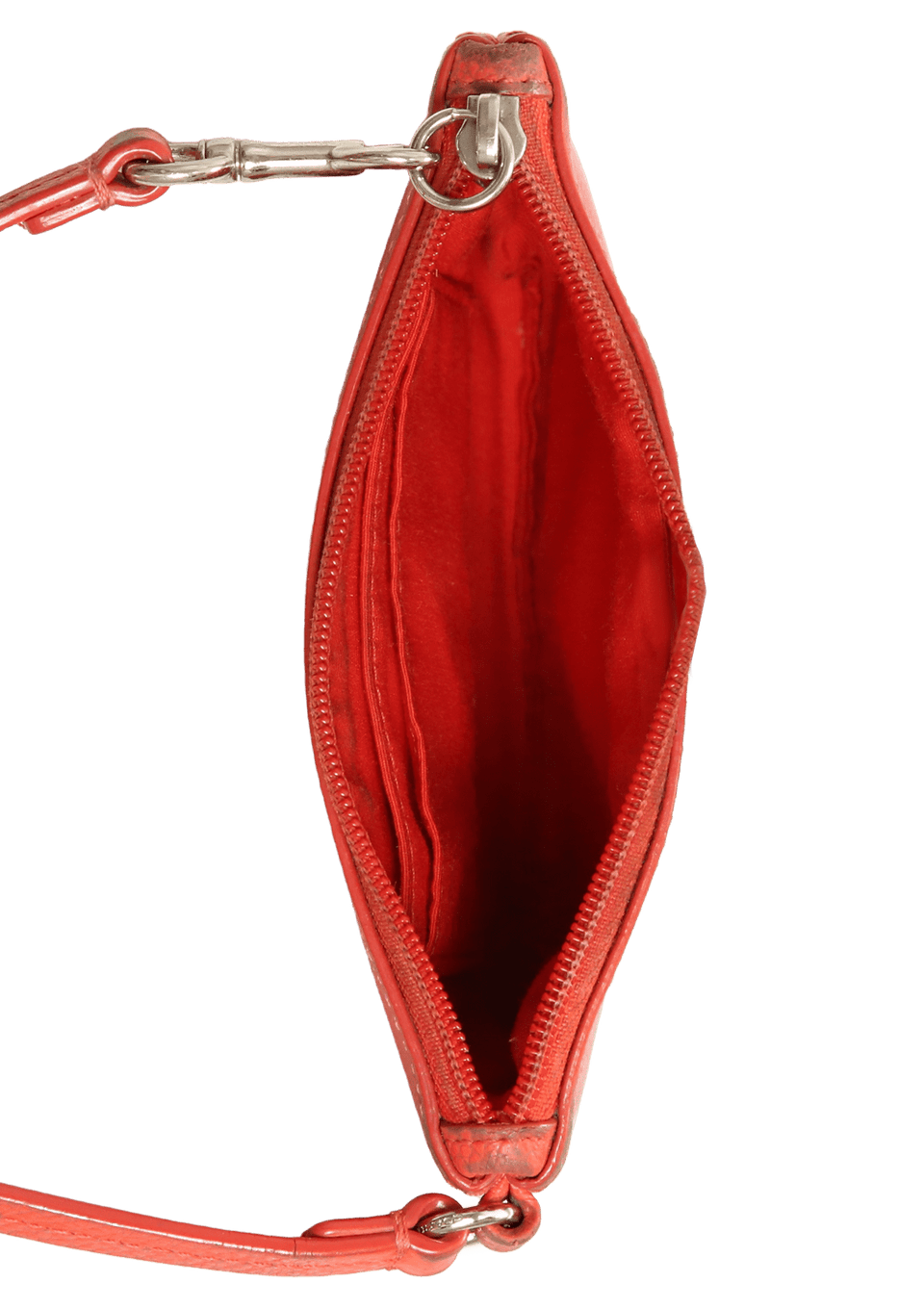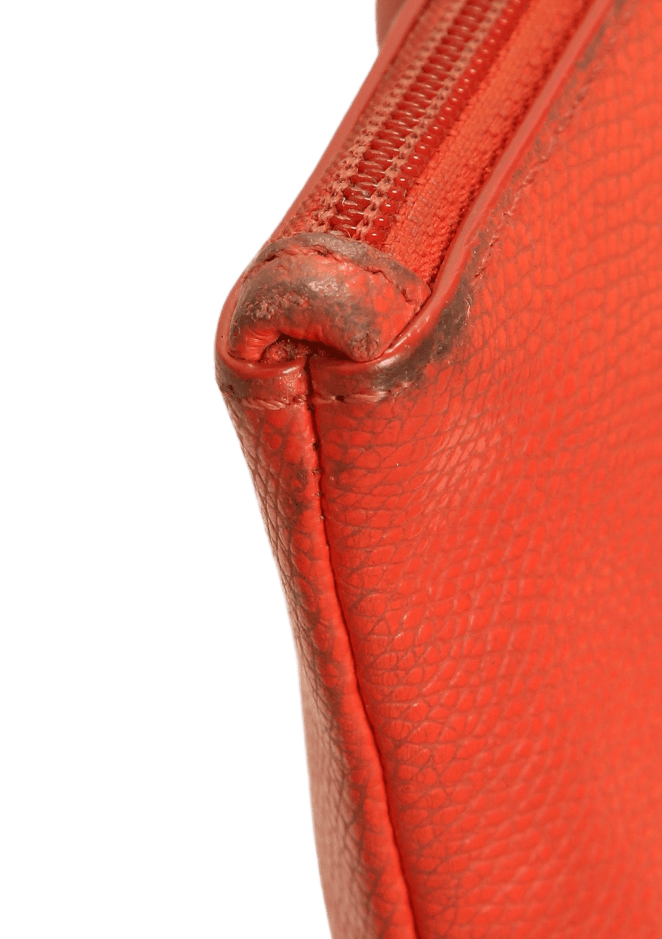Condição: Regular. Apresenta manchas e desgastes pelo couro externo, incluindo alça, manchas na parte interna, pequenas fissuras nas selagens da alça e manchas nas ferragens.