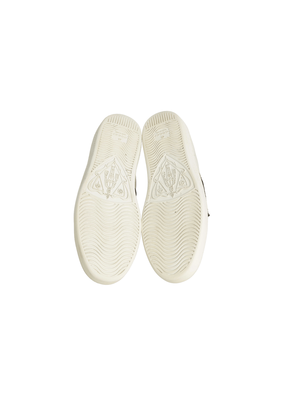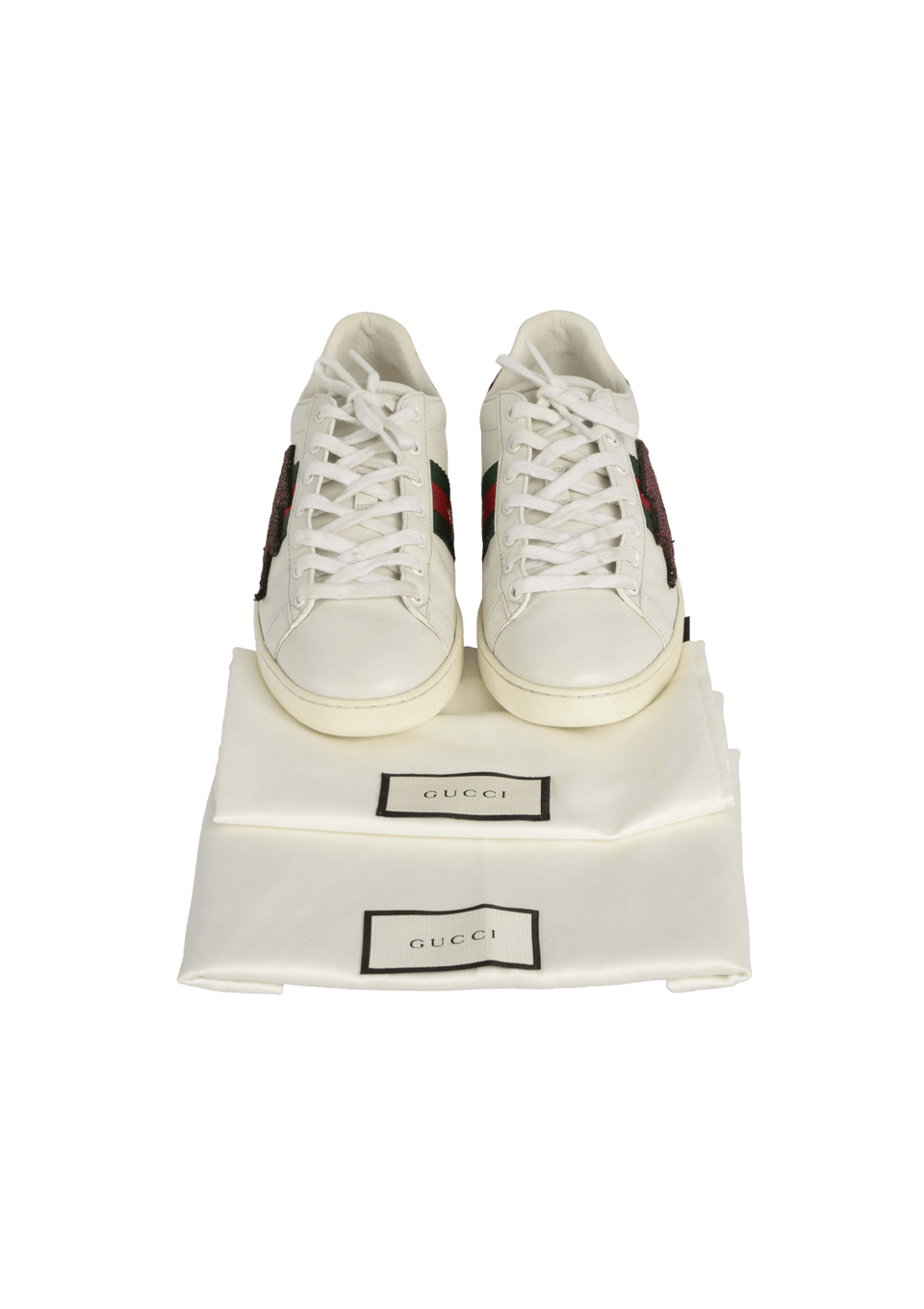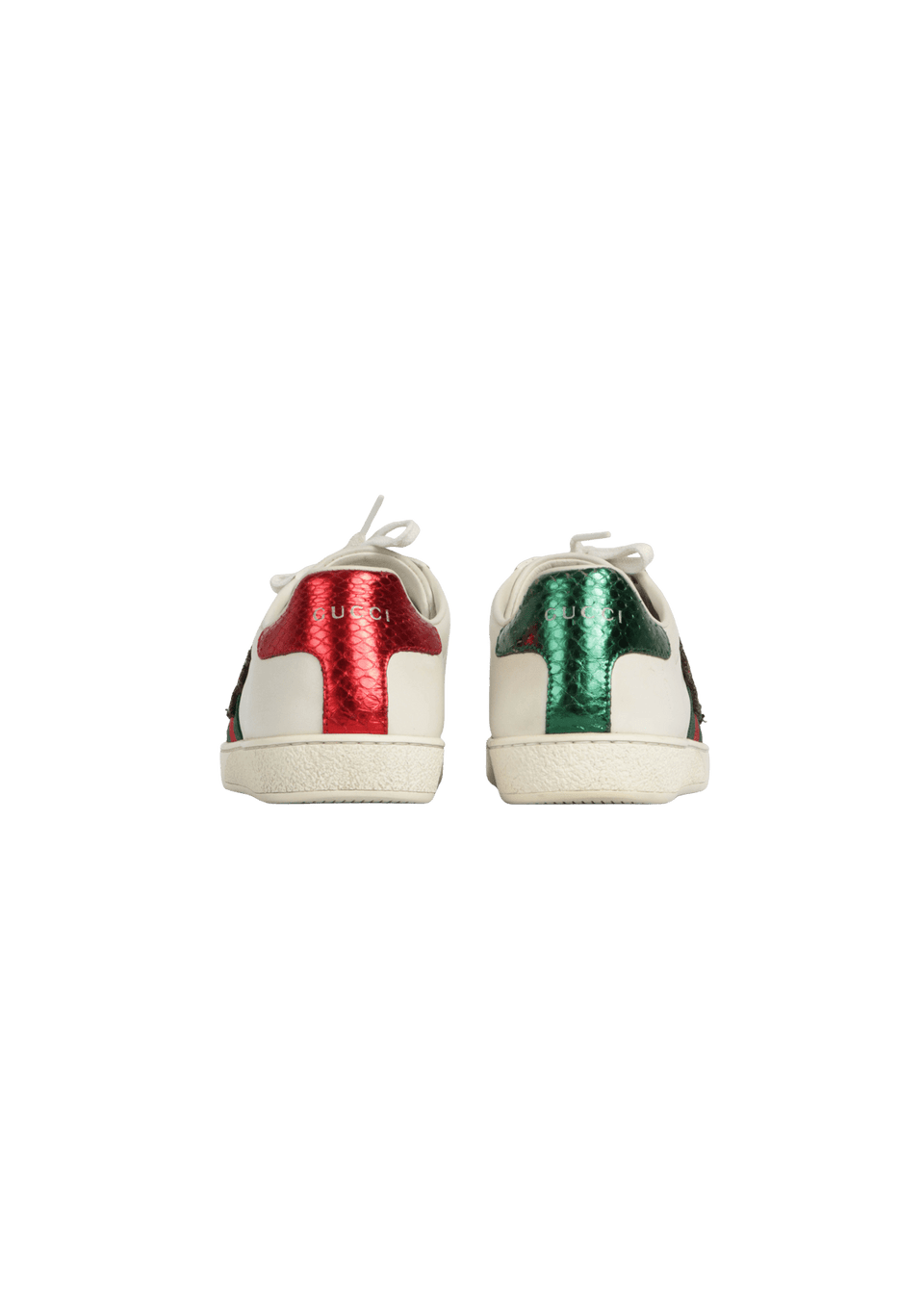 - Couro branco, faixa Web e couro snakeskin verdes e vermelhos, bordados dourados e aplicação de patches de cristais em formato de raio;