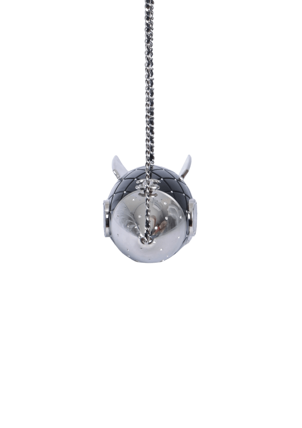 - Acrílico preto com detalhes em resina com glitter, metal prateado com tira de couro lambskin preto;