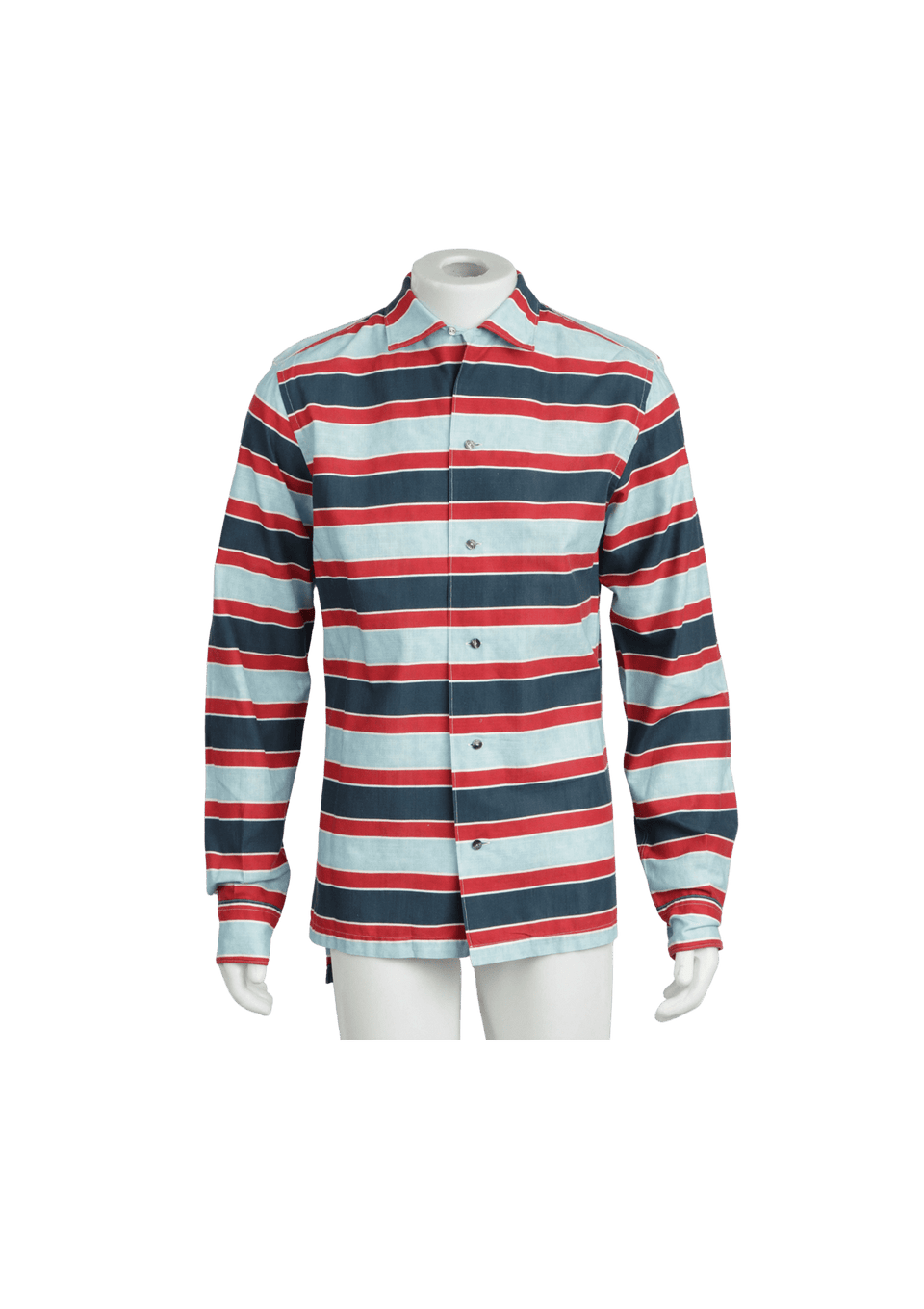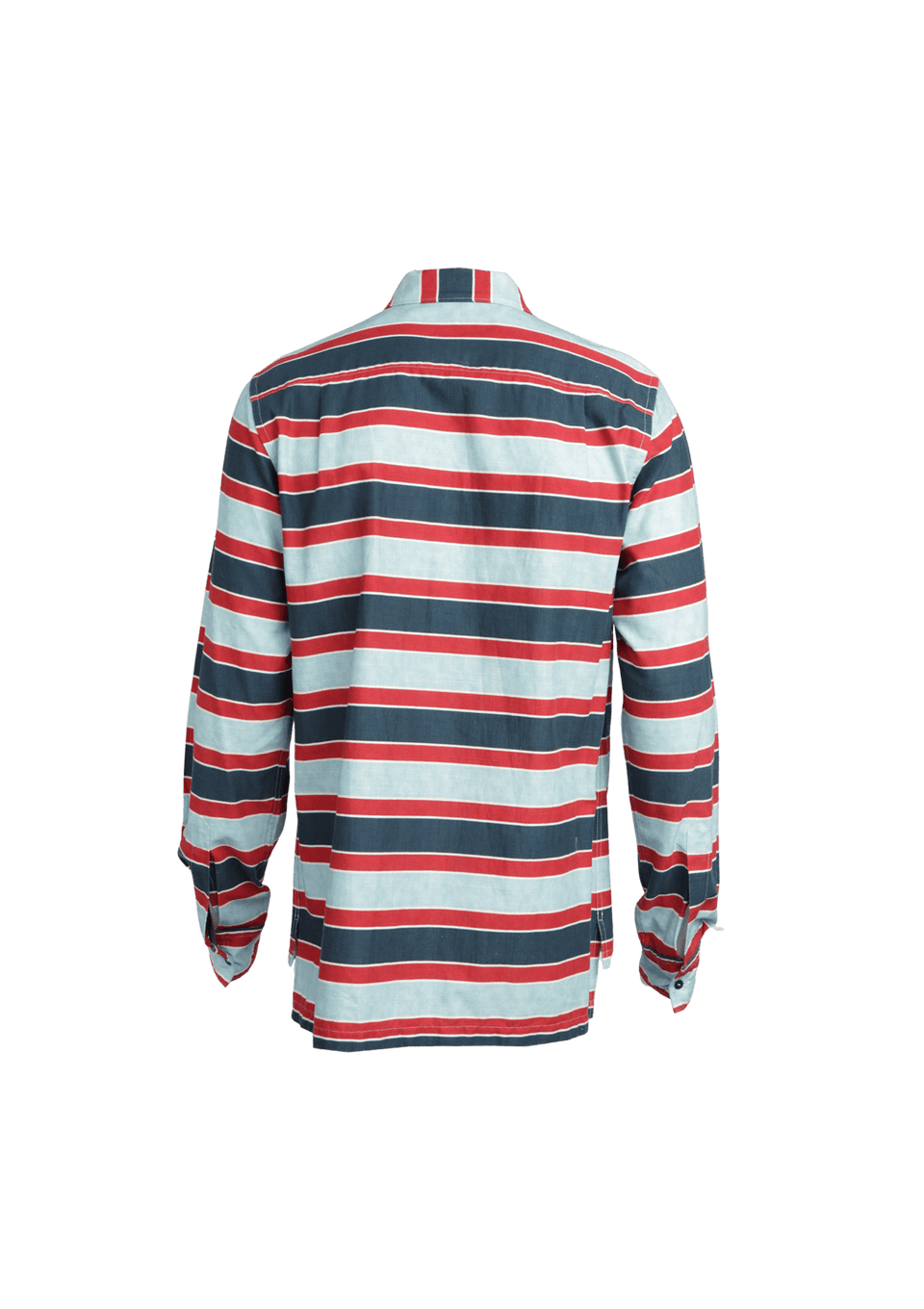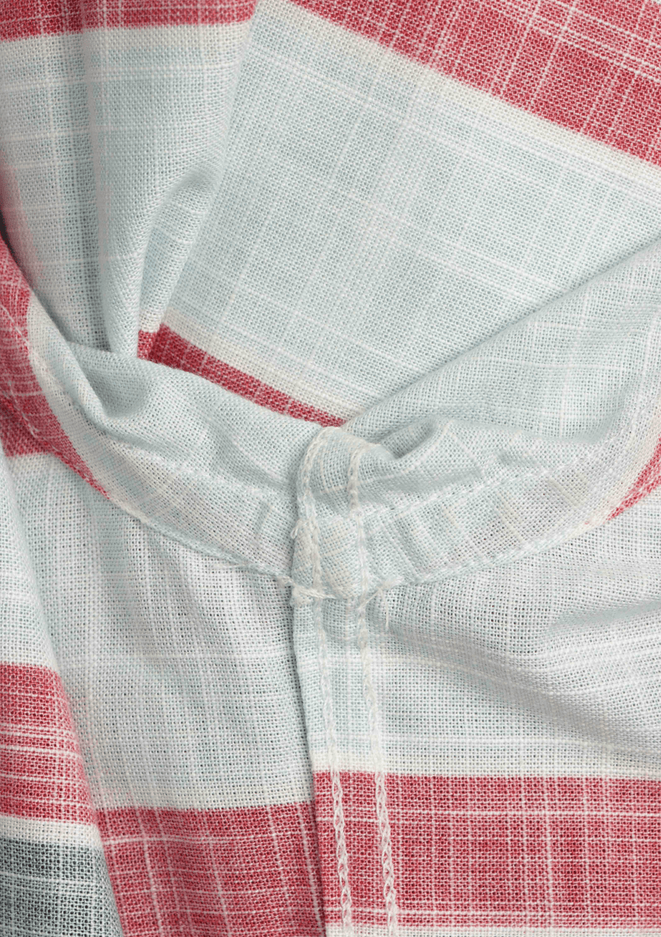 - Tecido azul claro com estampa listrada nas cores azul marinho, vermelho e branco;
