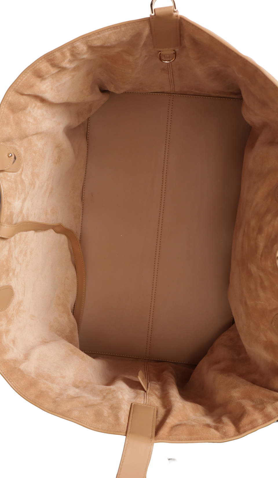 Bom, com aparência de usado. Apresenta leves deformidades pela estrutura, principalmente no canto esquerdo frontal e nas alças, leves desgastes pelo couro nas extremidades frontais da base, pequenas marcas de uso nas ferragens, leves fissuras e aberturas nas selagens, especialmente na parte superior da bolsa e nas laterais inferiores das alças, pequenas marcas de uso no couro da parte interna e levíssimos puídos pelo camurça.