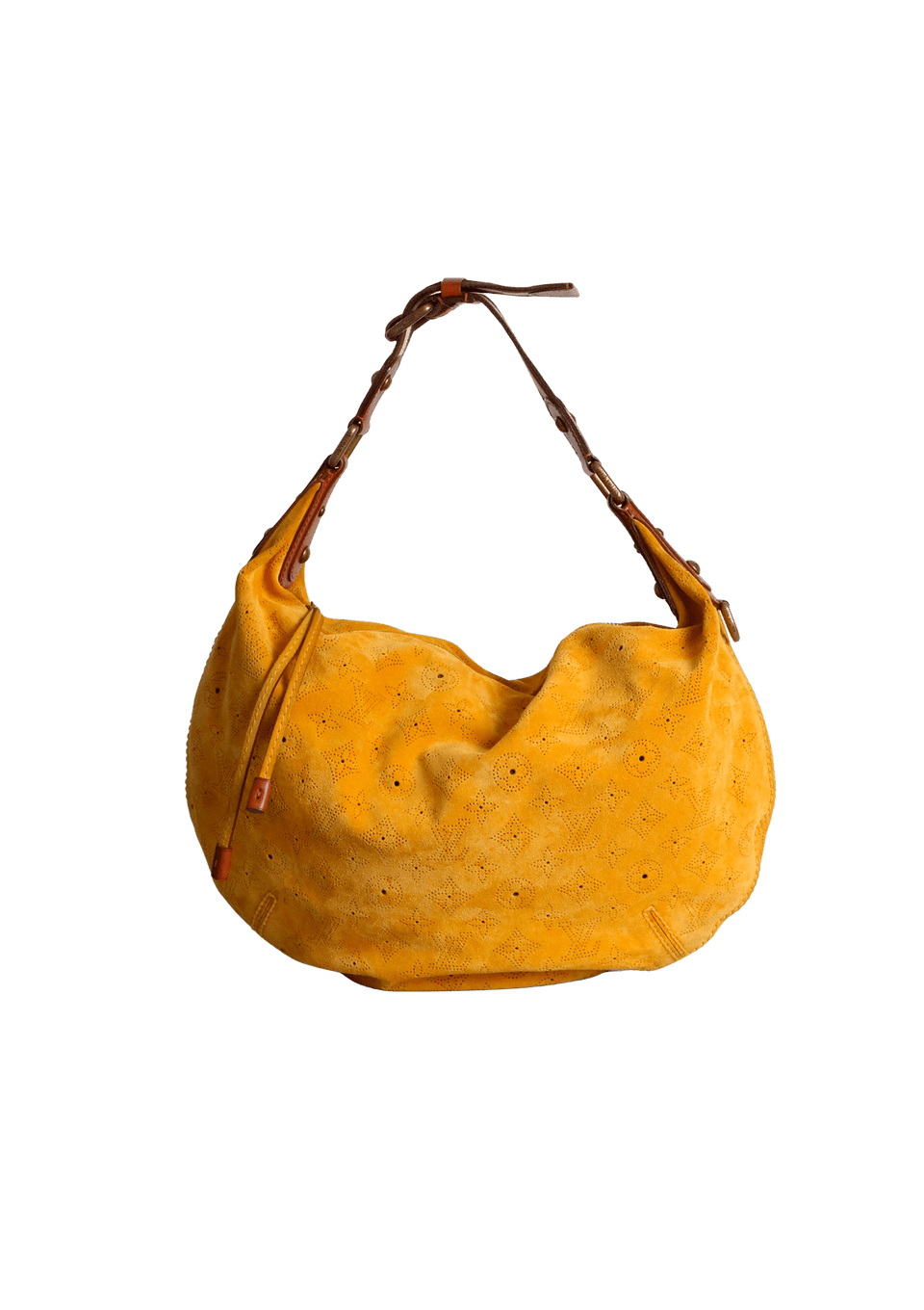 Condição: Regular. Apresenta severas manchas escurecidas nas laterais, próximas às alças, manchas de mofo por toda a parte externa, desgastes pelo suede, principalmente na base e oxidação nas ferragens.