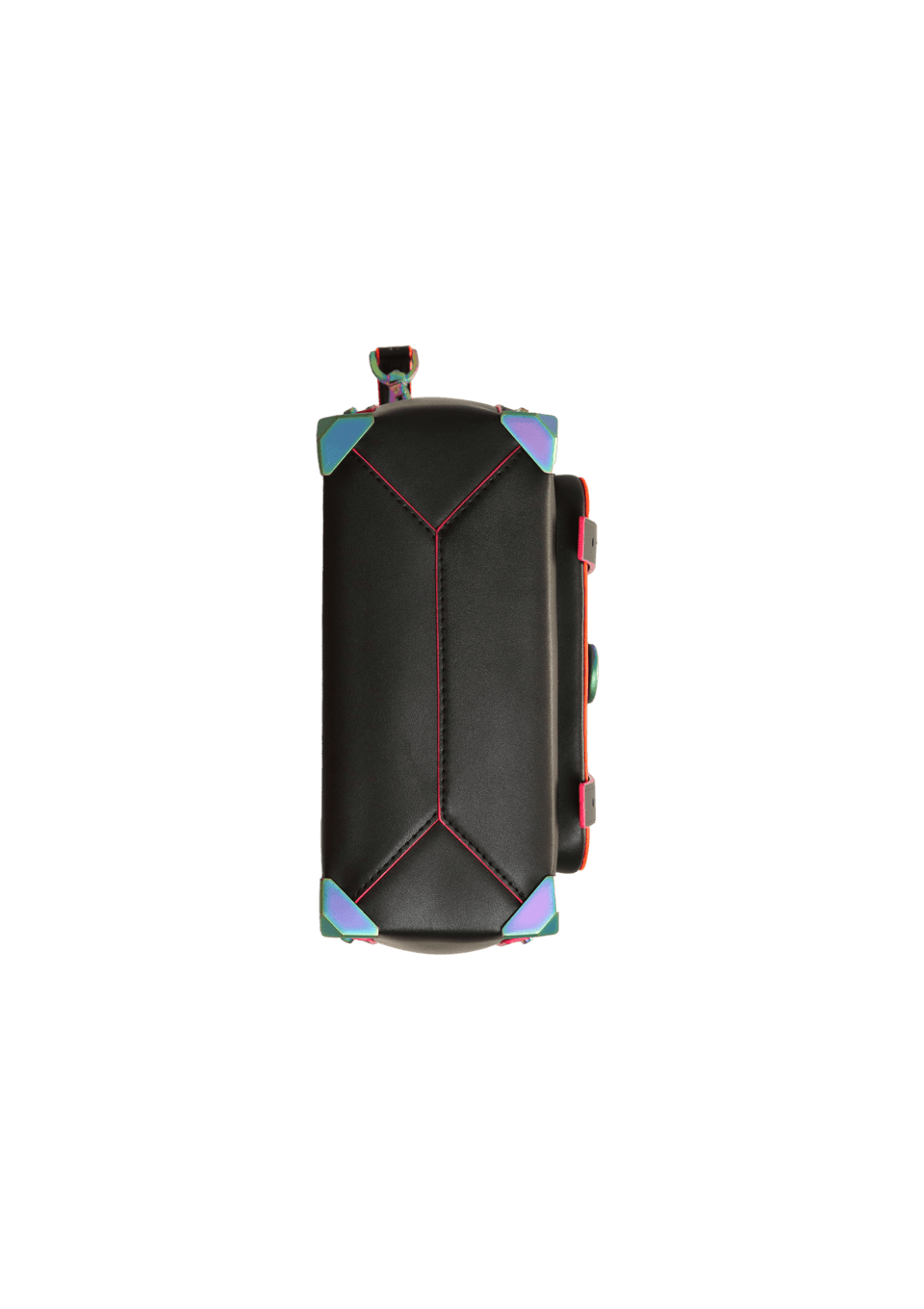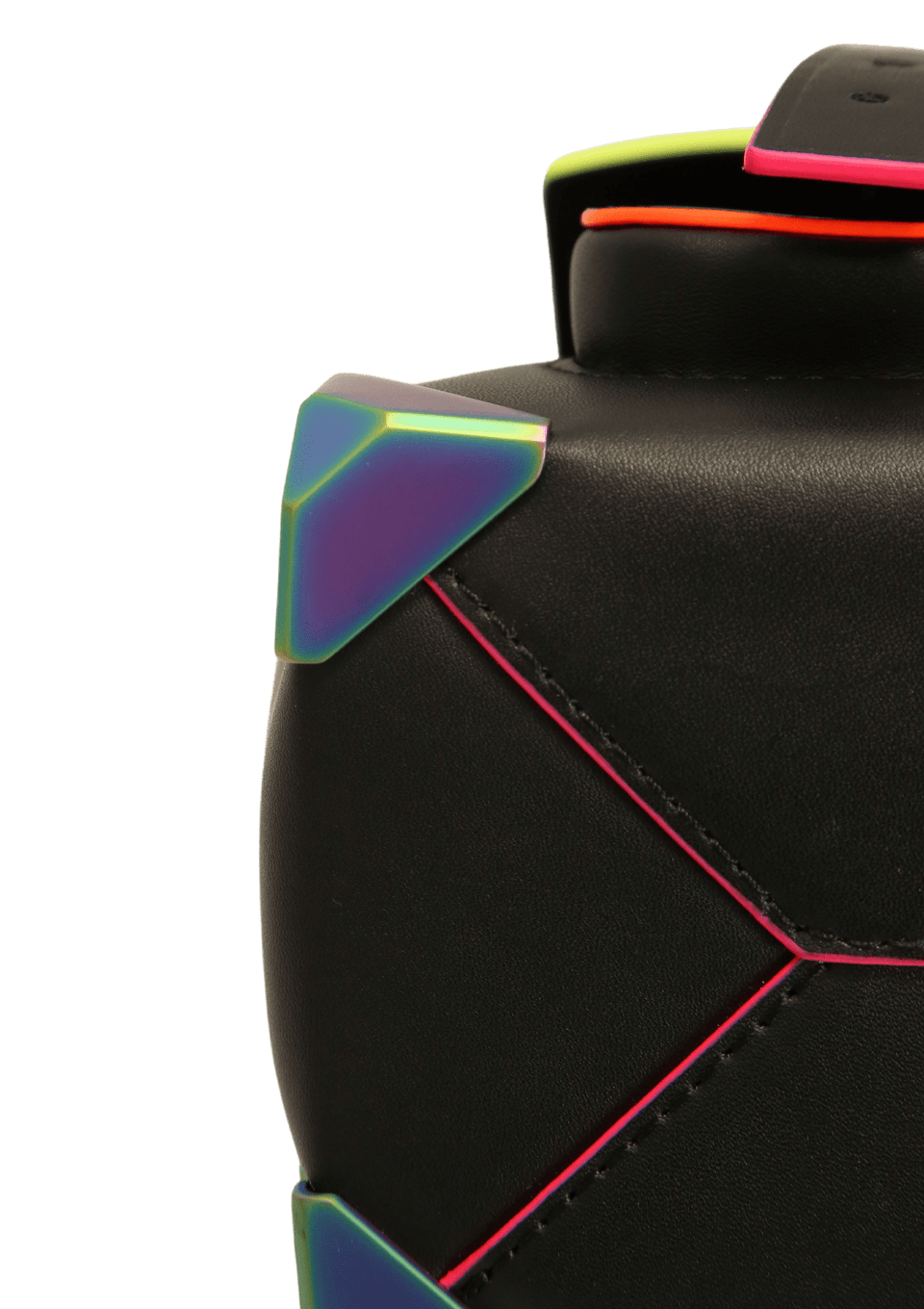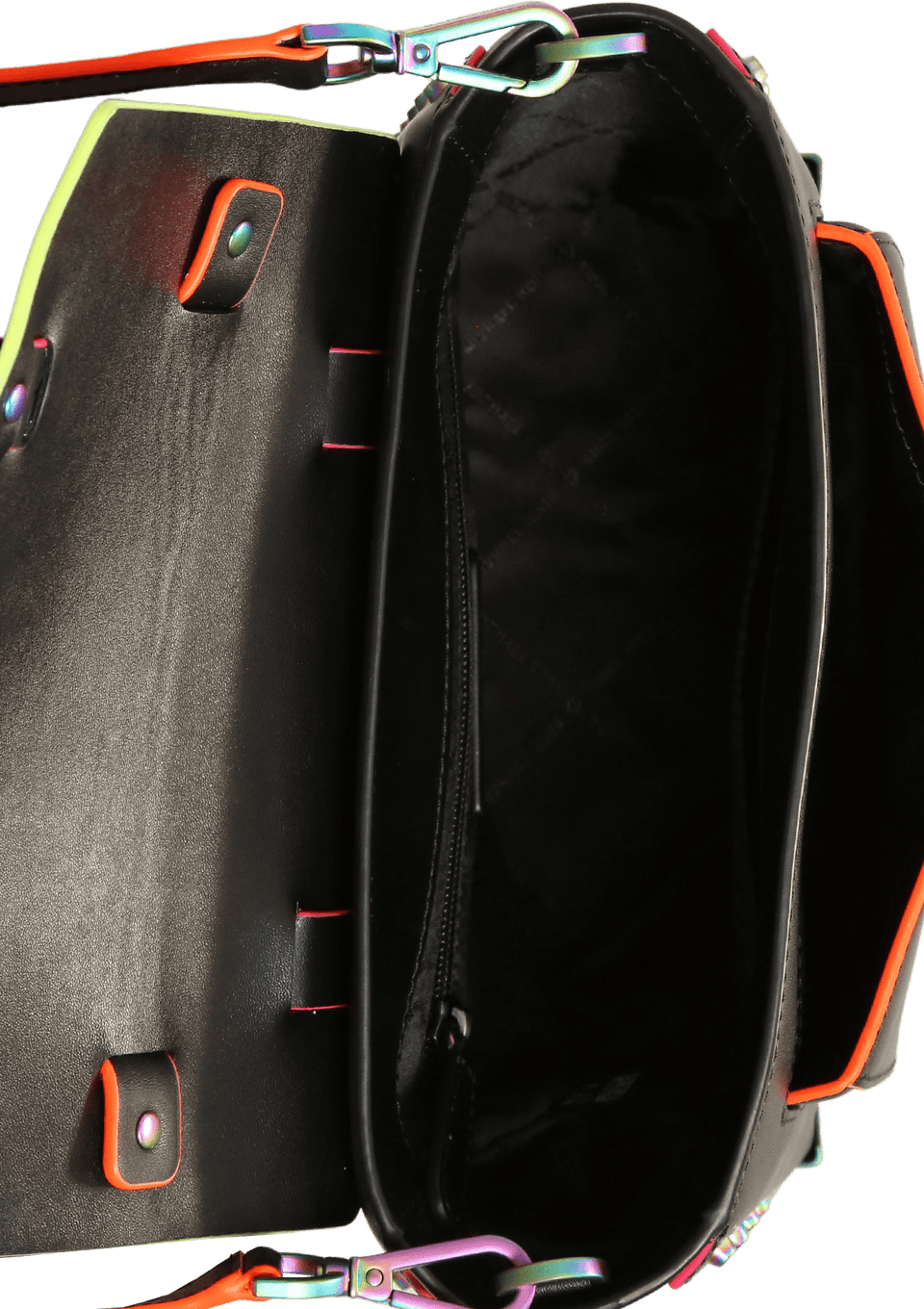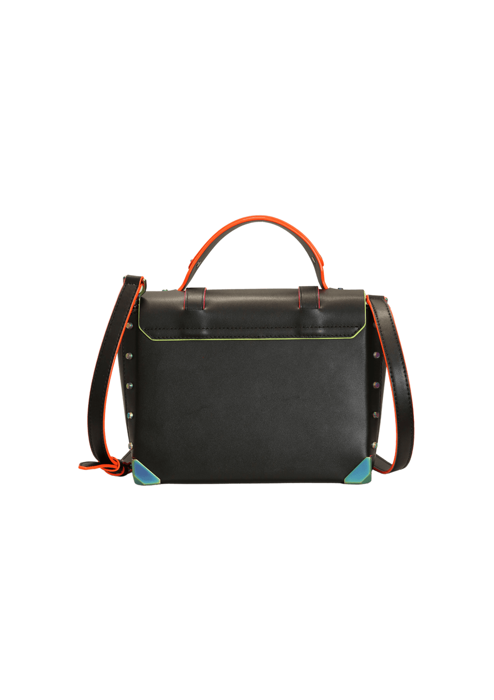 - Couro preto com acabamentos nas cores rosa e laranja e studs coloridos;