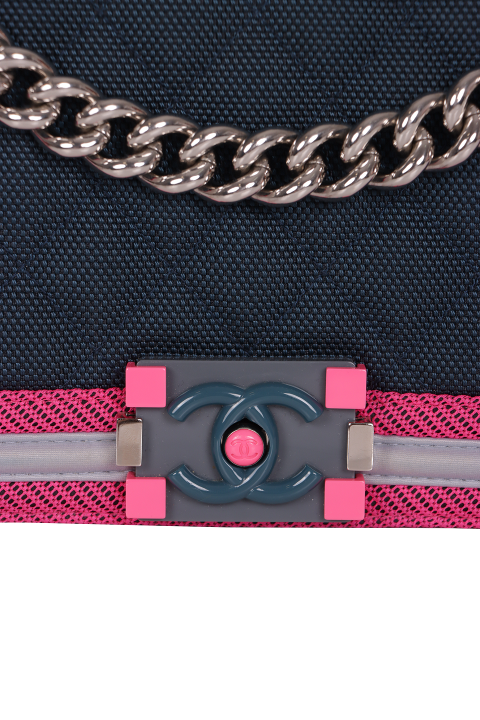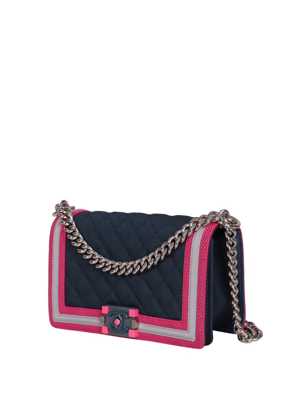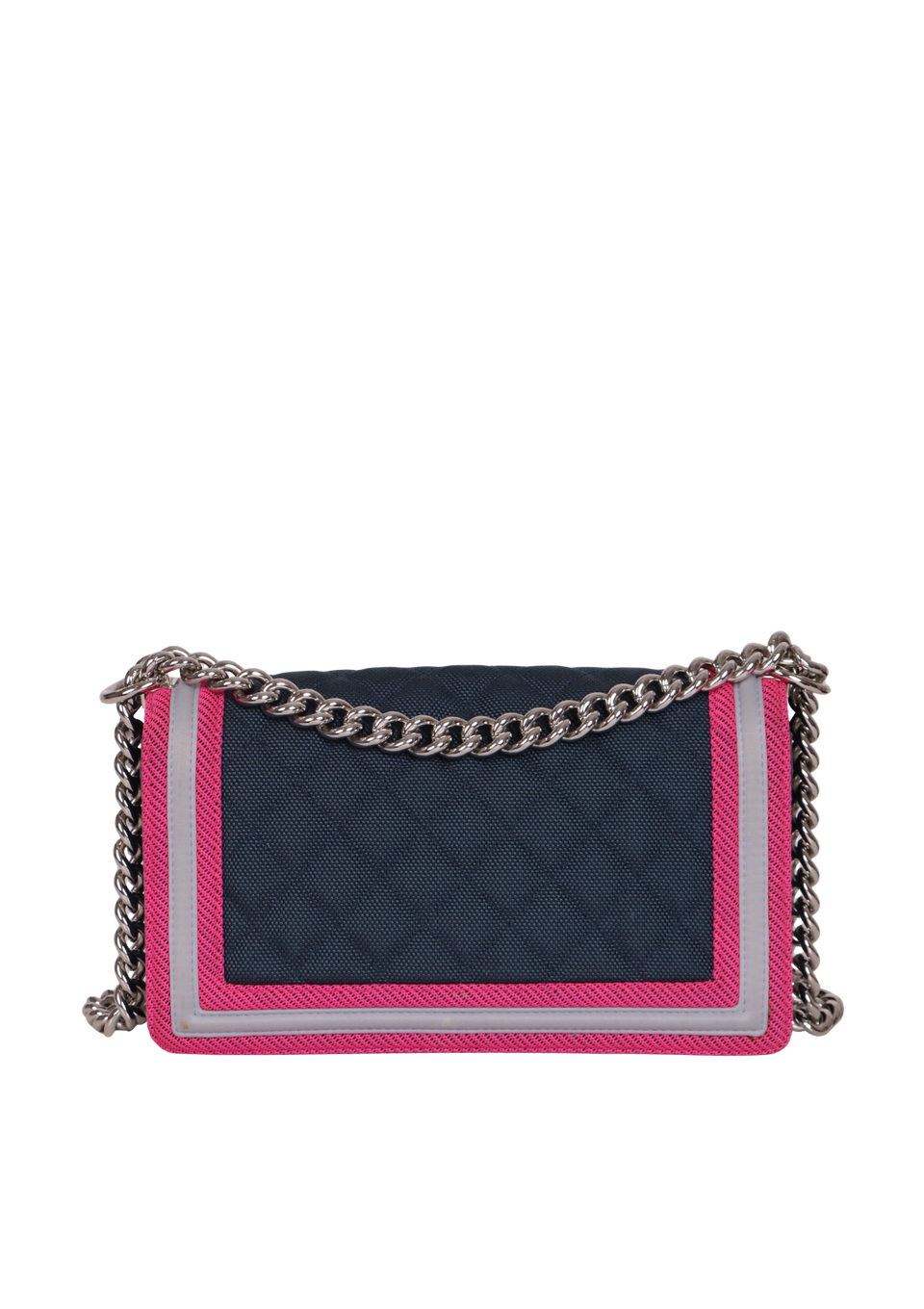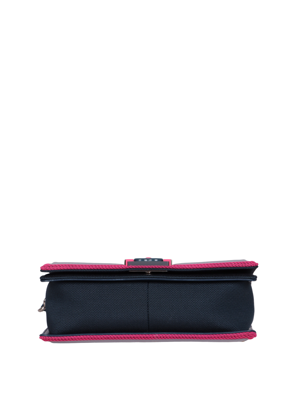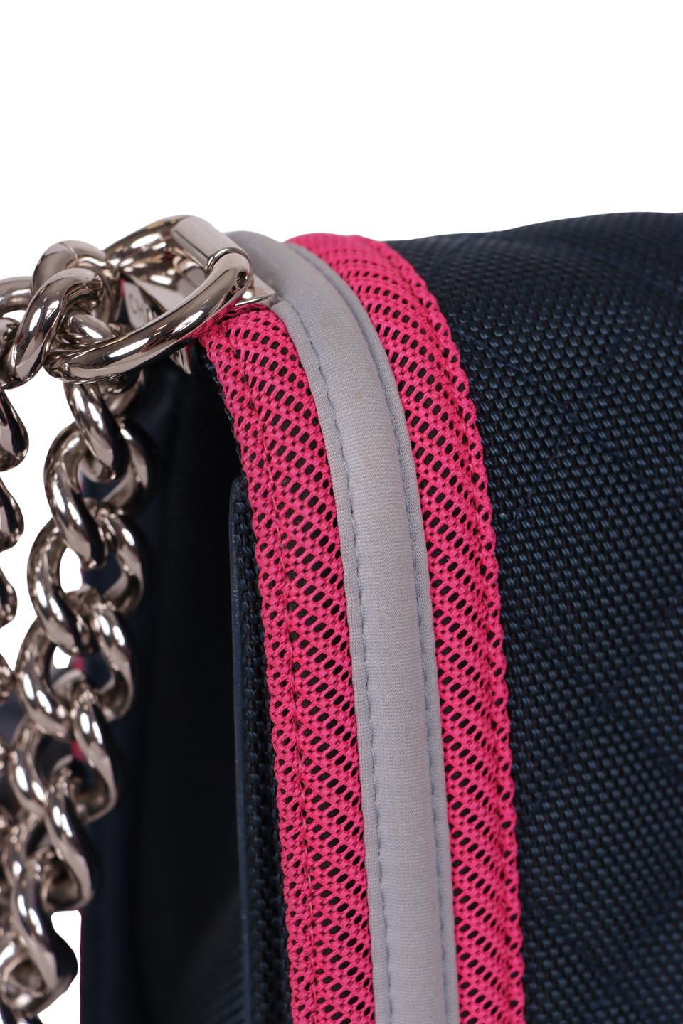 Descrição do Material: Nylon azul com detalhes em rosa e cinza e detalhes em couro calfskin azul