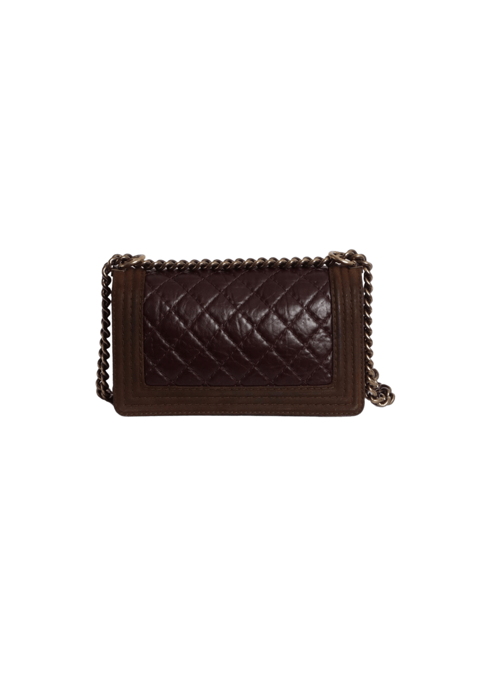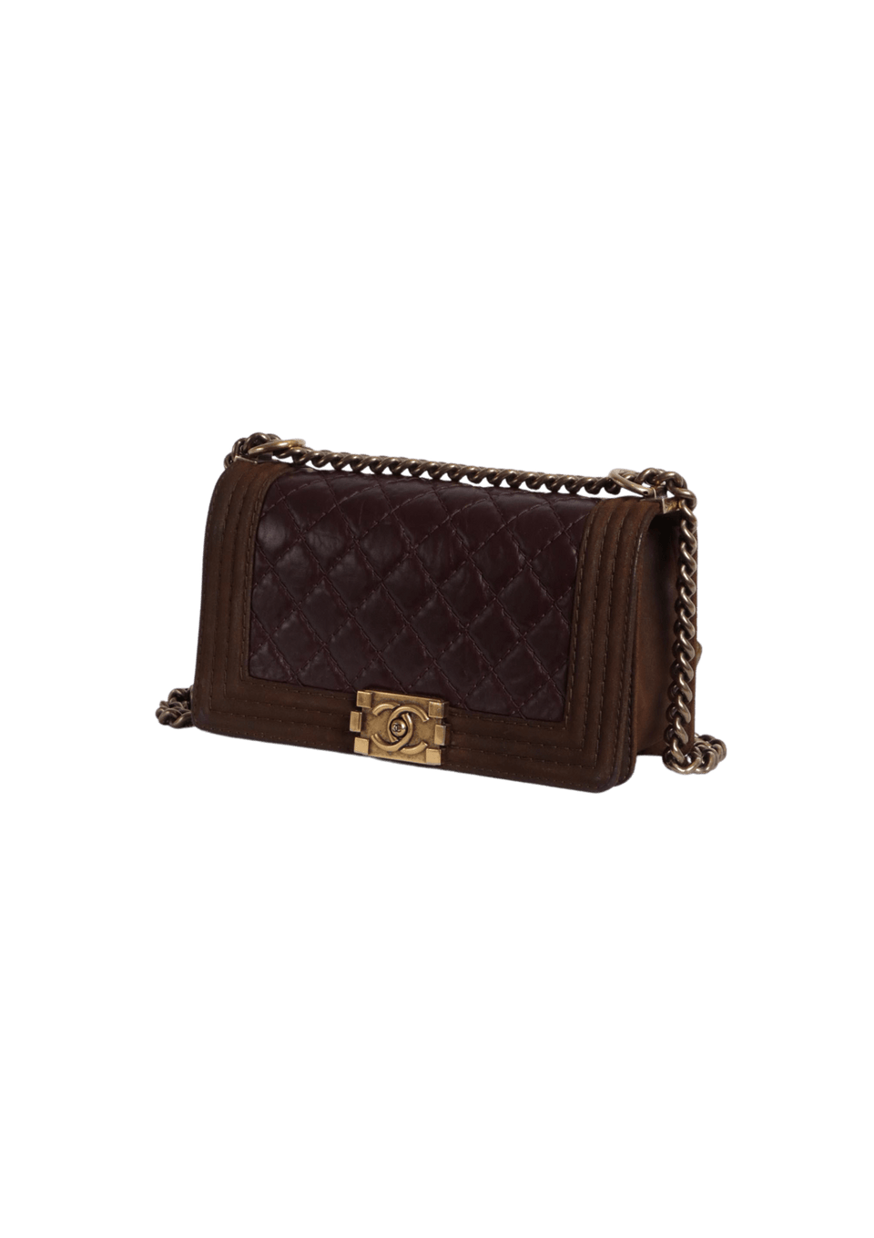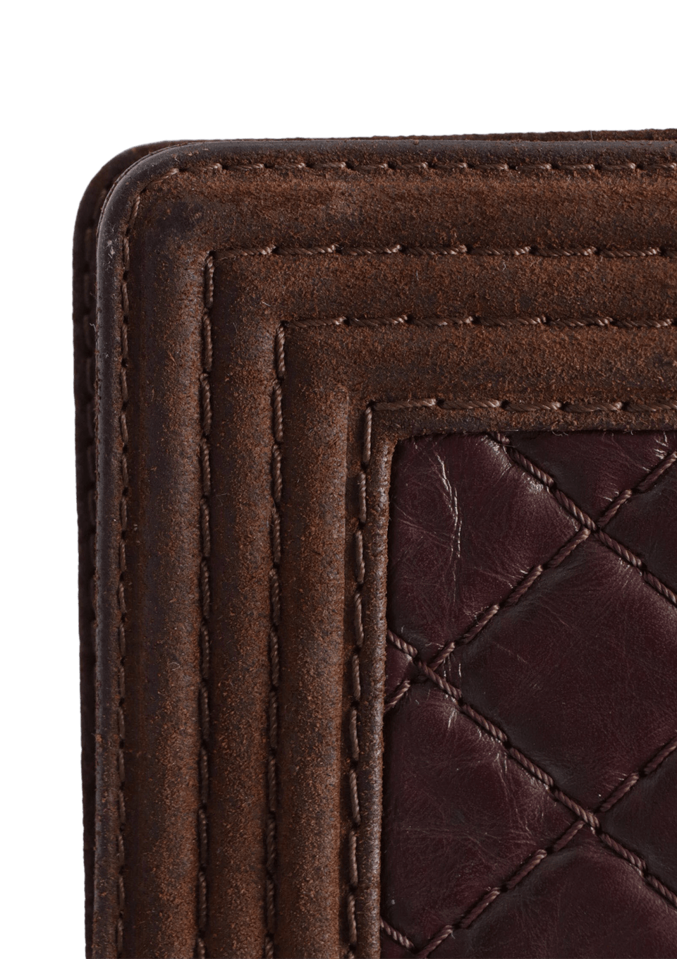 - Couro calfskin bordô com acabamento aged e matelassê e couro nobuck marrom;