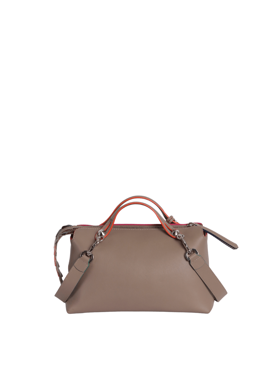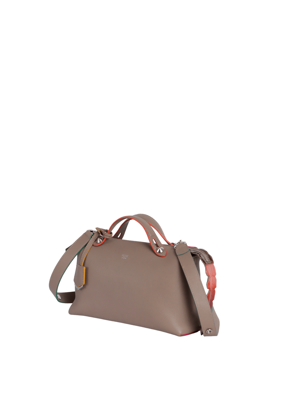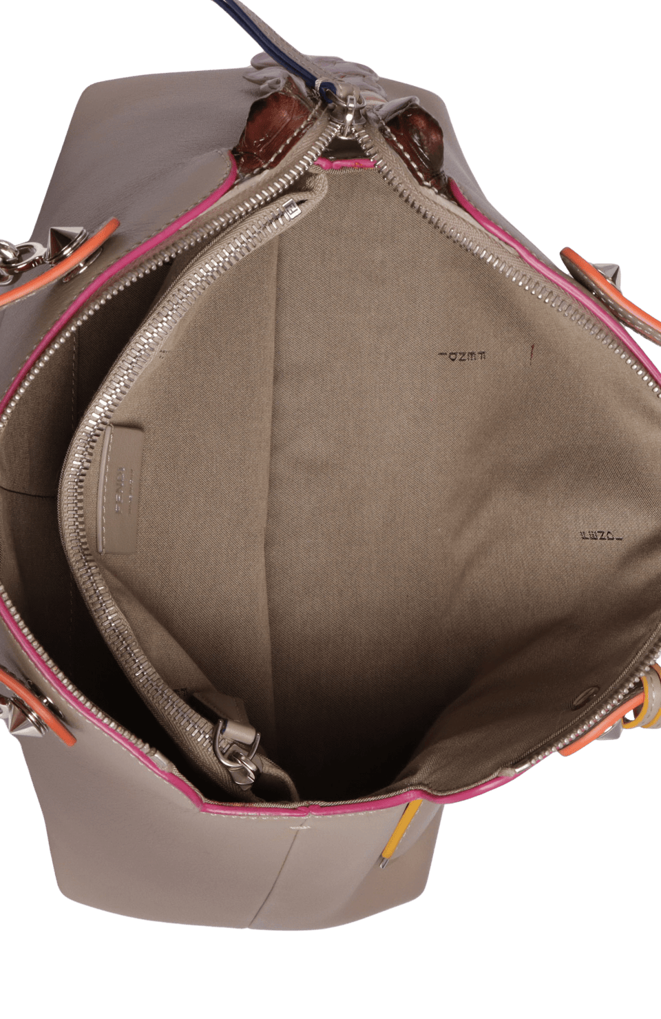 - Couro calfskin cinza com selagens coloridas e detalhe em pele de crocodilo em tons coloridos;