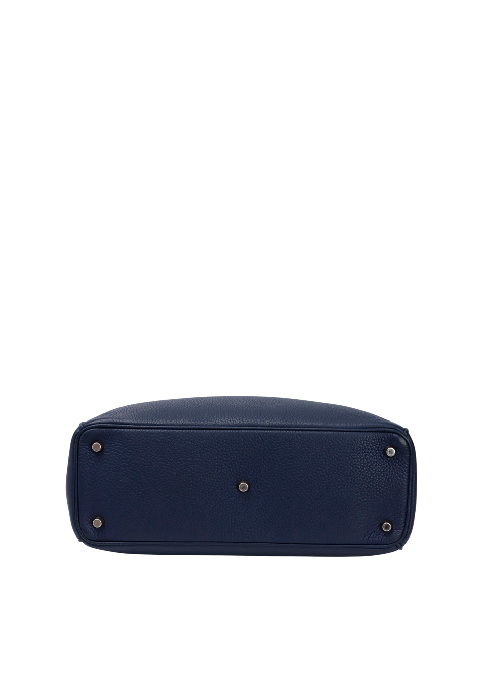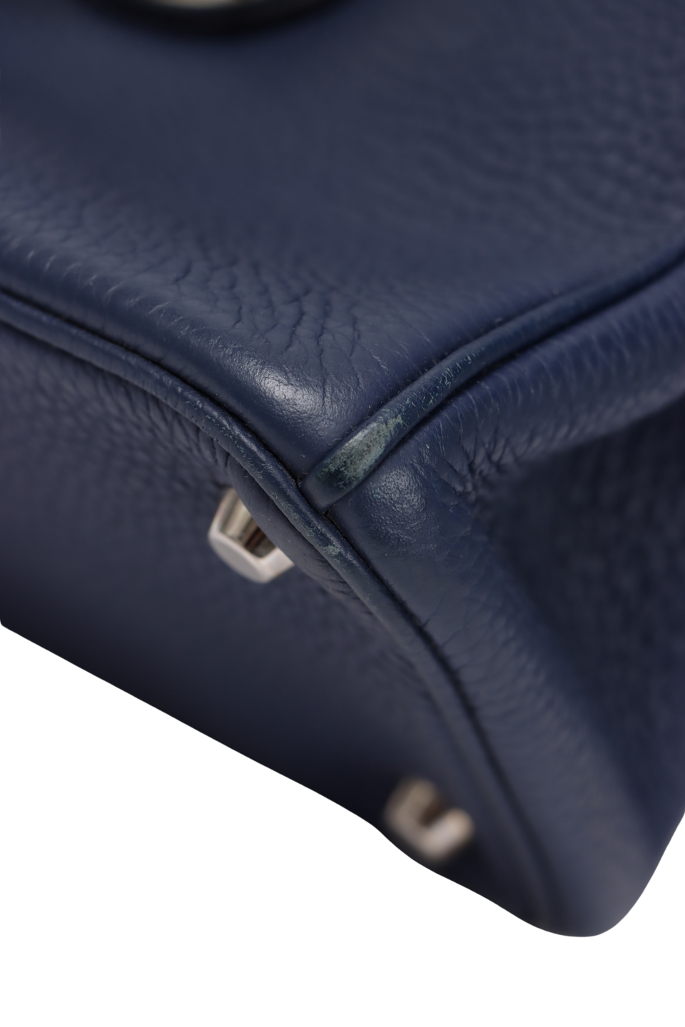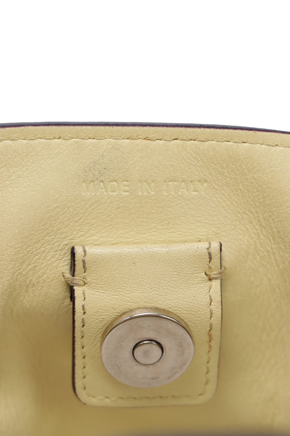 Bom, com aparência de usado. Apresenta leves deformidades pela estrutura, especialmente na parte superior central frontal e nas partes inferiores das laterais, pequenos desgastes e manchas esbranquiçadas pelo couro na parte superior central frontal e cantos da base, leves marcas de uso e descolorações nas ferragens do charm frontal, nos detalhes das alças e no botão magnético, pequenas fissuras e desgastes nas selagens superiores, principalmente nas extremidades laterais e leves desgastes, manchas e marcas de uso pelo couro interno.