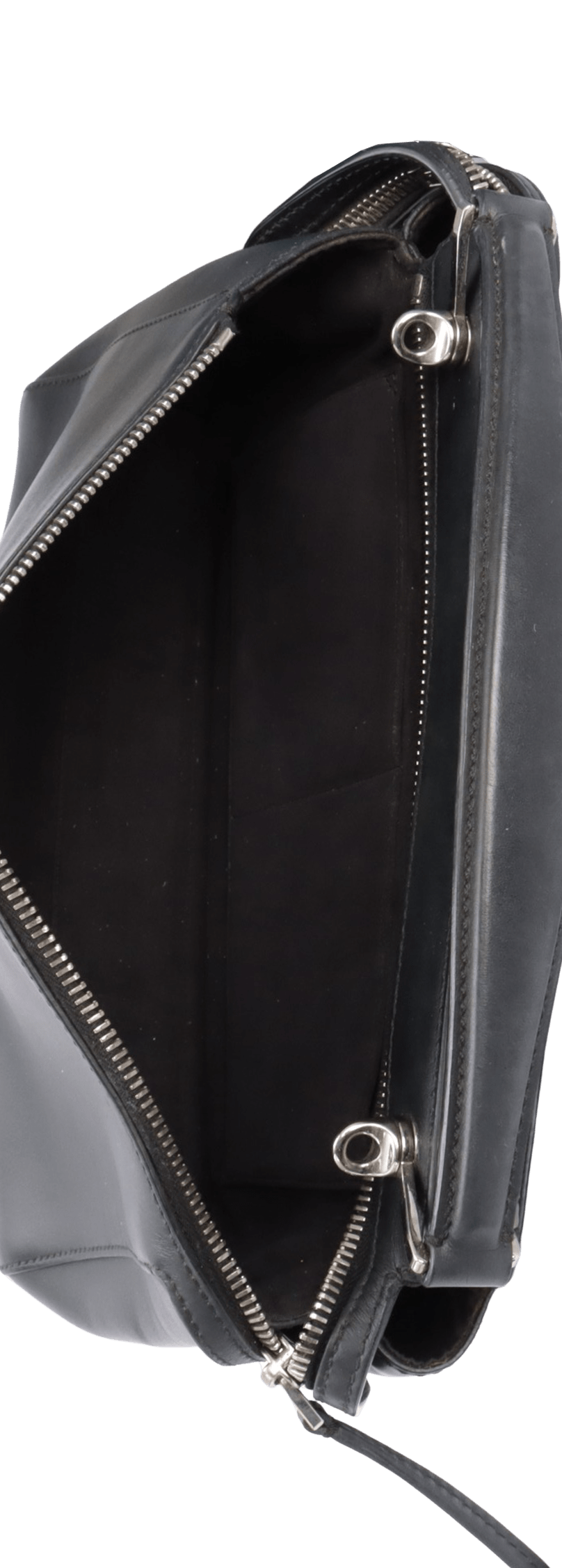 Bom, com aparência de usado. Apresenta leves desgastes, marcas de uso e manchas esbranquiçadas pelo couro, especialmente na parte frontal do lado esquerdo, pequena deformação na estrutura, principalmente na parte frontal do lado esquerdo, pequenos desgastes e fissuras nas selagens, especialmente nos acabamentos superiores laterais, leves marcas de uso e oxidações nas ferragens, principalmente nos cursores e leves desgastes, manchas esbranquiçadas e escurecidas na parte interna especialmente na base.