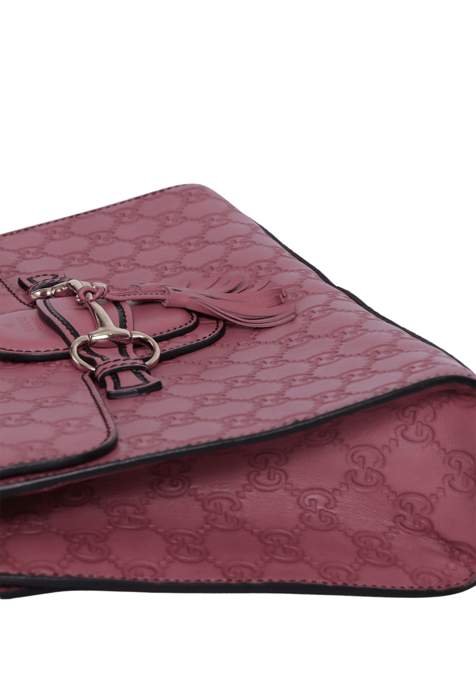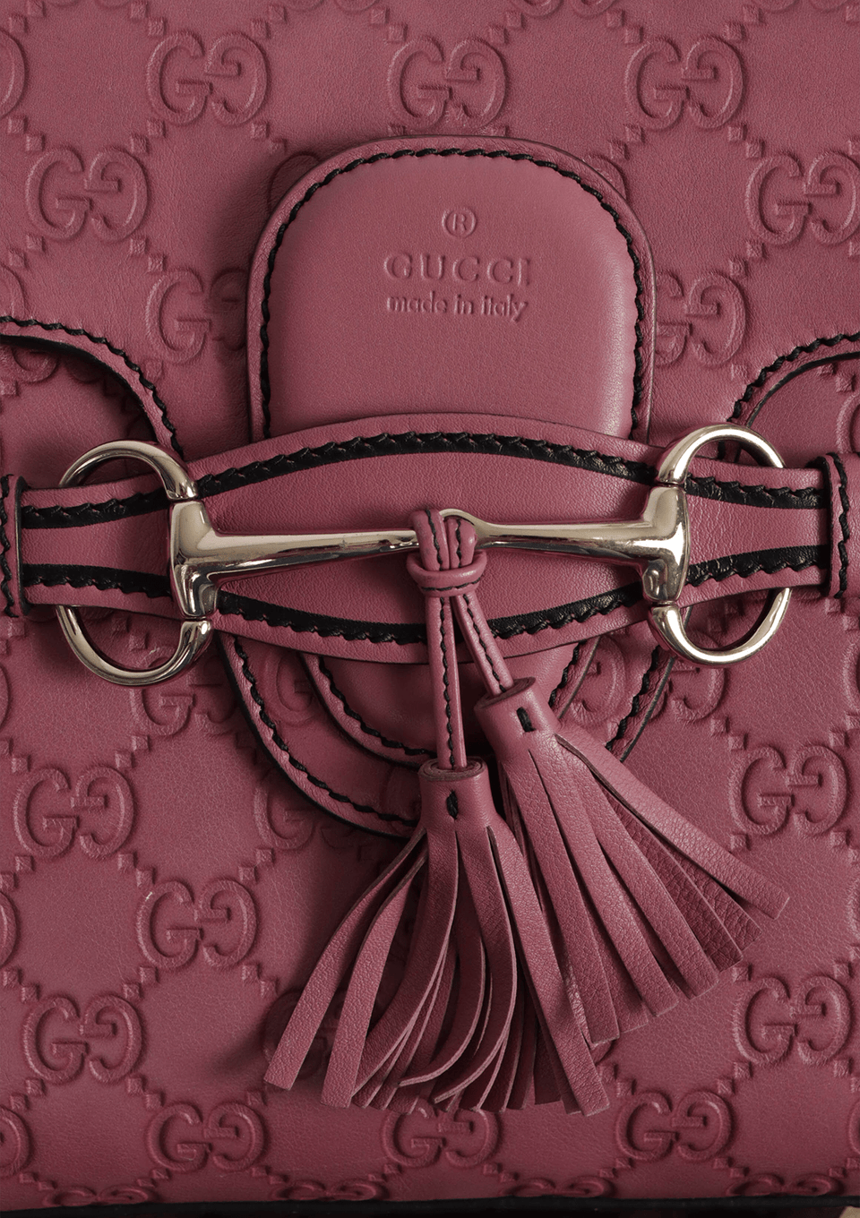 - Couro calfskin rosa com acabamento Guccissima em baixo relevo;