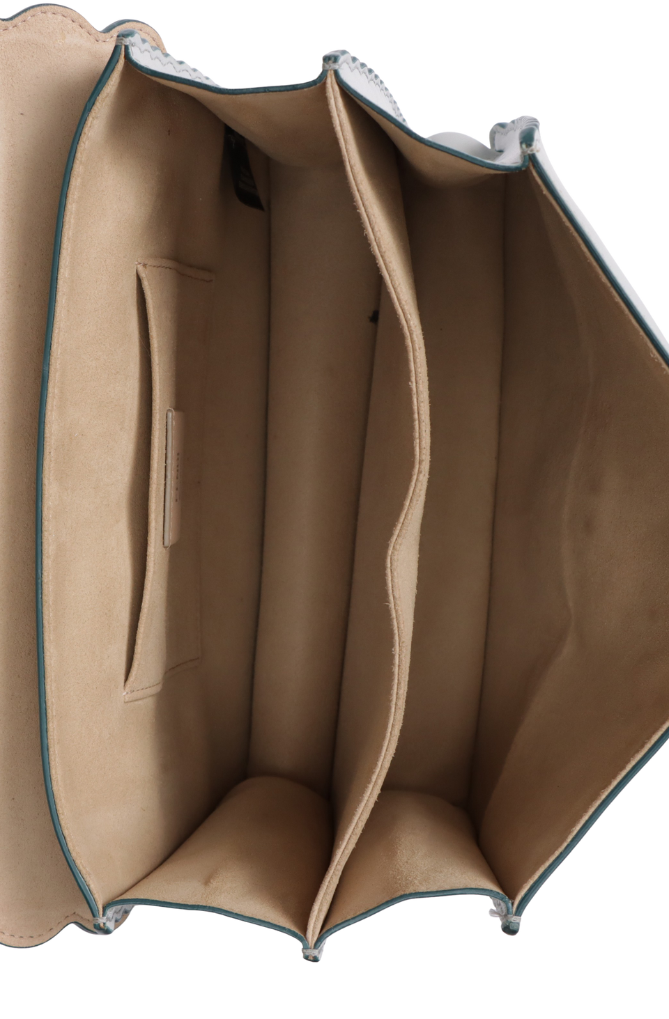 Bom, com aparência de usado. Apresenta leves deformidades pela estrutura, principalmente na parte central frontal e na alça de mão, pequenas marcas e manchas de uso pelo couro, especialmente nas extremidades superiores frontais, cantos da base e parte superior de trás, leves marcas de uso e descolorações nas ferragens do fecho e nos detalhes superiores, pequenas fissuras nas selagens, principalmente nas laterais da parte superior da aba e pequenos puídos e manchas de uso pela parte interna.