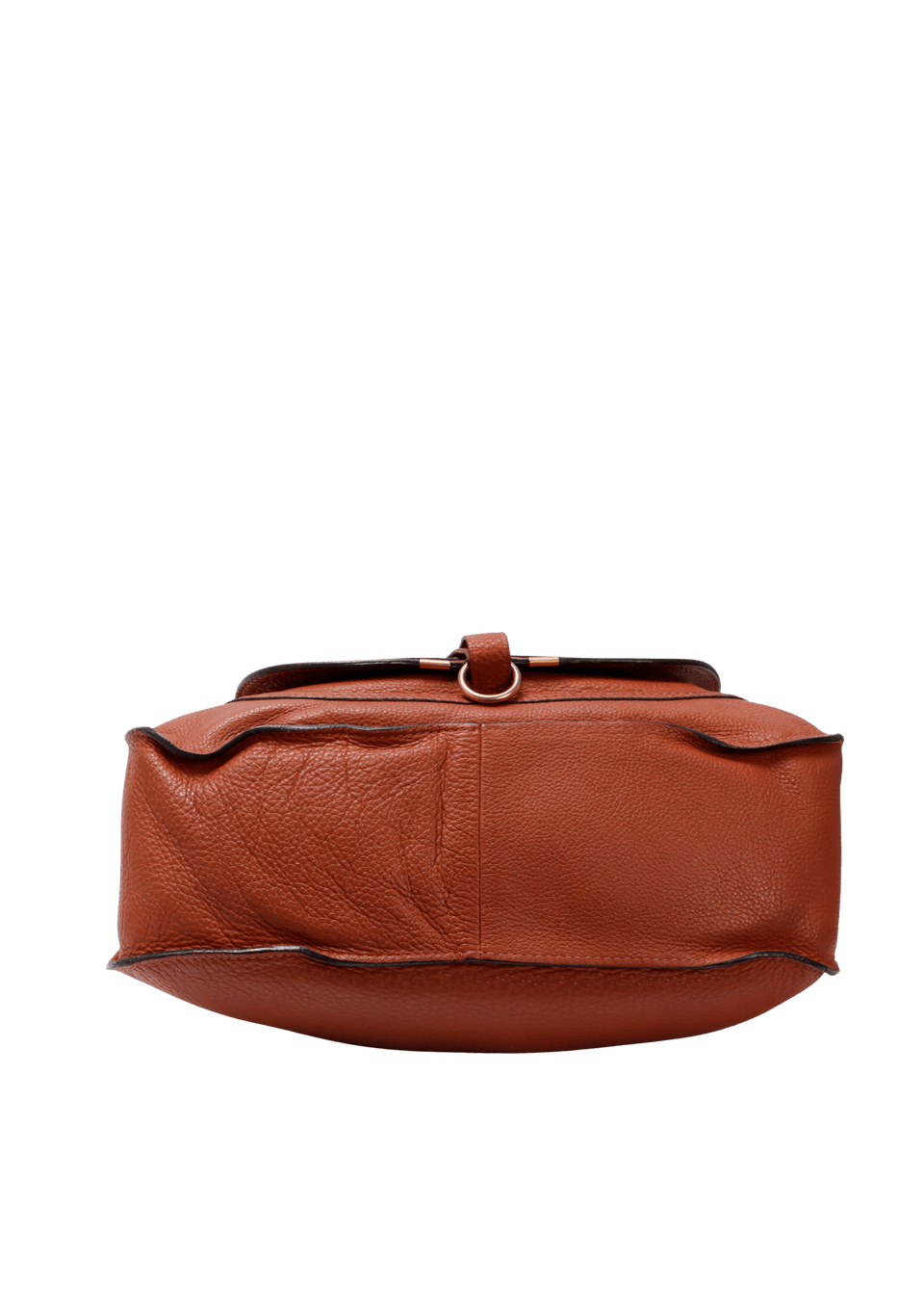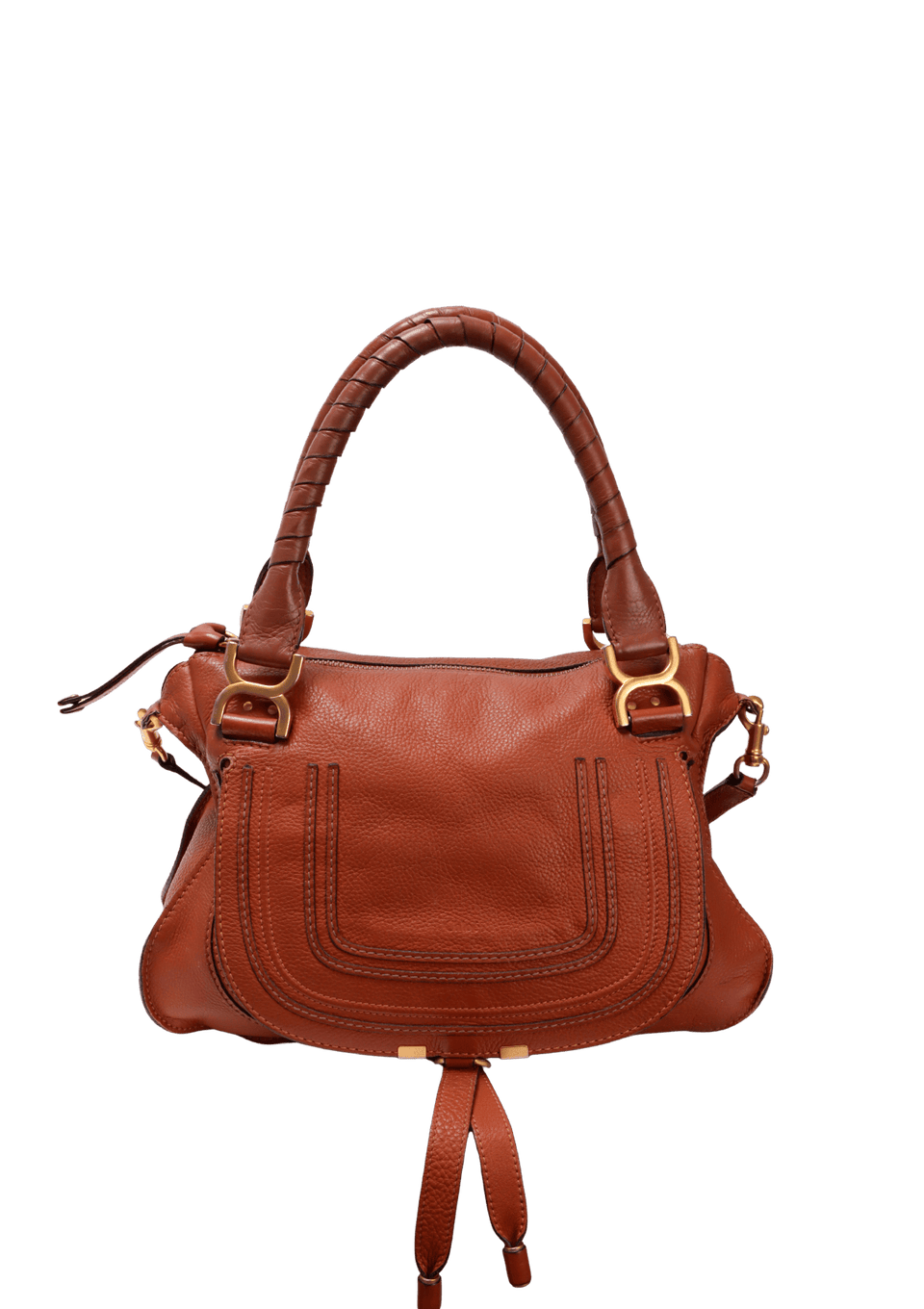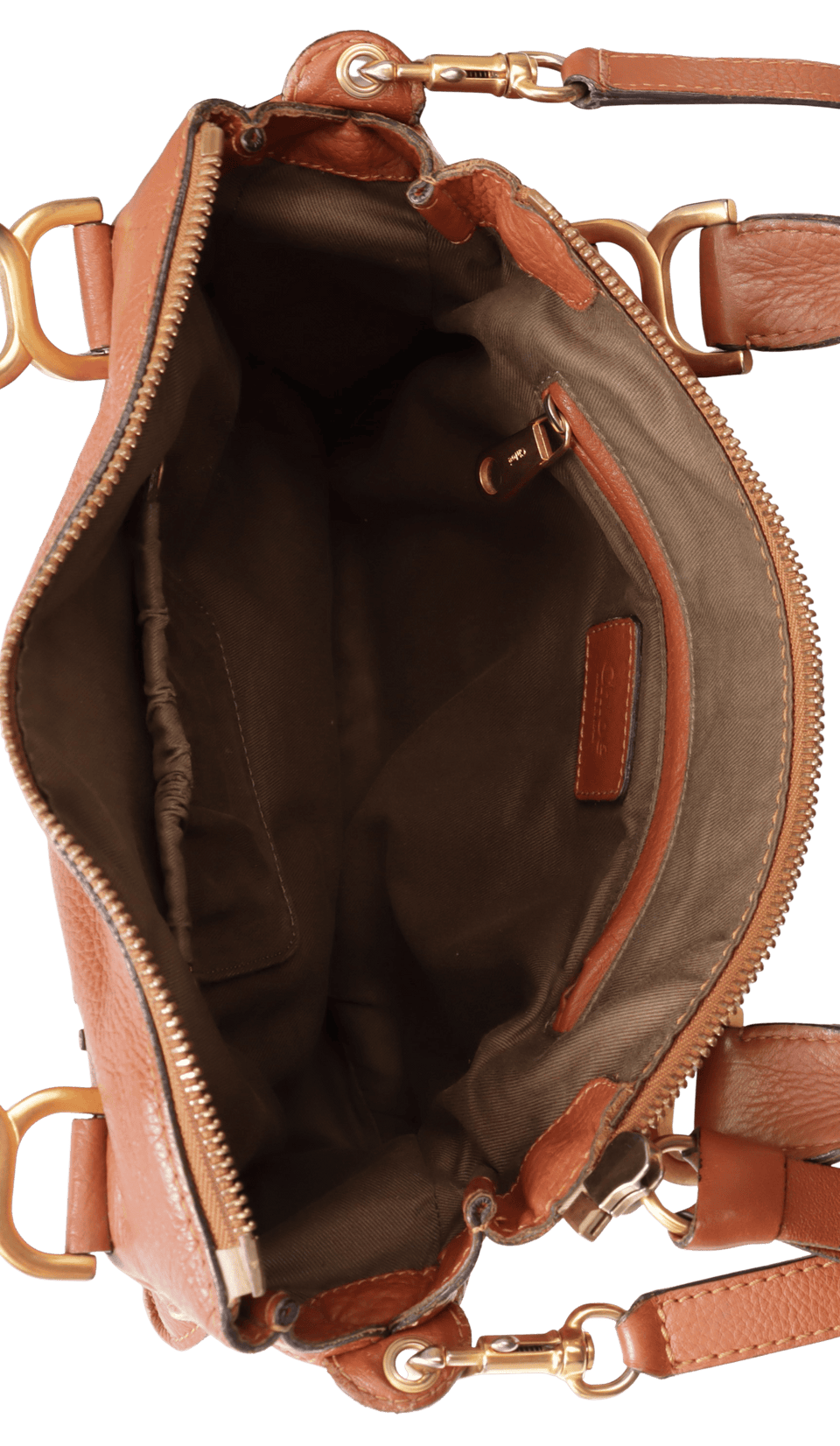 Regular. Apresenta severos desgastes, descolamentos e fissuras por todos os acabamentos, especialmente nos superiores laterais e das alças, notável deformaçāo na estrutura da peça, consideráveis manchas escurecidas e desgastes pelo couro, principalmente na parte frontal superior e nas alças, severas descolorações, marcas de uso e oxidações nas ferragens, couro consideravelmente ressecado e extremamente flácido e notáveis manchas de uso pelo forro.