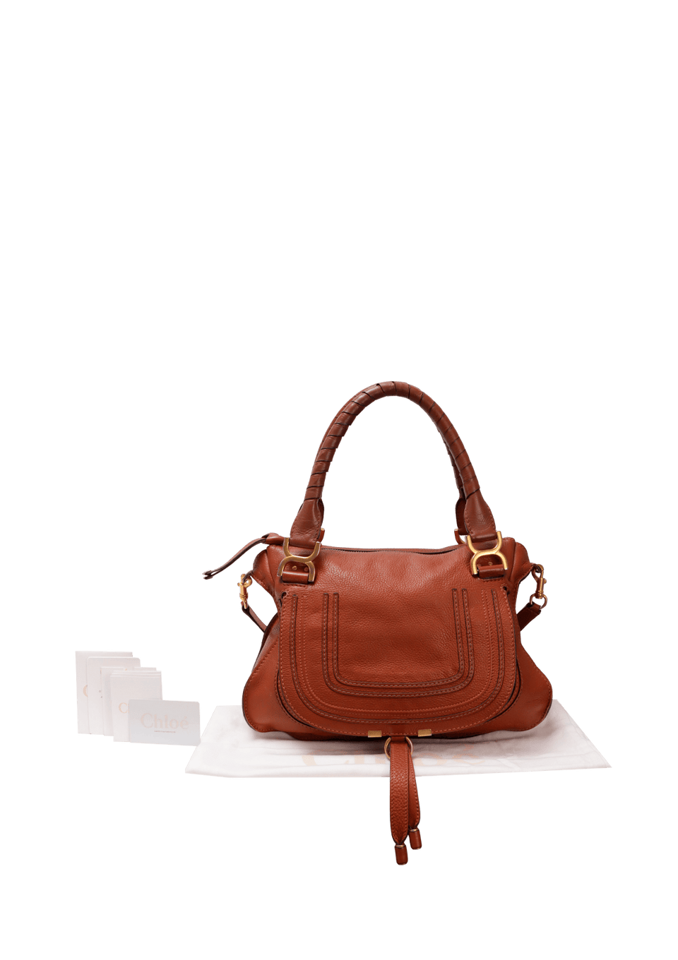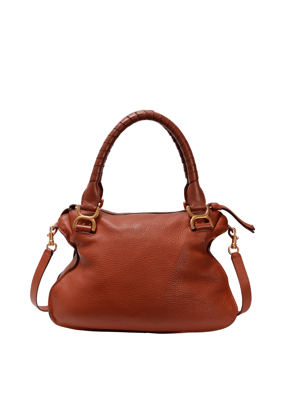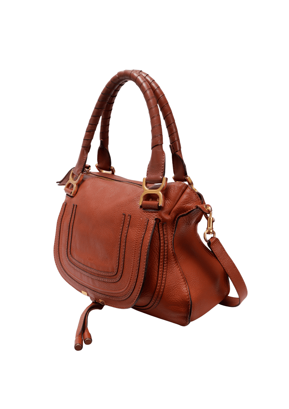 Regular. Apresenta severos desgastes, descolamentos e fissuras por todos os acabamentos, especialmente nos superiores laterais e das alças, notável deformaçāo na estrutura da peça, consideráveis manchas escurecidas e desgastes pelo couro, principalmente na parte frontal superior e nas alças, severas descolorações, marcas de uso e oxidações nas ferragens, couro consideravelmente ressecado e extremamente flácido e notáveis manchas de uso pelo forro.