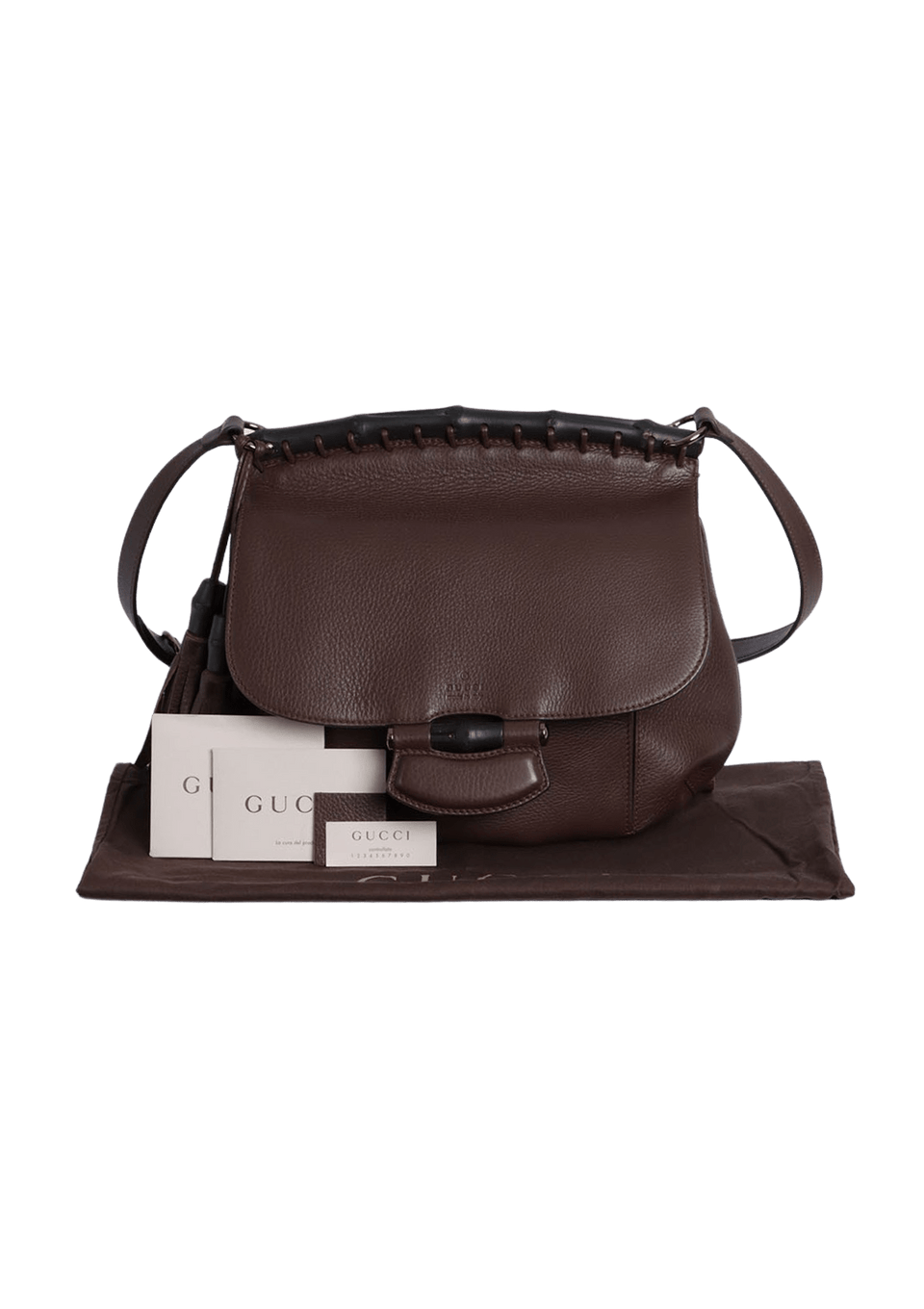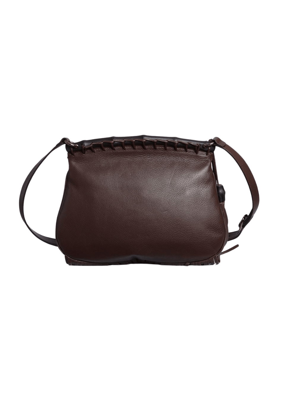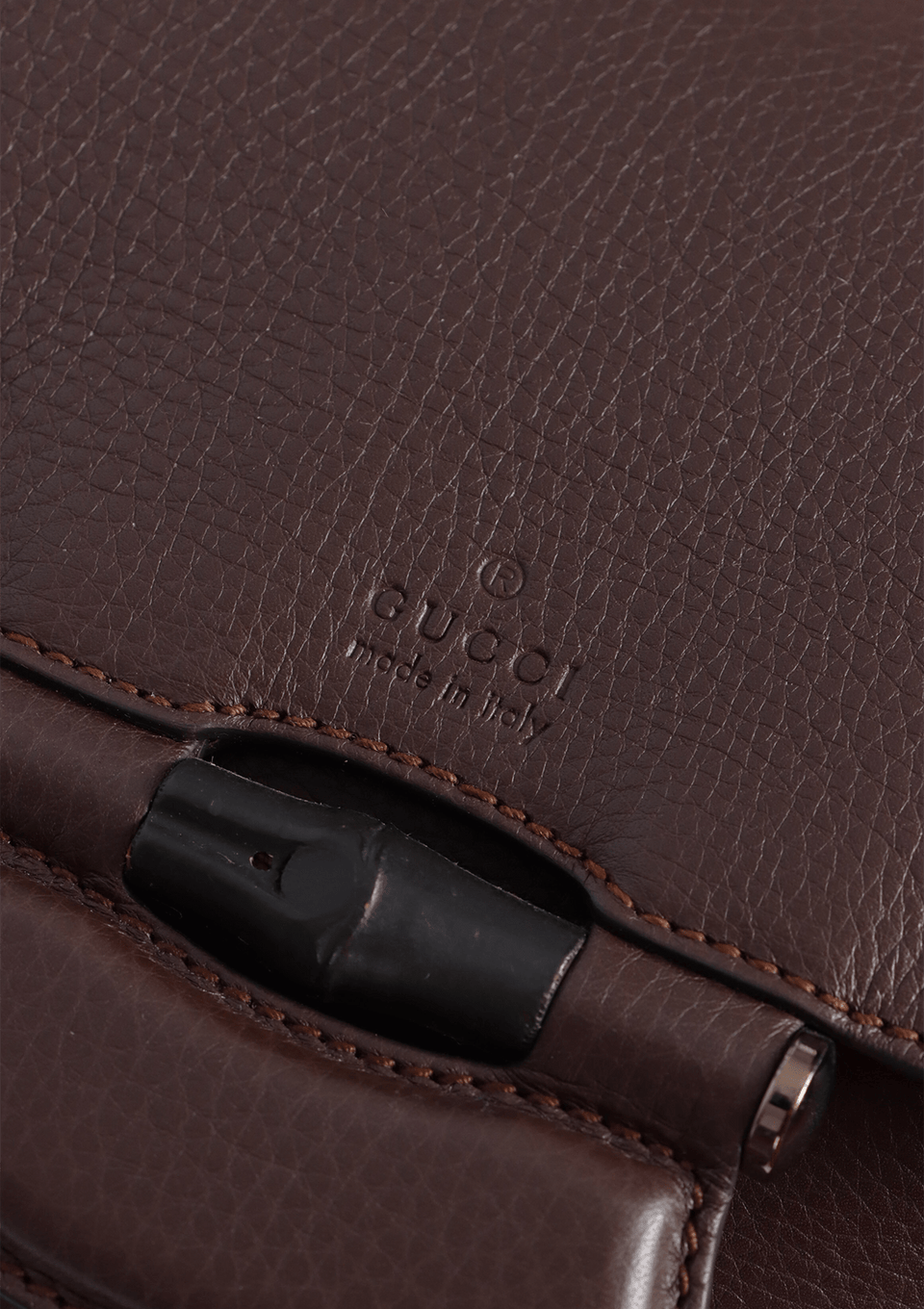 - Couro calfskin marrom e detalhes em bambu marrom;