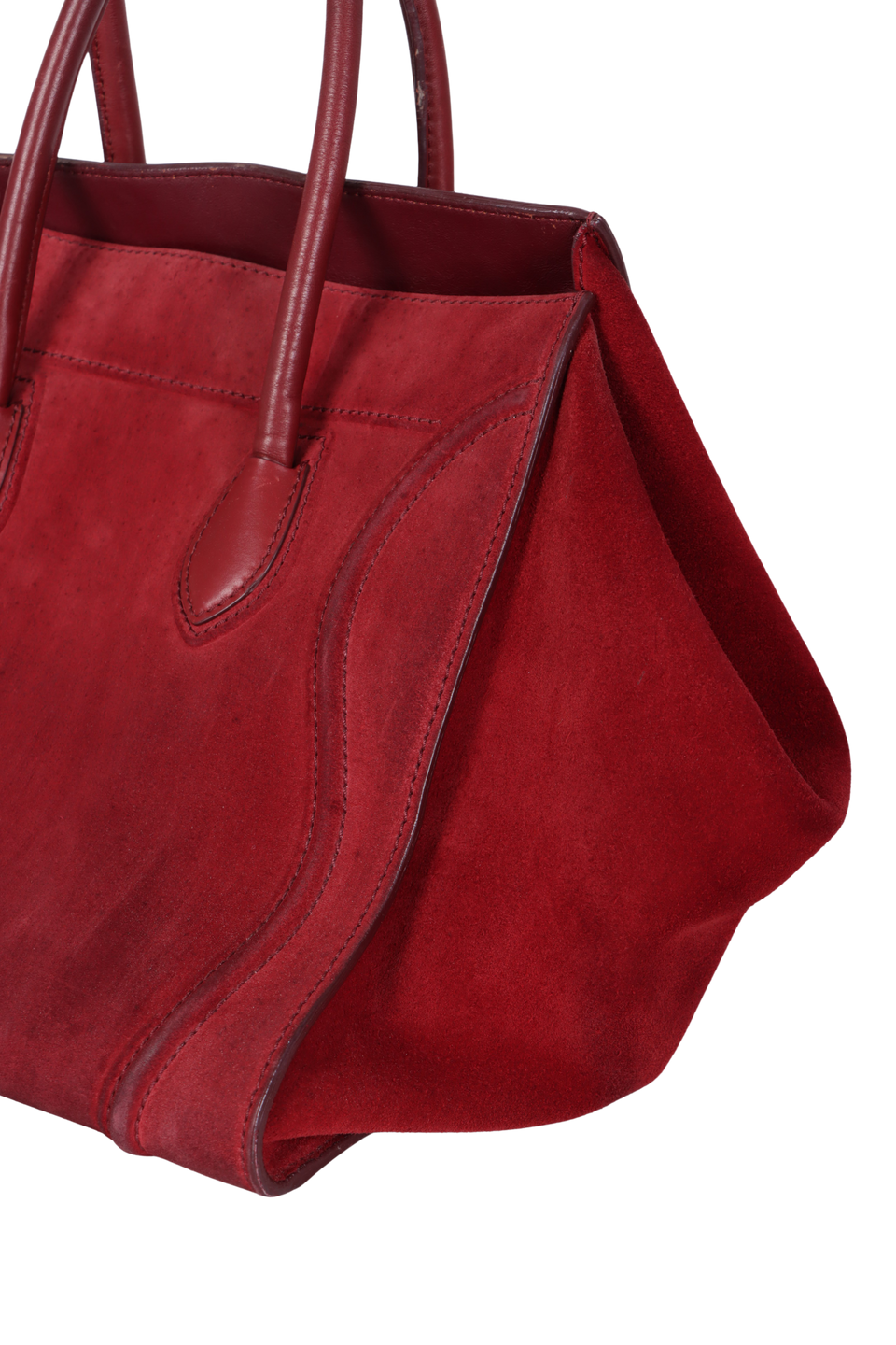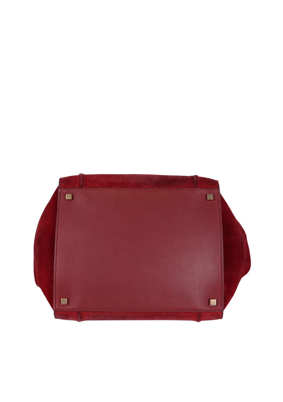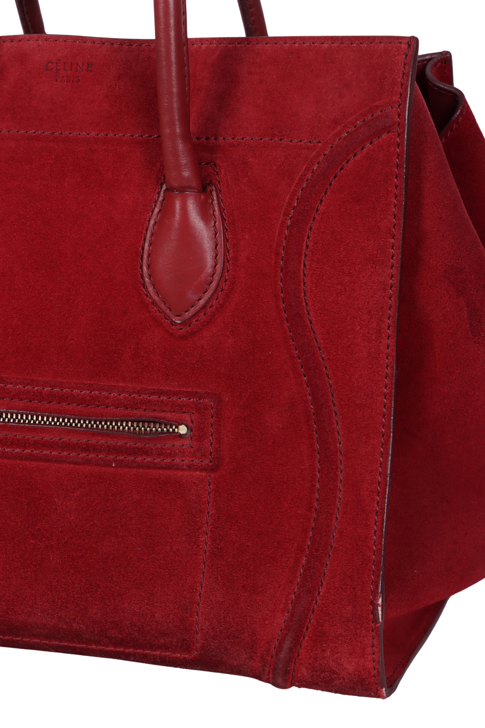 Regular. Apresenta severos desgastes, marcas de uso, manchas escurecidas e de mofo pela camurça, especialmente na parte inferior frontal, nas partes centrais das laterais e na parte superior de trás, consideráveis oxidações e marcas de uso nas ferragens dos puxadores dos cursores e no fecho, notáveis deformidades pela estrutura, principalmente no canto inferior direito frontal e nas partes inferiores laterais, severas fissuras, aberturas e desgastes nas selagens, especialmente nas alças, nas extremidades superiores e cantos da base, consideráveis desgastes, manchas e marcas de uso nos detalhes em couro das alças e na base e notáveis manchas e marcas de uso pelo couro interno.