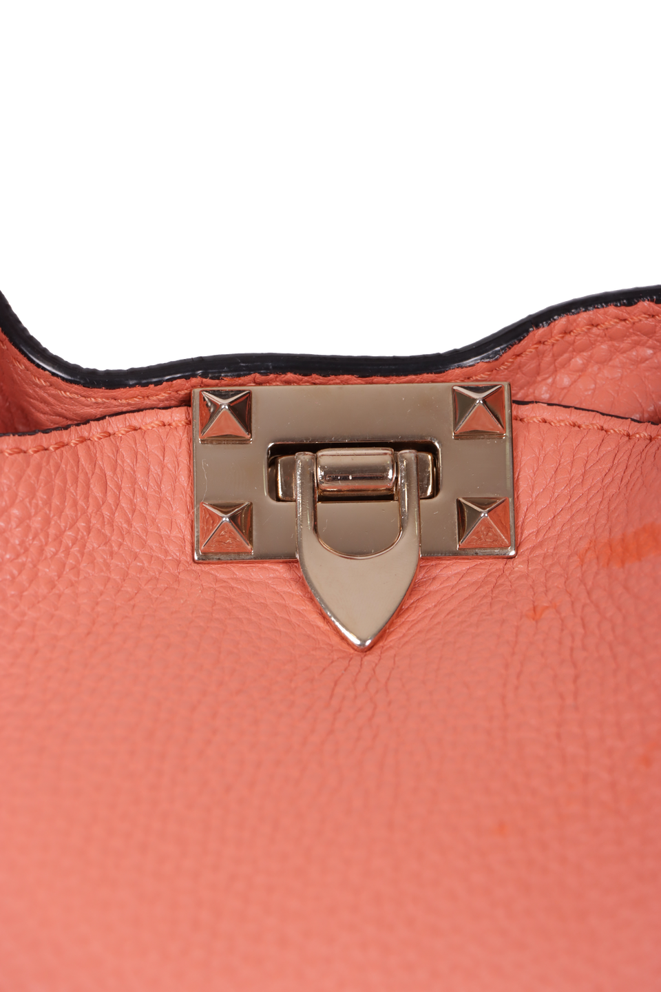 Bom, com aparência de usado. Apresenta leves manchas e desgastes pelo couro, especialmente na parte superior central frontal, cantos da base e na parte superior da lateral esquerda, pequenas marcas de uso nas ferragens do fecho e pelos spikes ao redor da bolsa, pequenas fissuras nas selagens superiores e das alças e leves puídos e manchas escurecidas pelo forro.